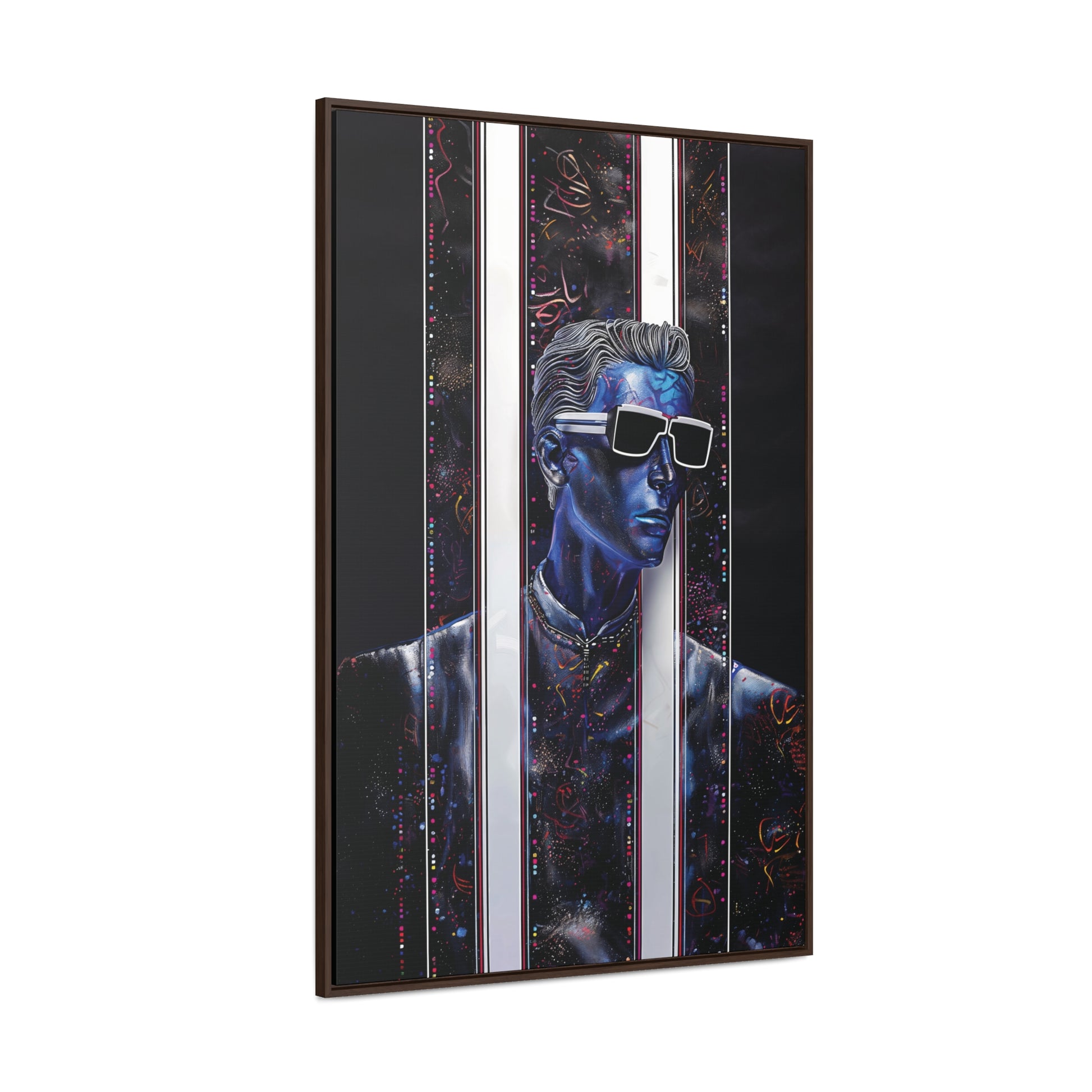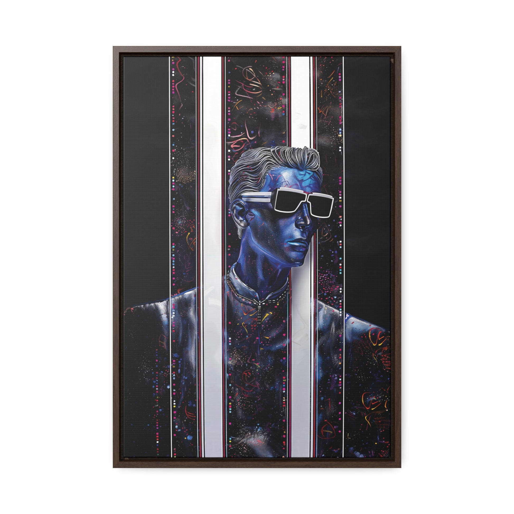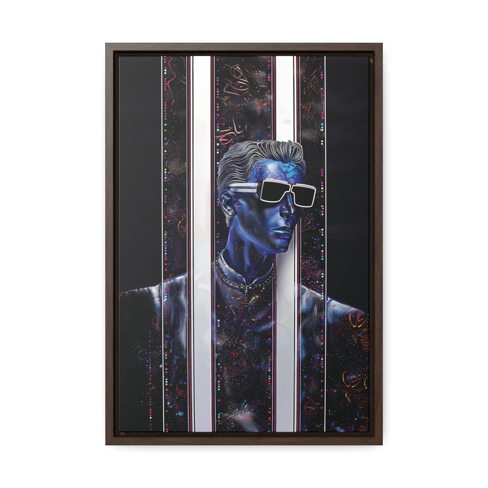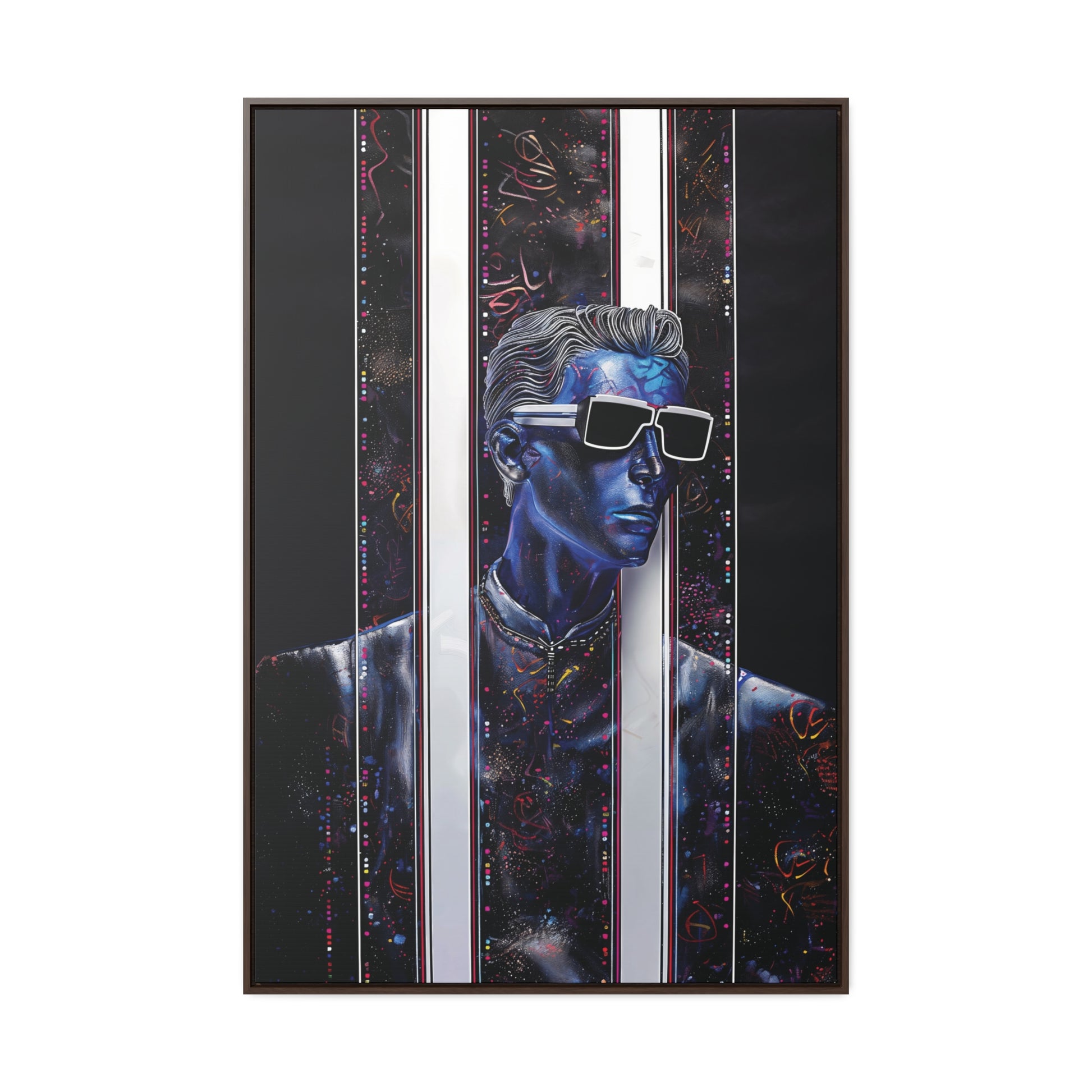 Elevate your space with "Peek-a-Bluesy," a futuristic piece of modern art that captures the essence of contemporary sophistication. This artwork features a striking blue portrait interwoven with abstract patterns and vibrant hues mimicking metallic colors. The composition symbolizes a peek into a dynamic digital world, making it a captivating addition to any room.