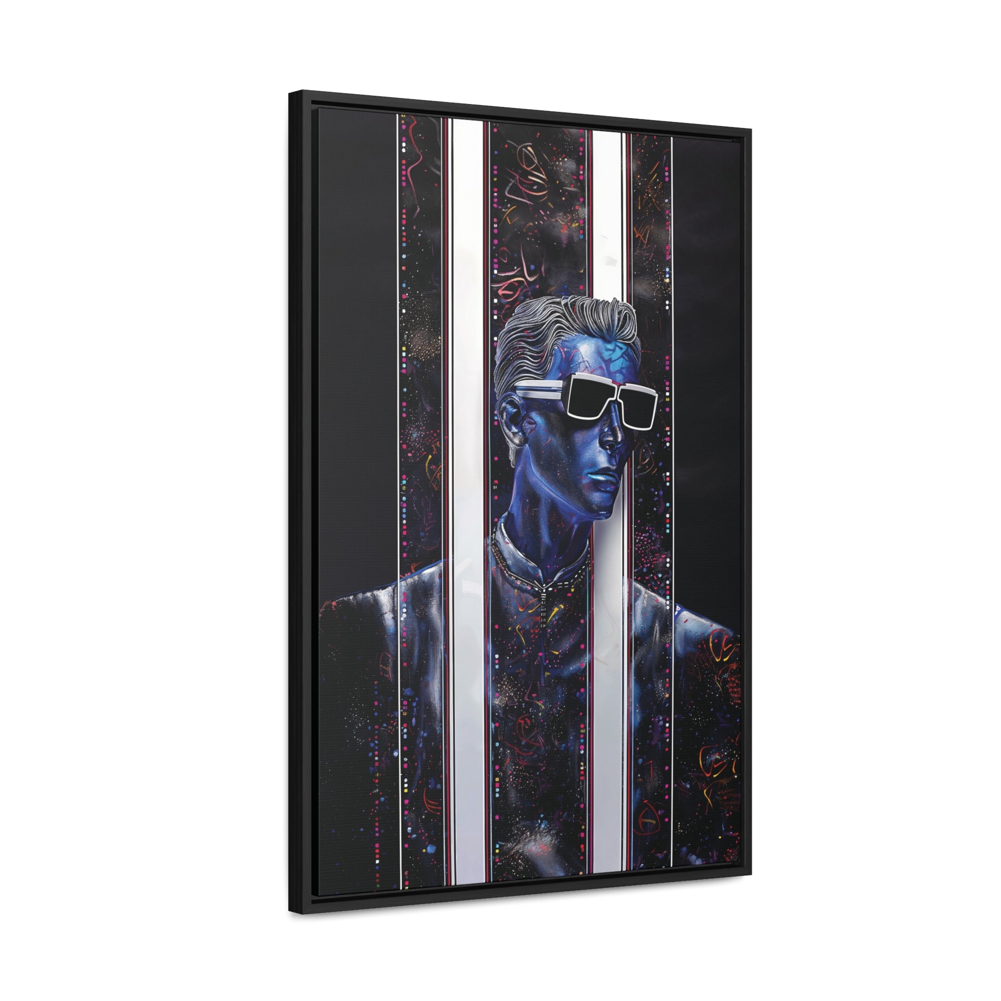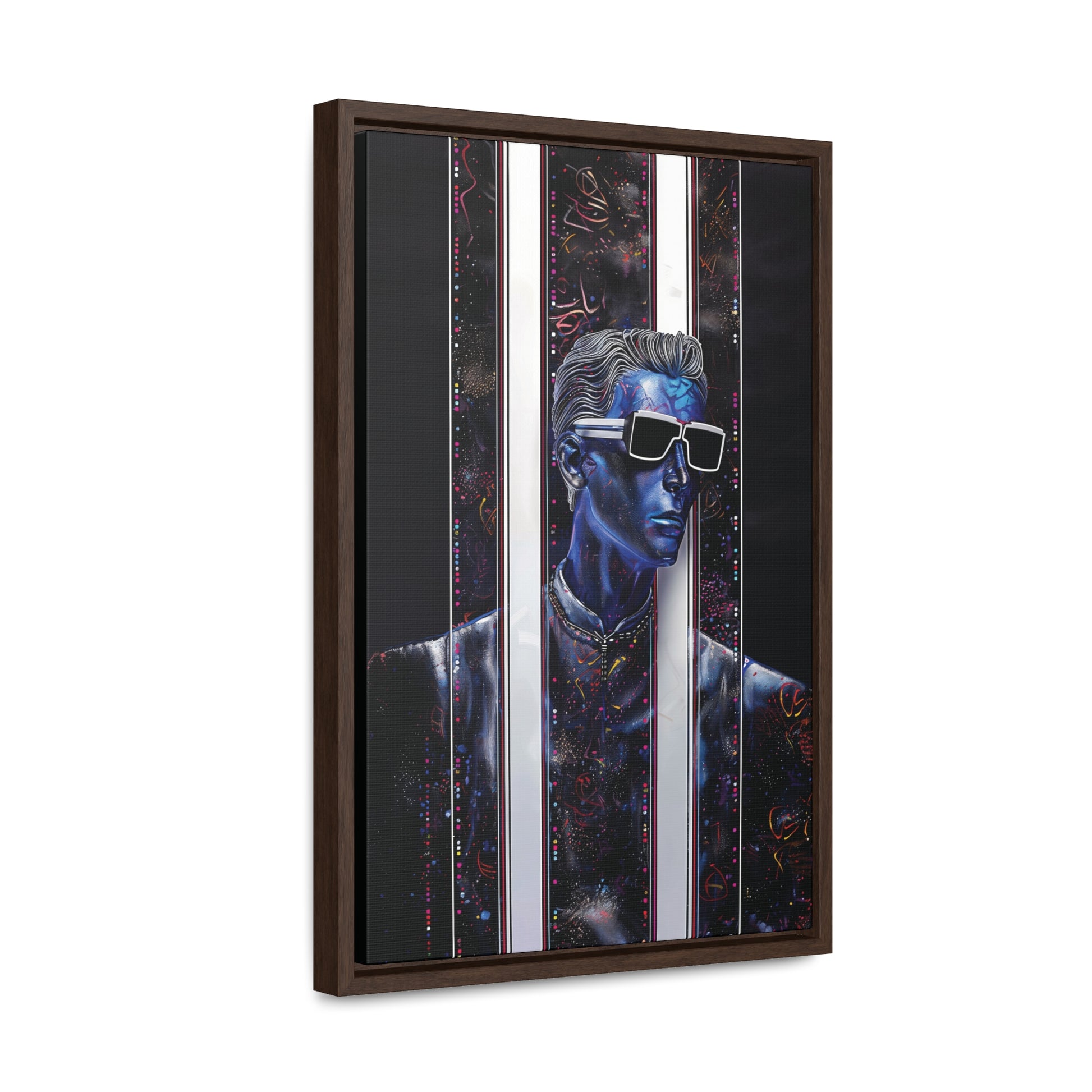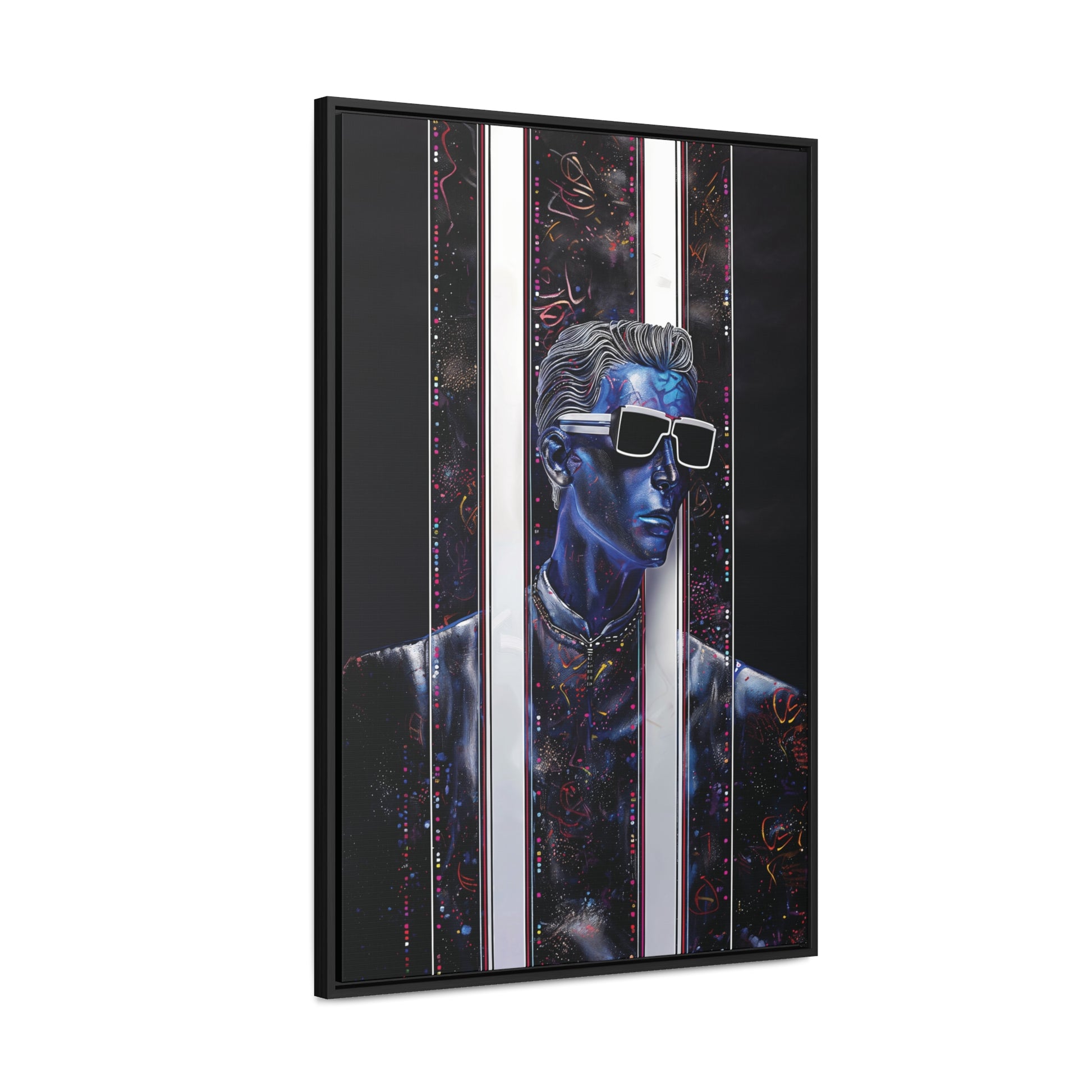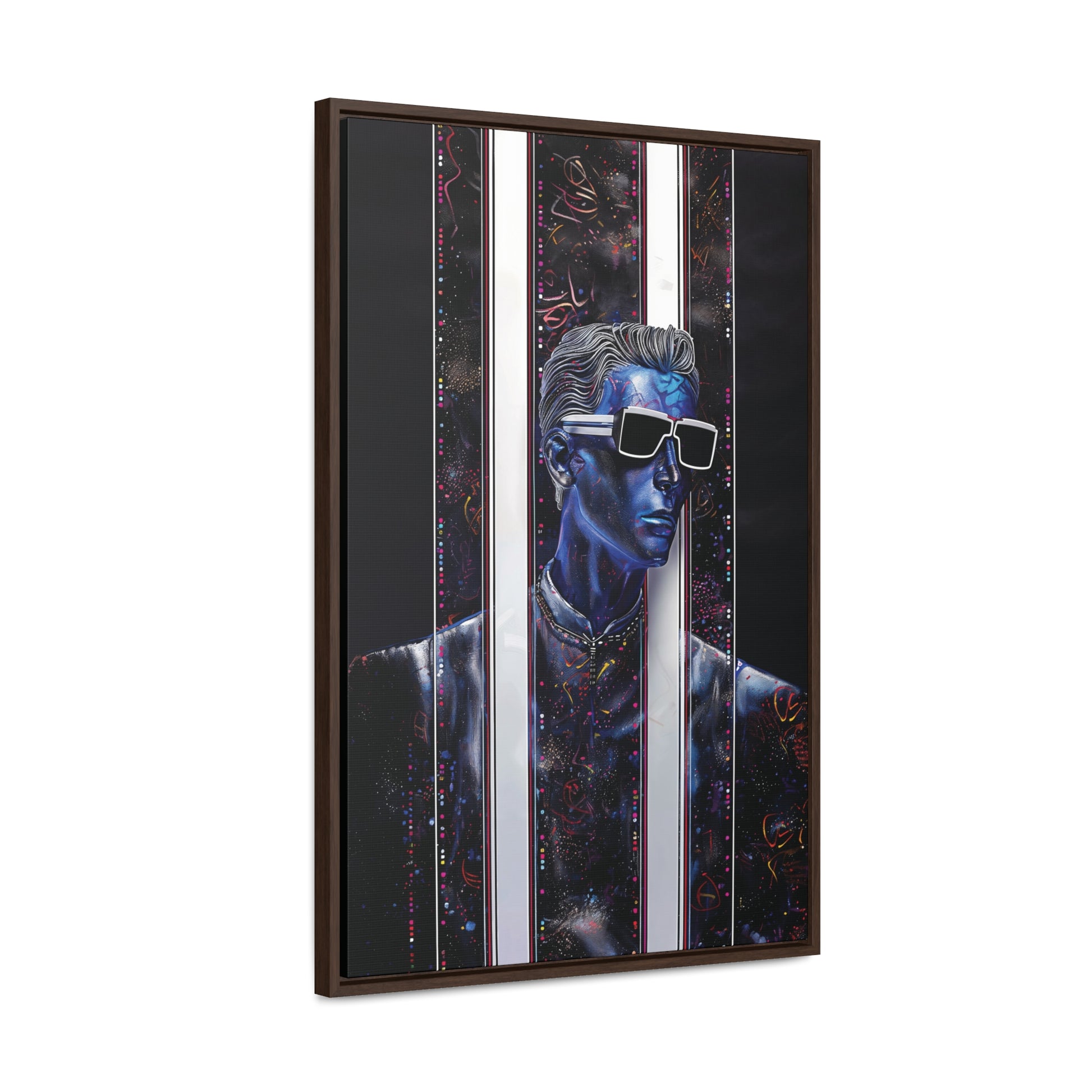 Elevate your space with "Peek-a-Bluesy," a futuristic piece of modern art that captures the essence of contemporary sophistication. This artwork features a striking blue portrait interwoven with abstract patterns and vibrant hues mimicking metallic colors. The composition symbolizes a peek into a dynamic digital world, making it a captivating addition to any room.