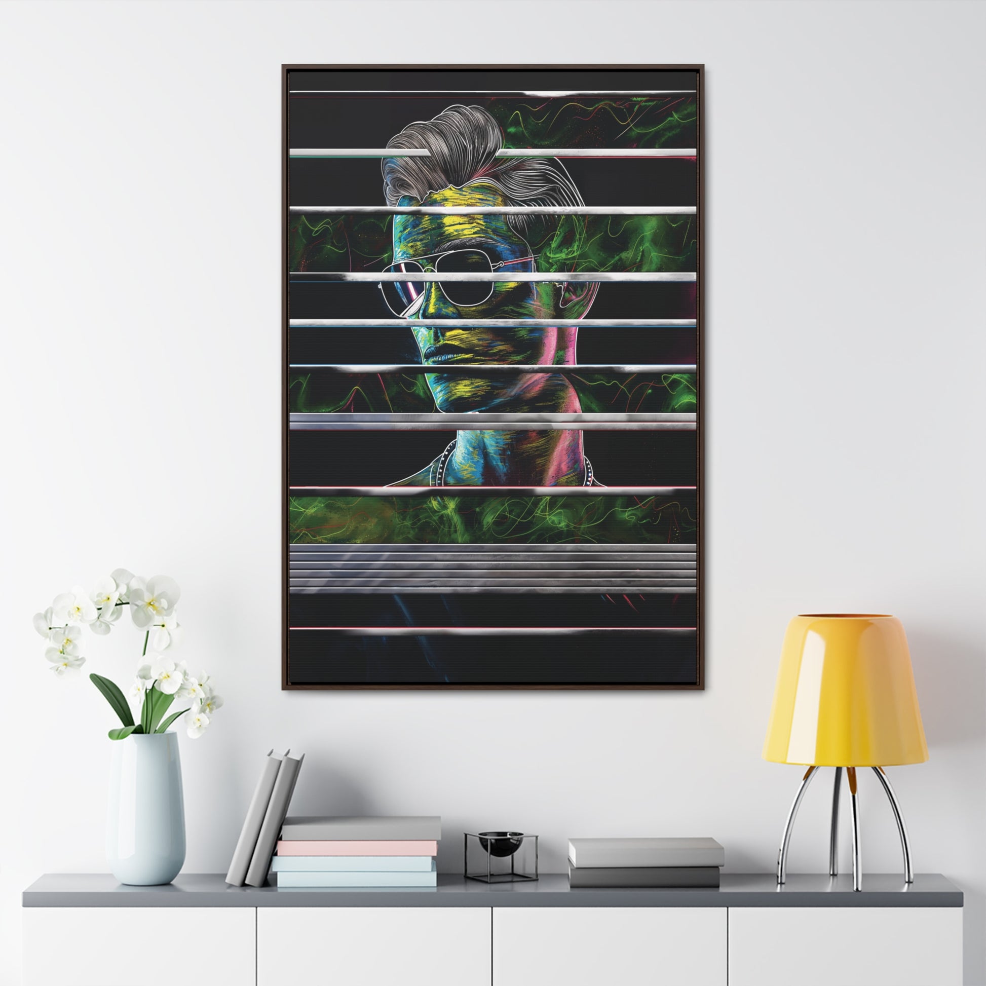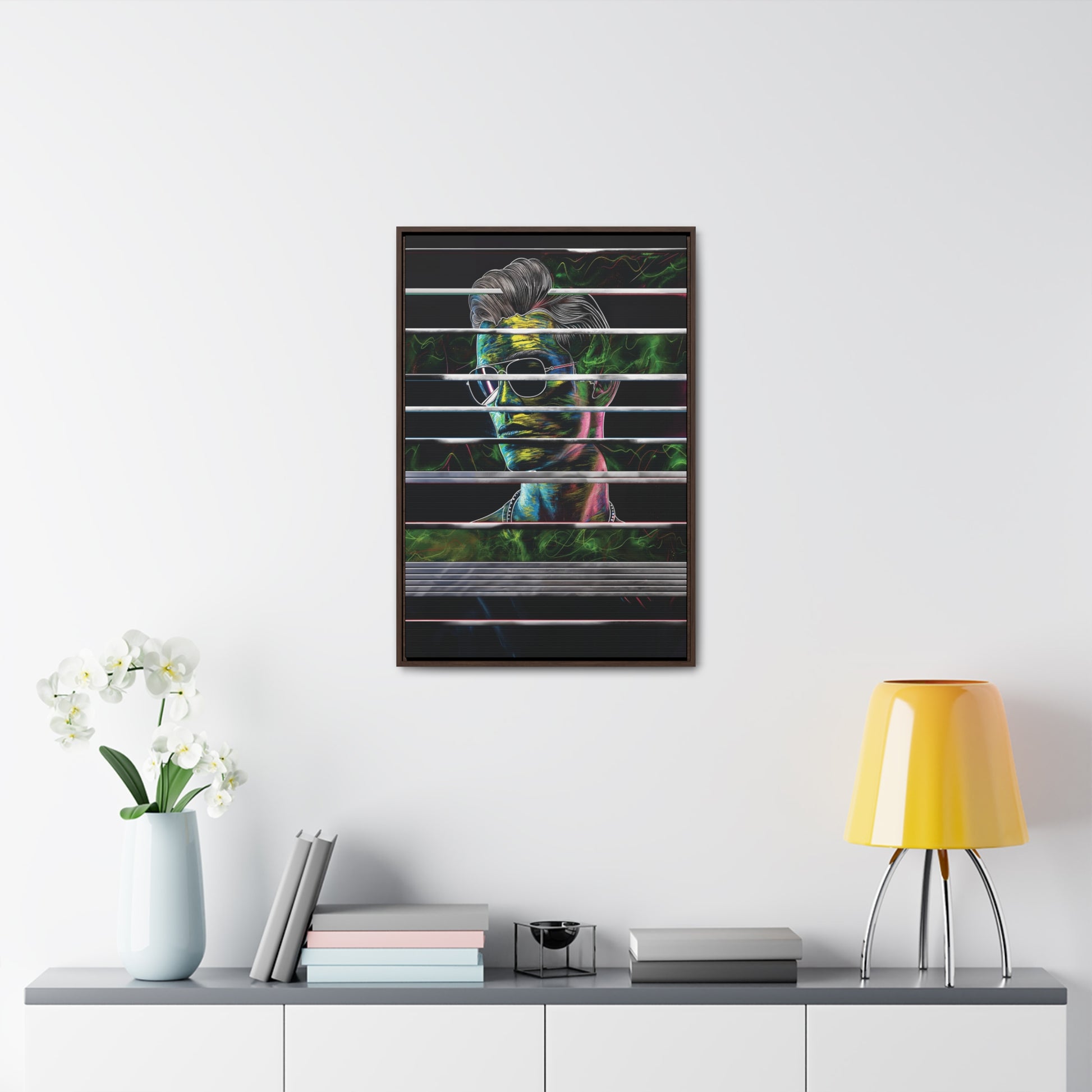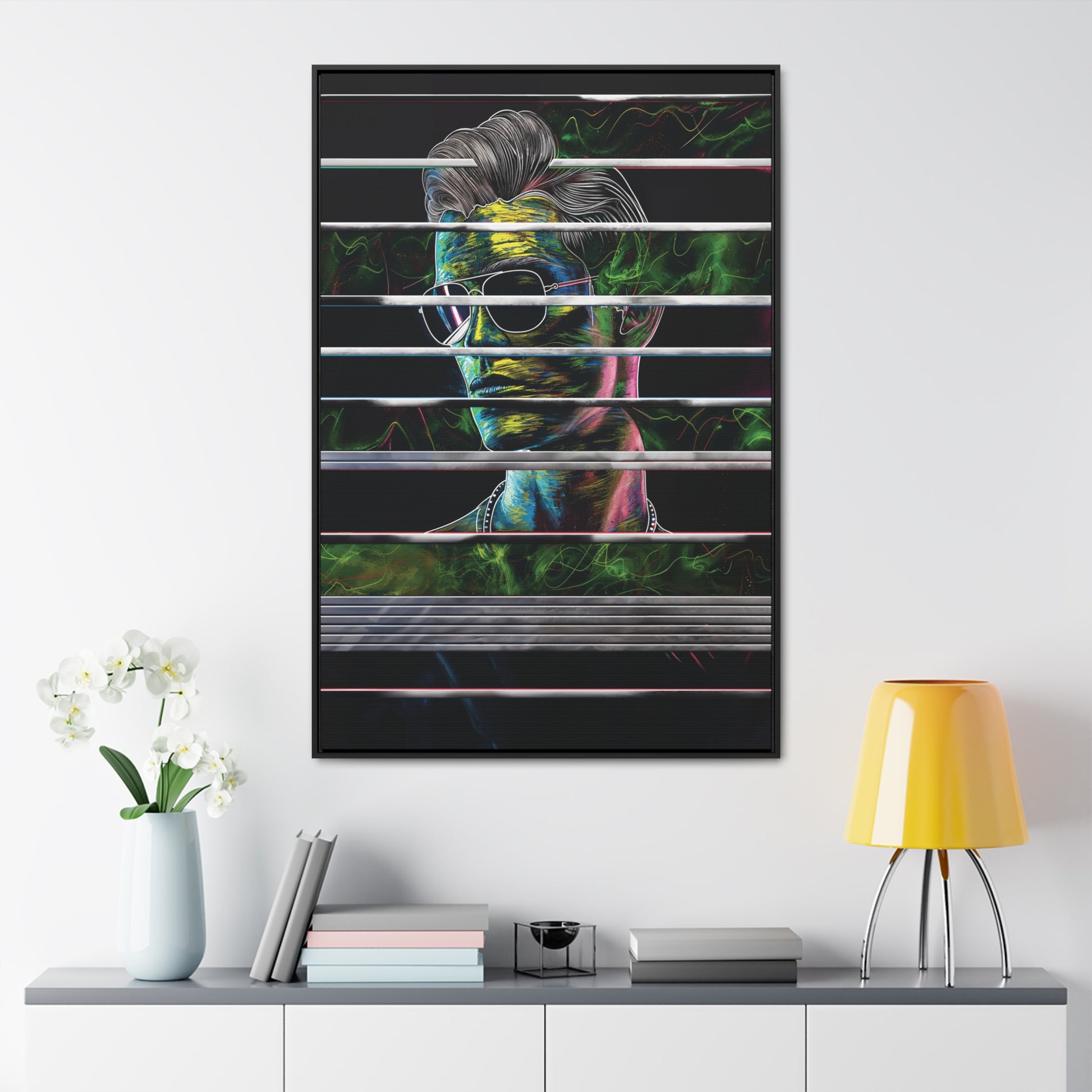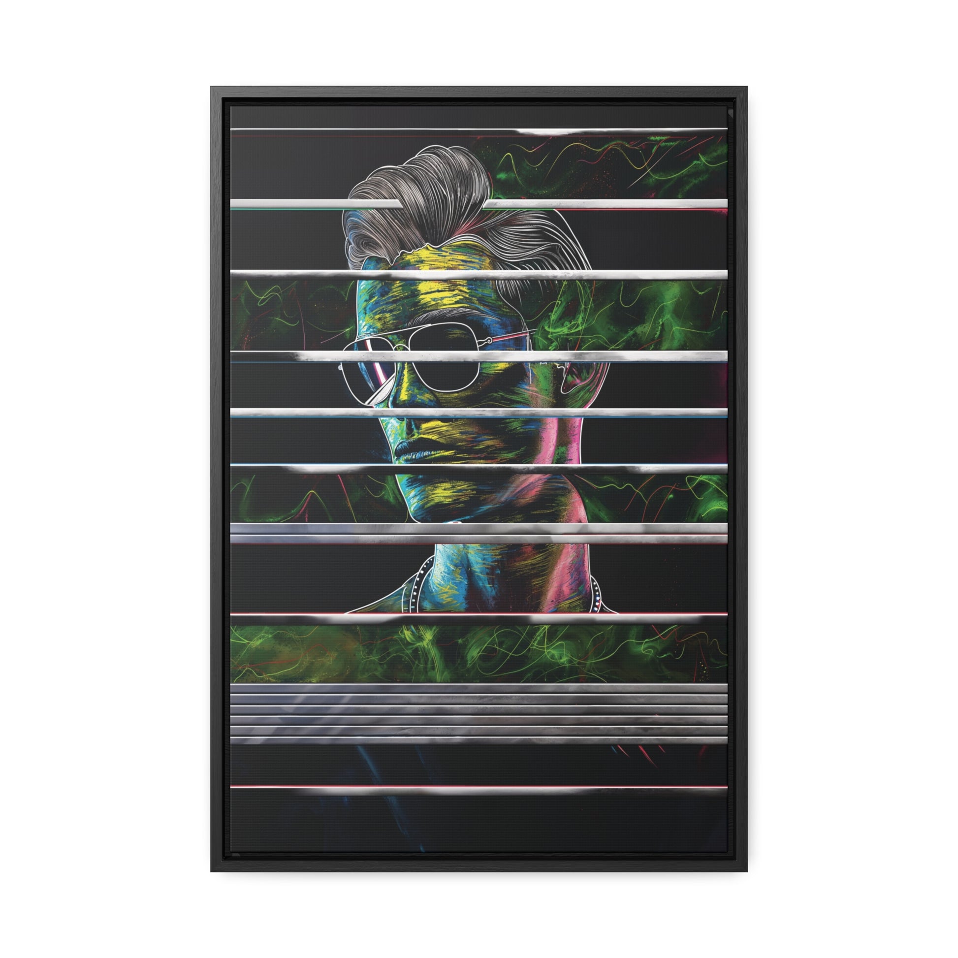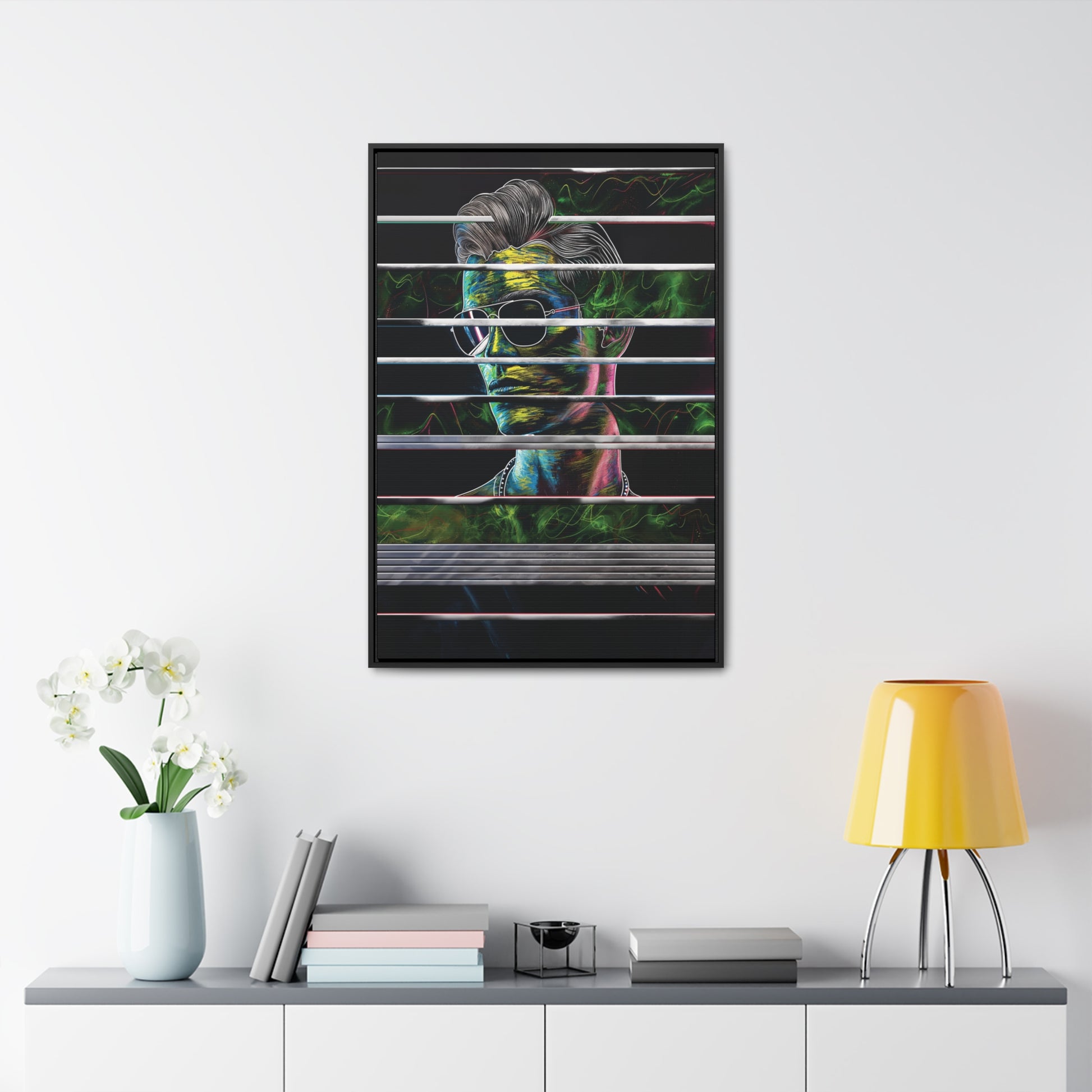 Infuse your space with the vibrant energy of "Geenon Haze," a modern art piece that exudes style and intrigue. This striking artwork features a portrait interwoven with linear patterns and vivid greens and hues mimicking metallic colors. The composition captures a sense of movement and mystery, making it a standout addition to any room.