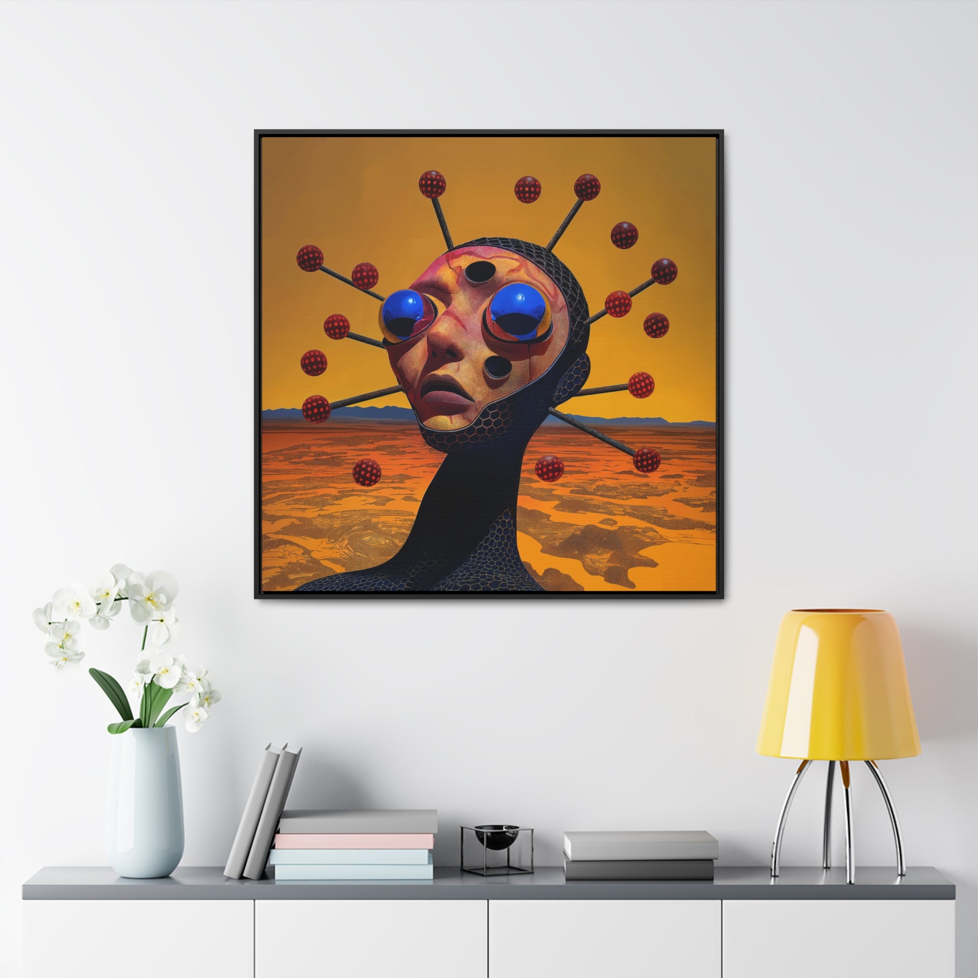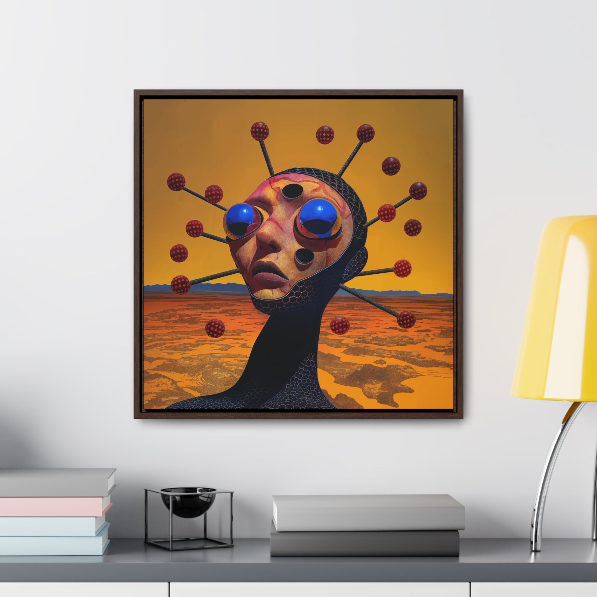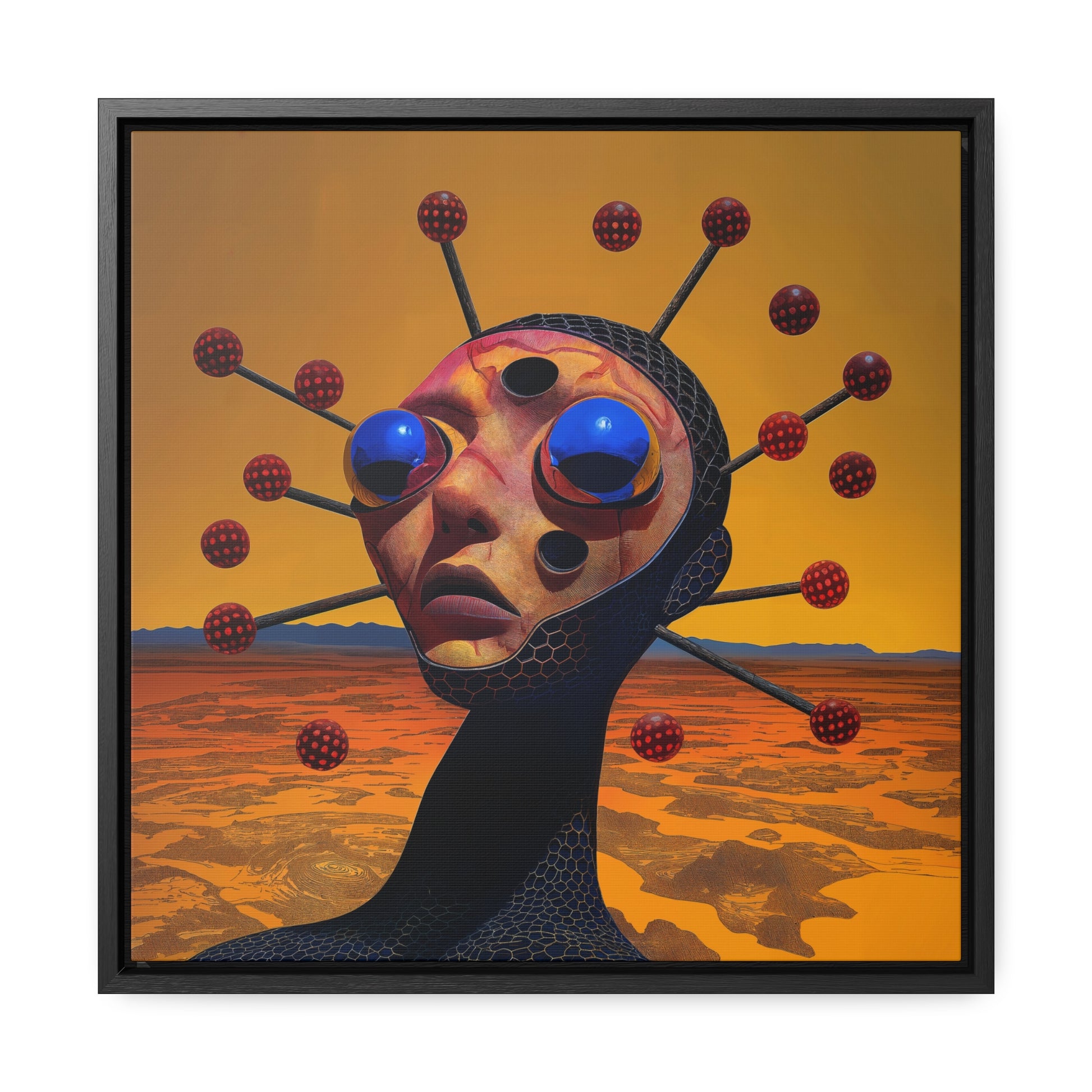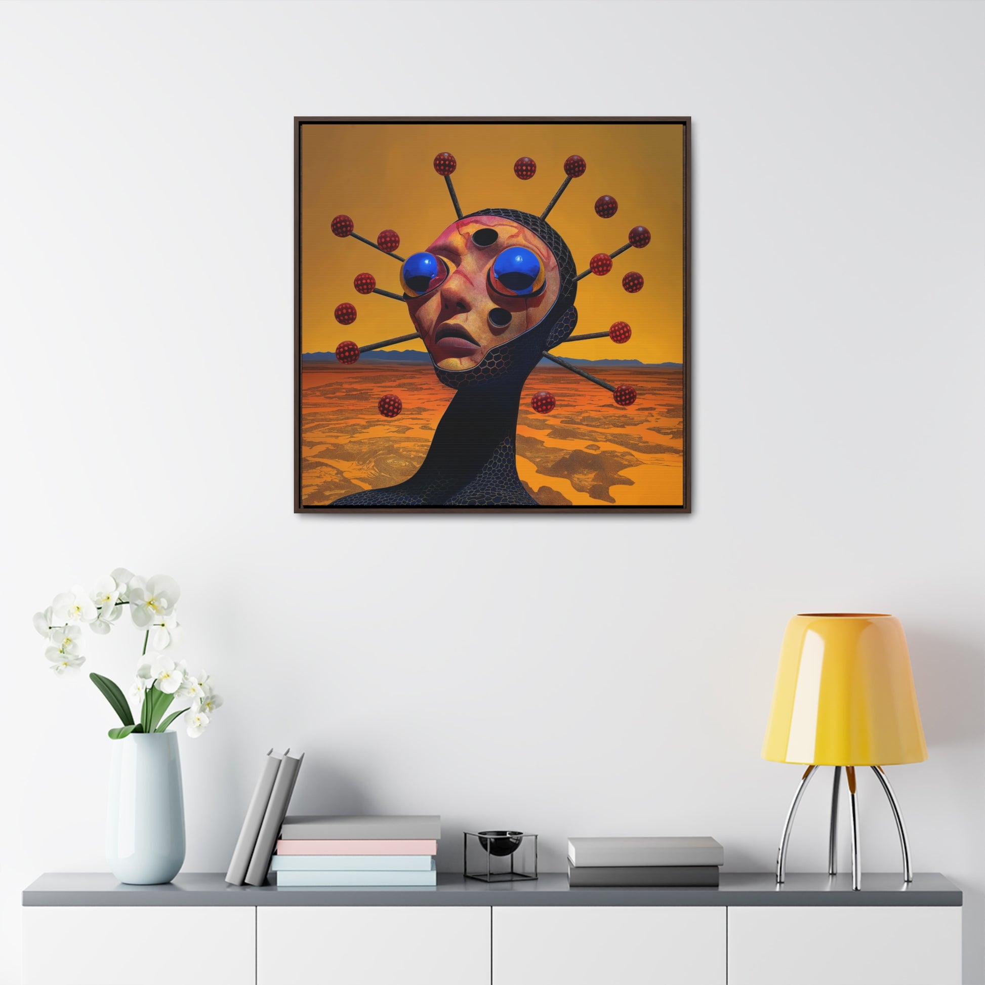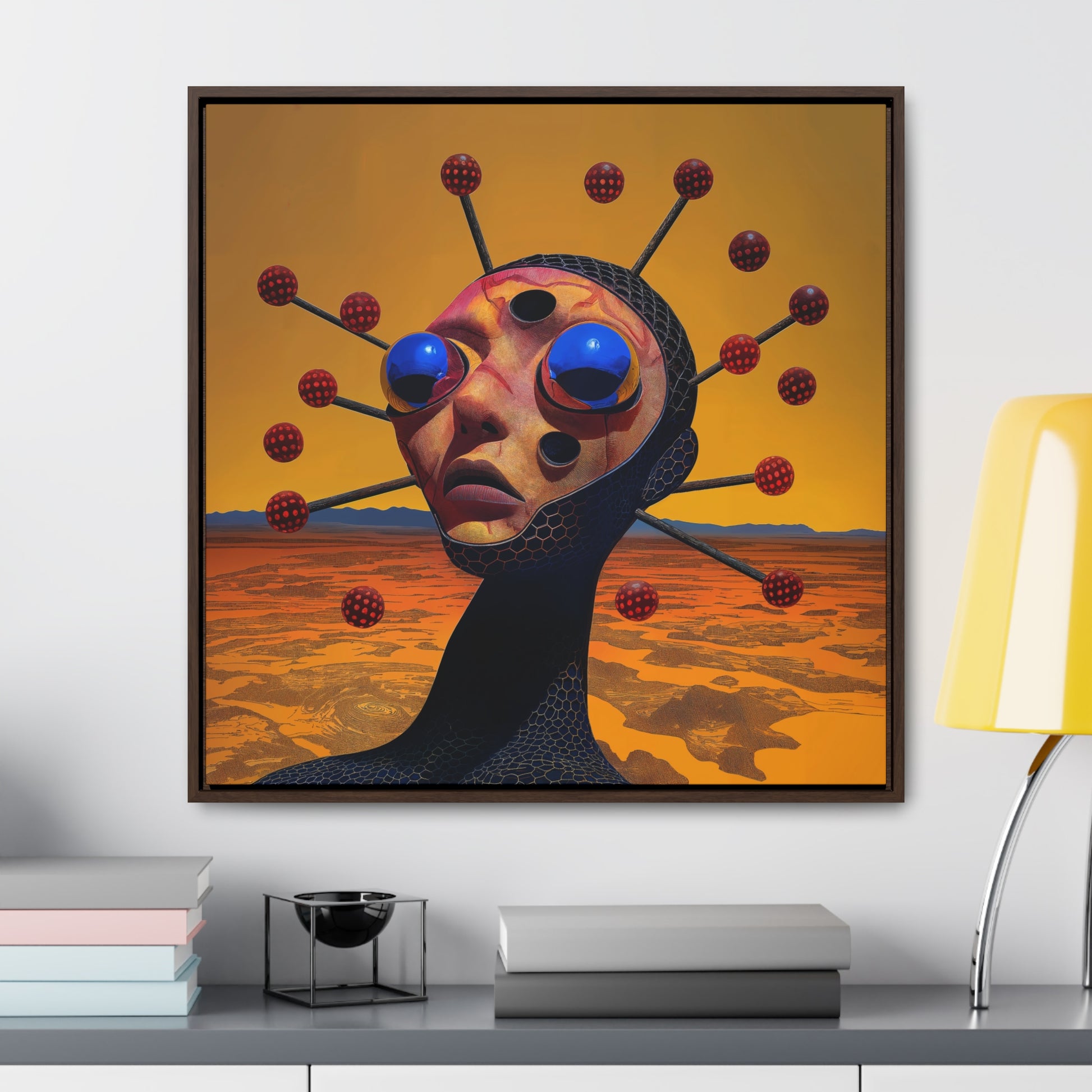 Bluegy One" is a striking piece of futuristic sci-fi art that transports the viewer to a surreal and otherworldly landscape. The artwork features a humanoid figure with a distinctive, textured surface and bright blue eyes that seem to pierce through the canvas. The head is adorned with spherical red protrusions, adding an element of intrigue and complexity. Set against a vibrant orange backdrop, the figure stands out, making this piece a bold statement for any modern decor.