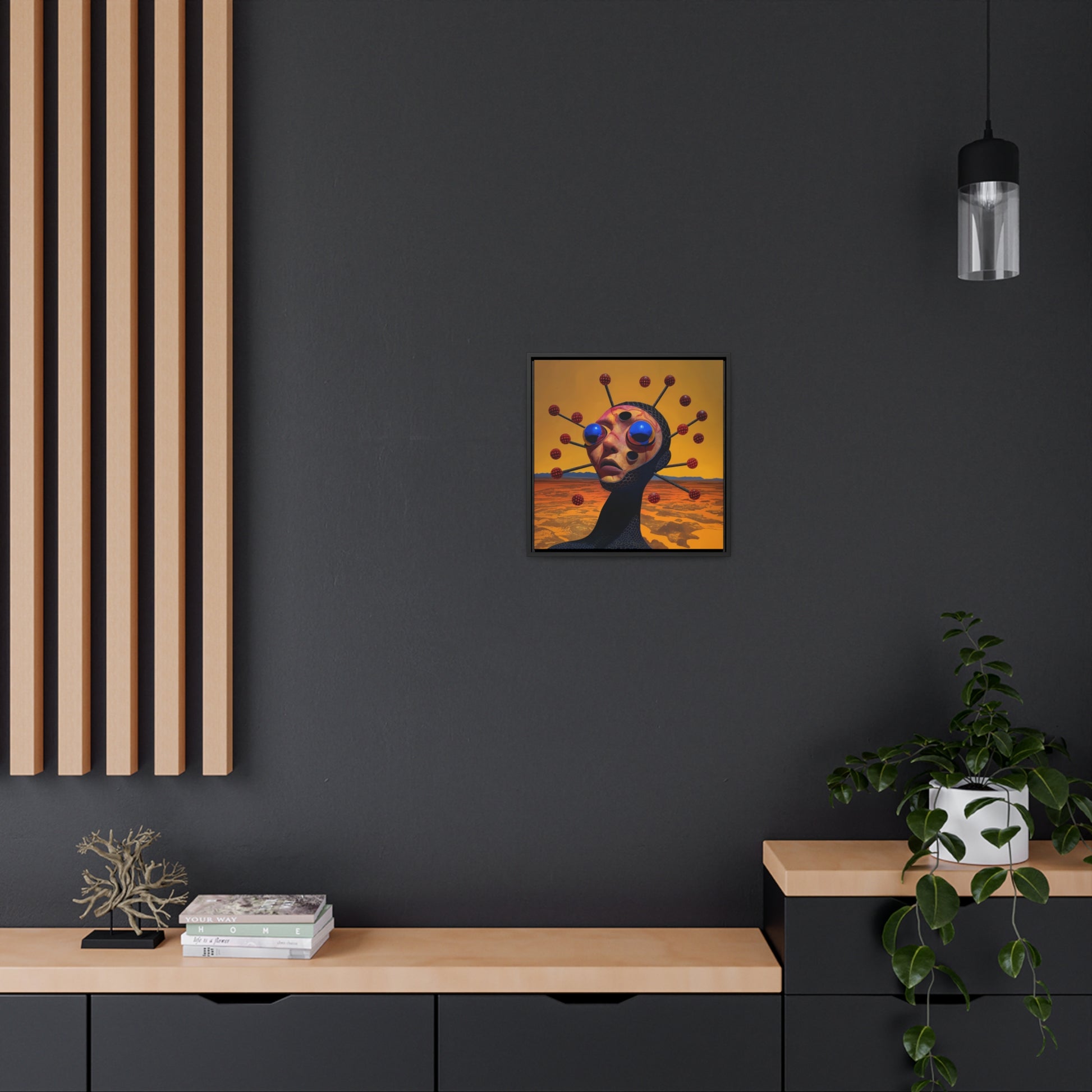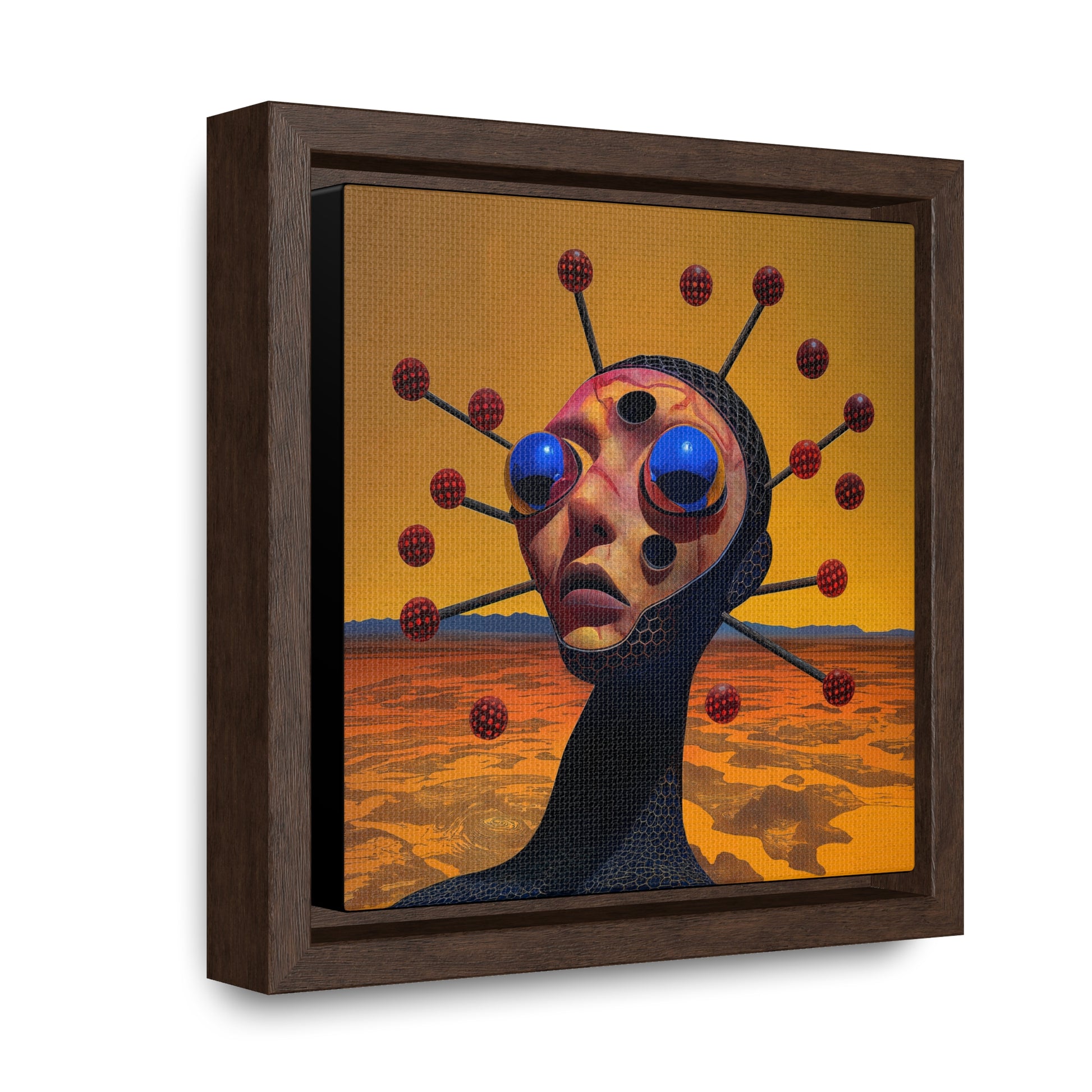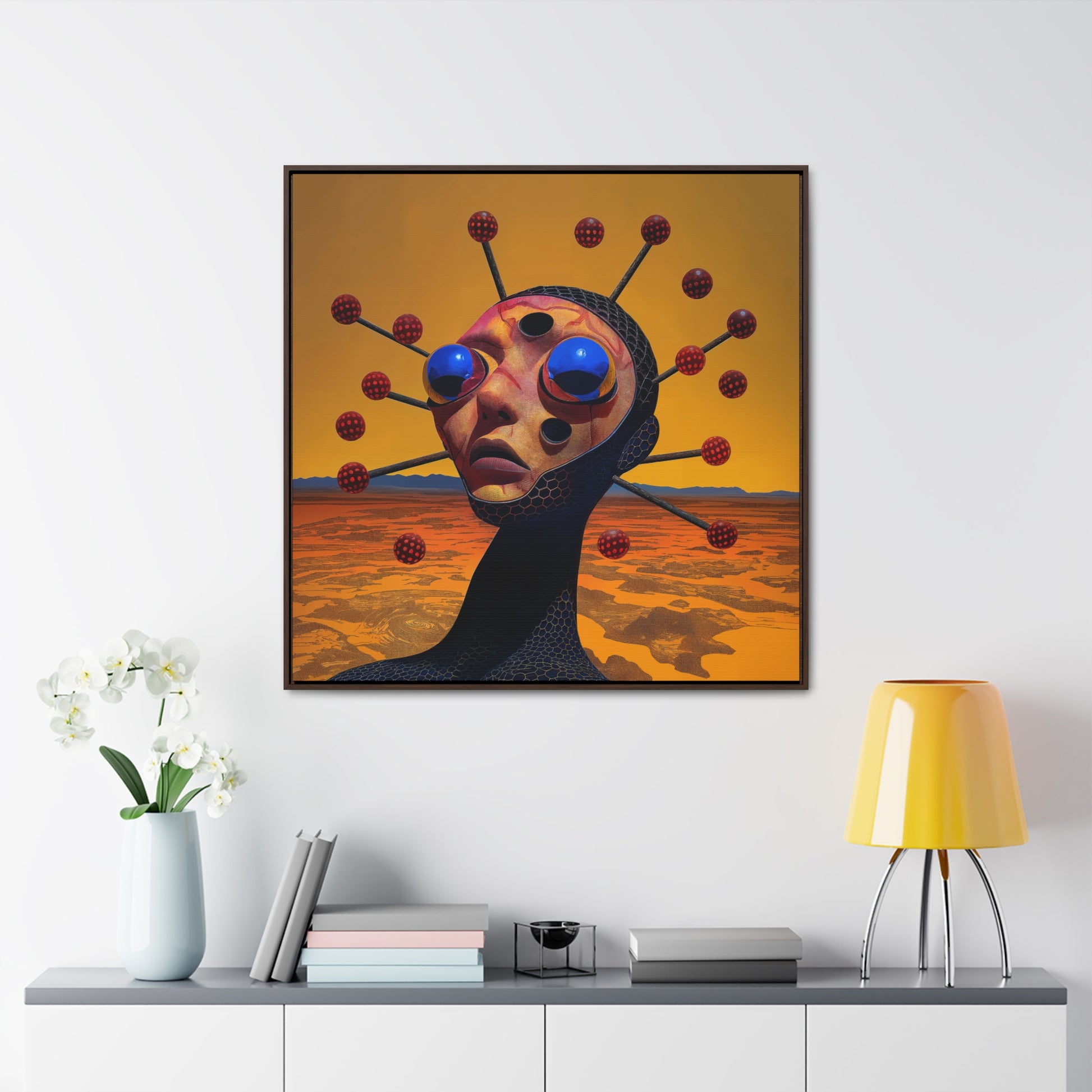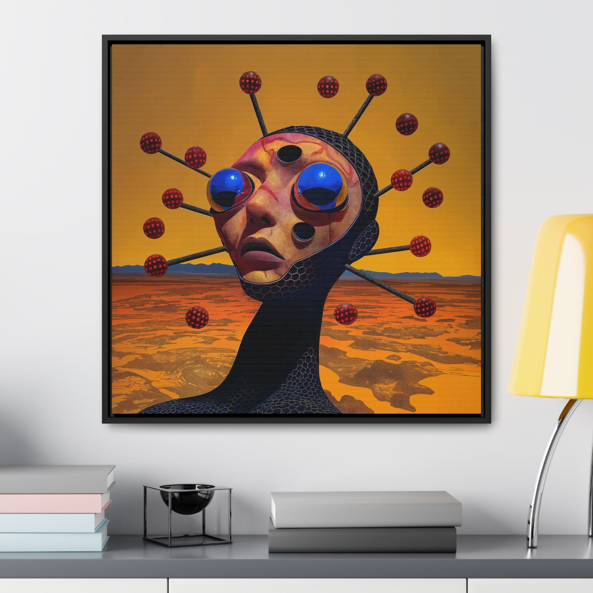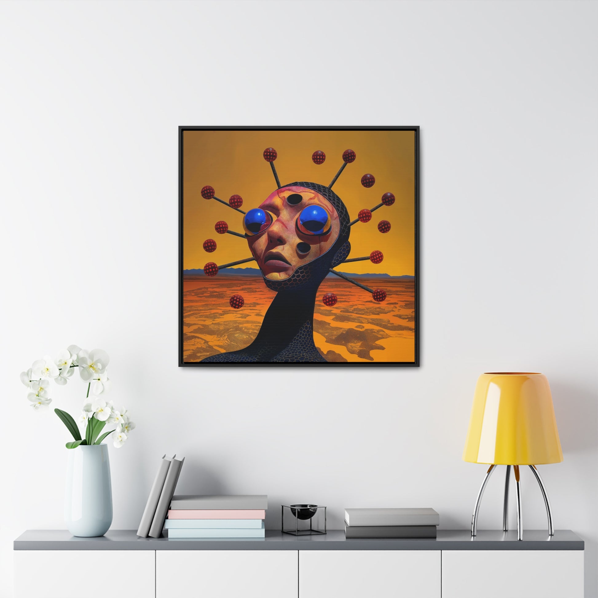 Bluegy One" is a striking piece of futuristic sci-fi art that transports the viewer to a surreal and otherworldly landscape. The artwork features a humanoid figure with a distinctive, textured surface and bright blue eyes that seem to pierce through the canvas. The head is adorned with spherical red protrusions, adding an element of intrigue and complexity. Set against a vibrant orange backdrop, the figure stands out, making this piece a bold statement for any modern decor.