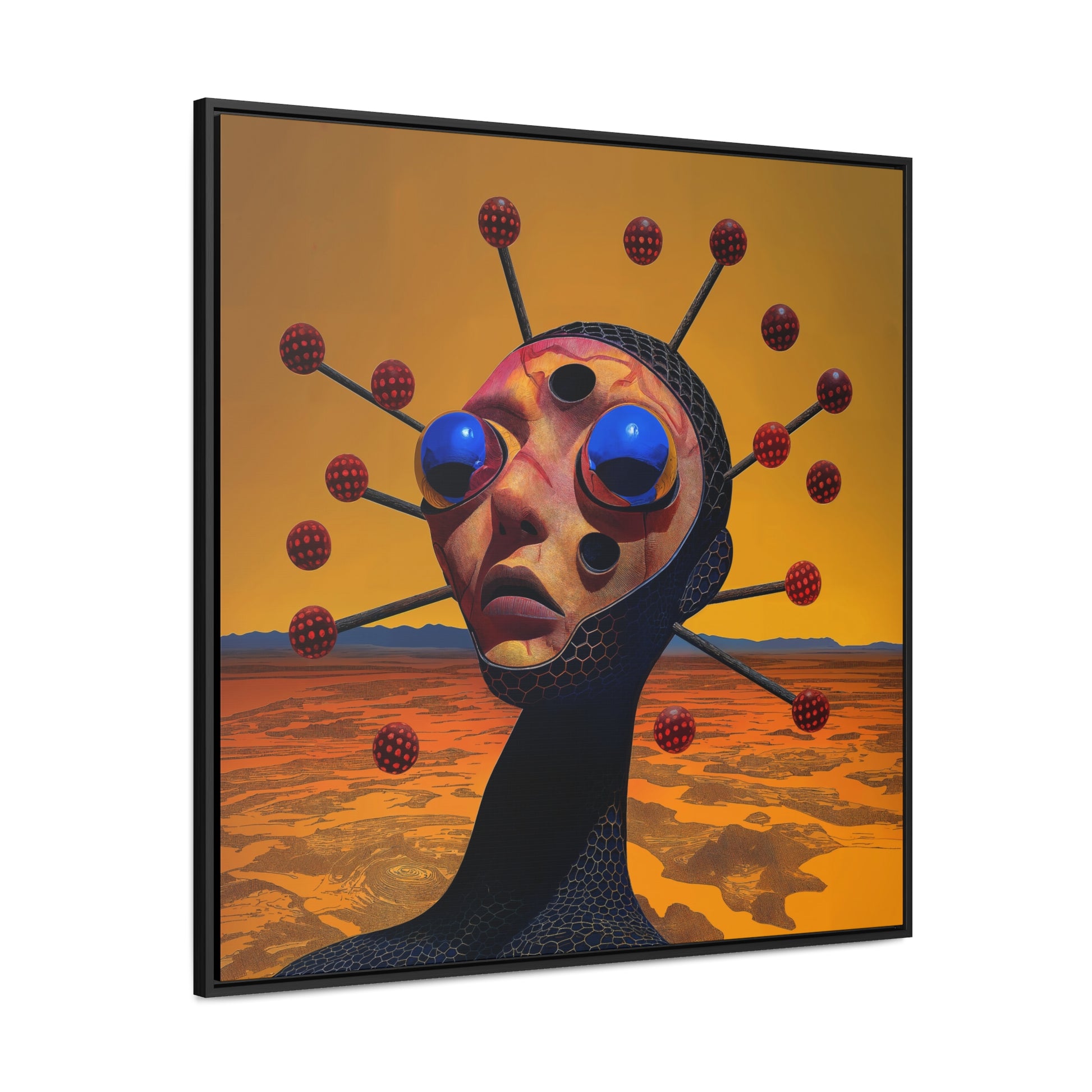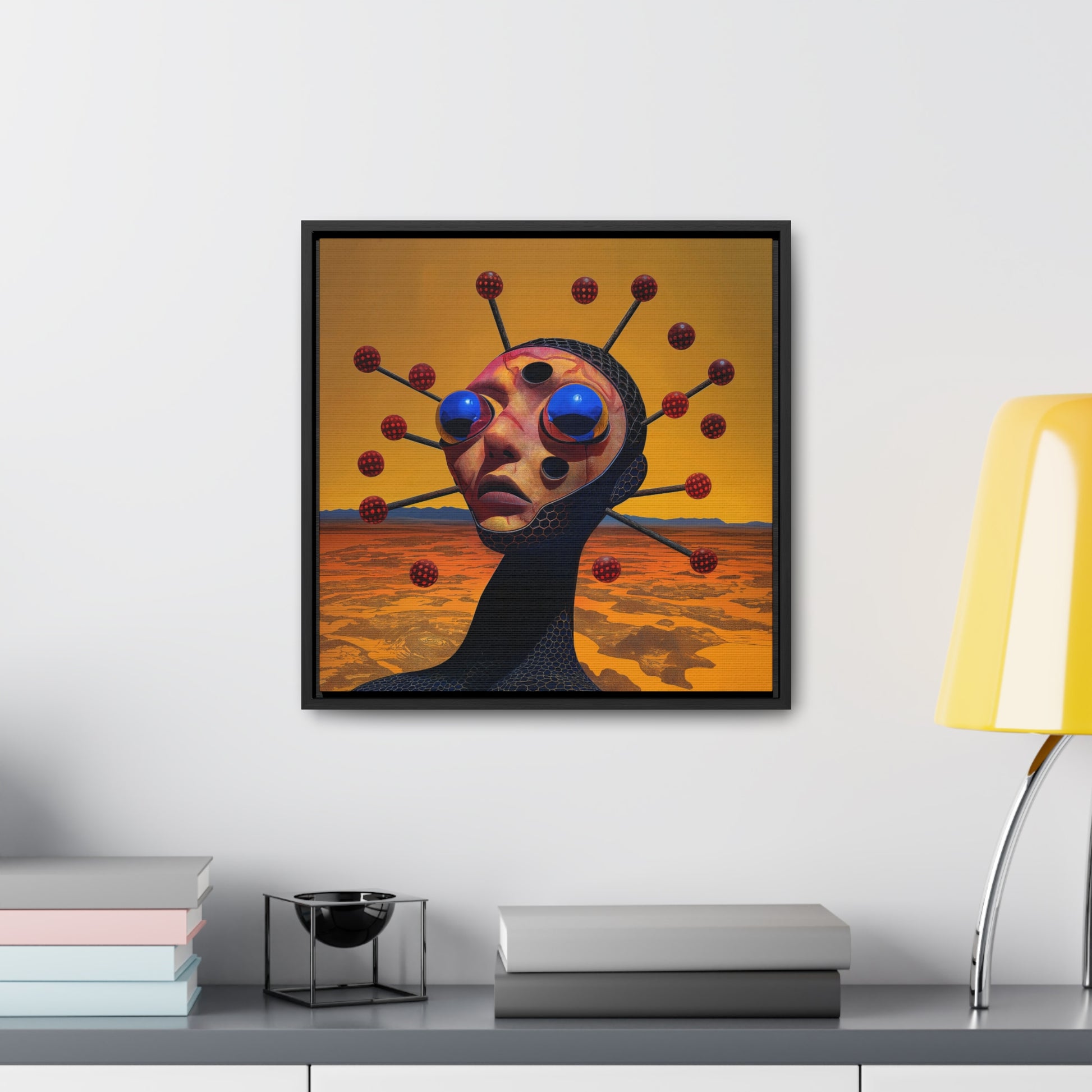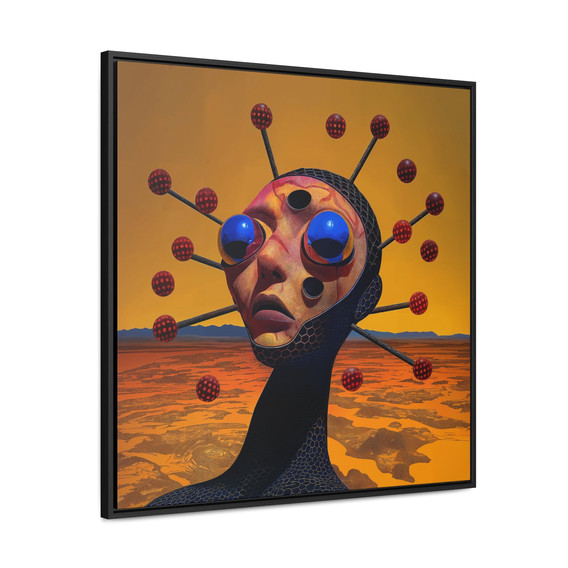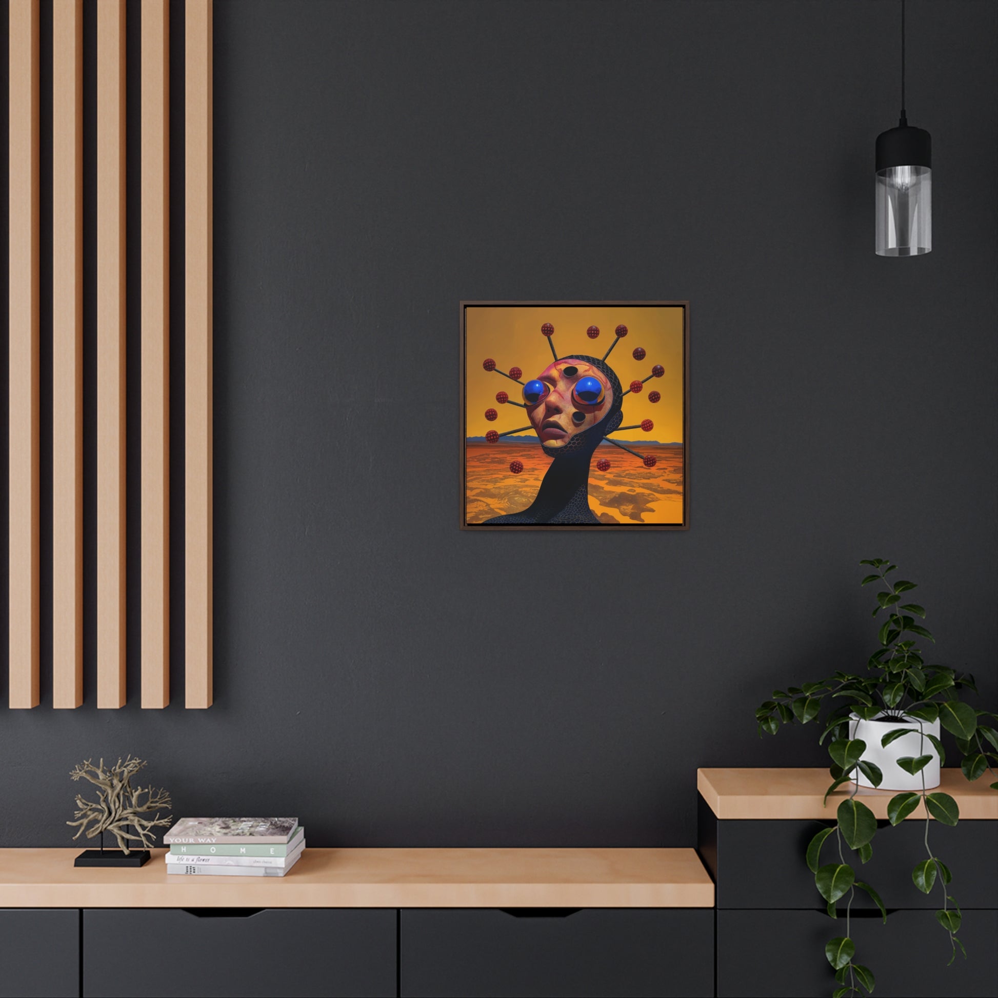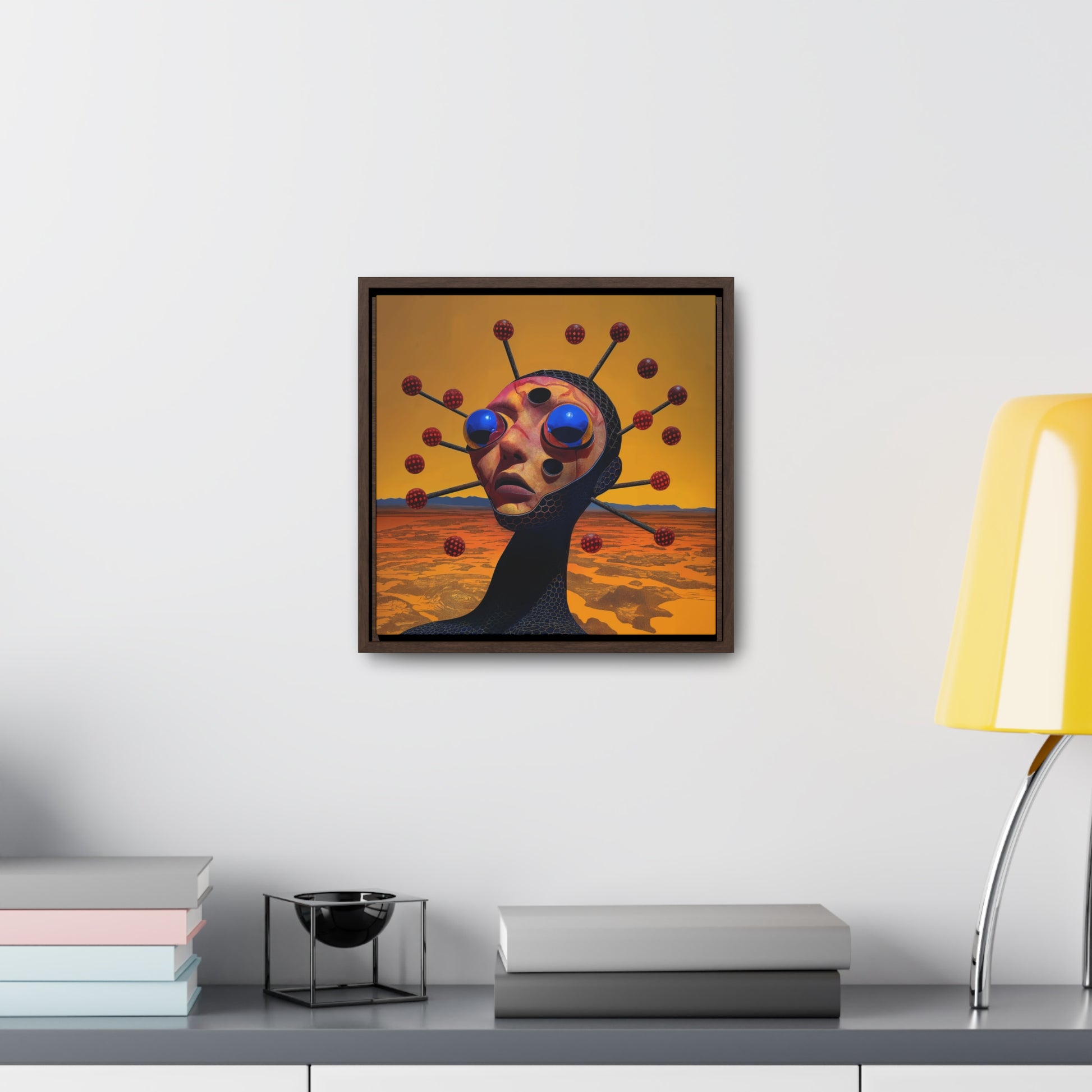 Bluegy One" is a striking piece of futuristic sci-fi art that transports the viewer to a surreal and otherworldly landscape. The artwork features a humanoid figure with a distinctive, textured surface and bright blue eyes that seem to pierce through the canvas. The head is adorned with spherical red protrusions, adding an element of intrigue and complexity. Set against a vibrant orange backdrop, the figure stands out, making this piece a bold statement for any modern decor.