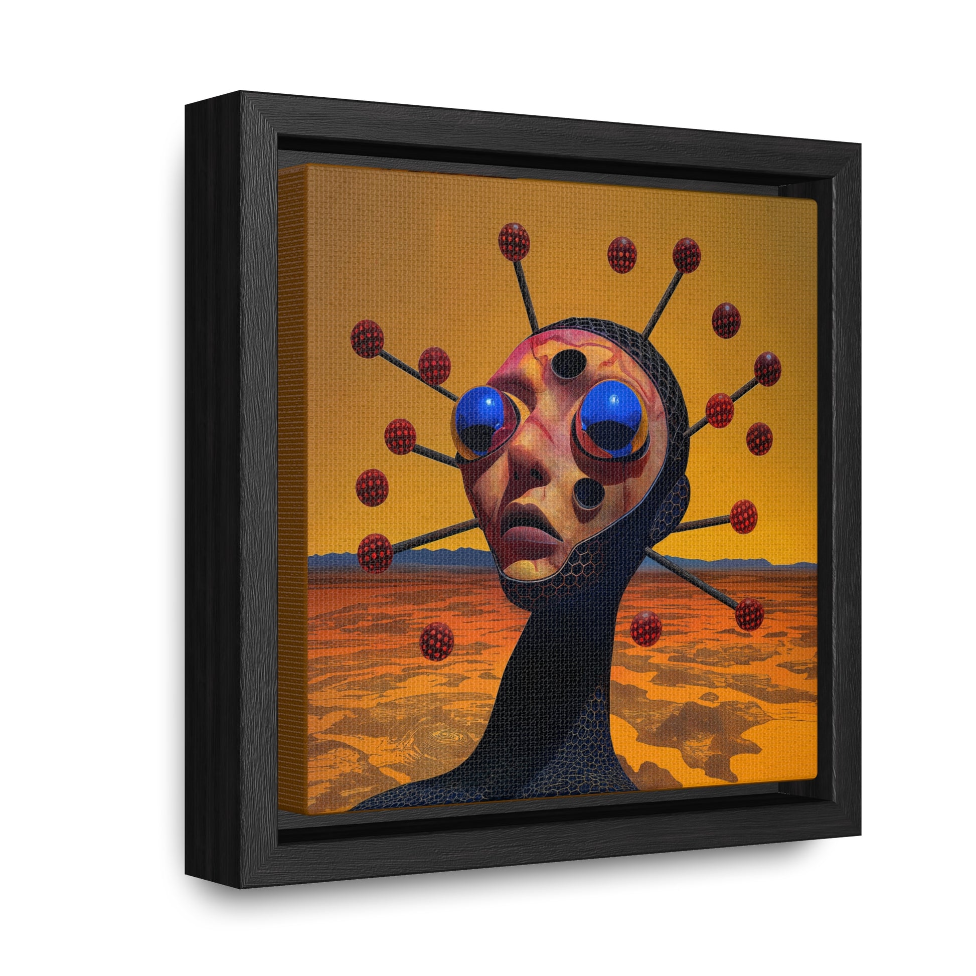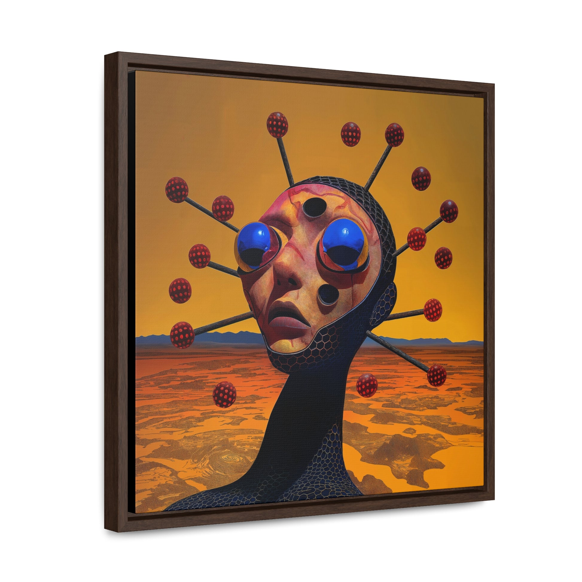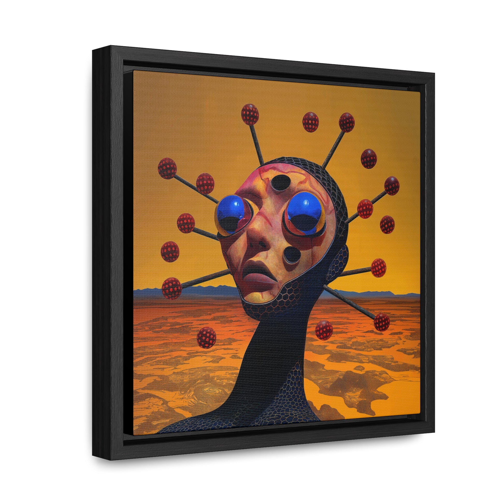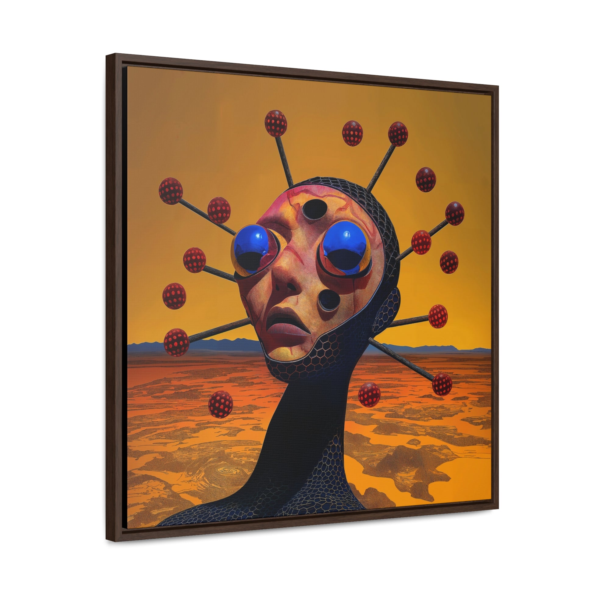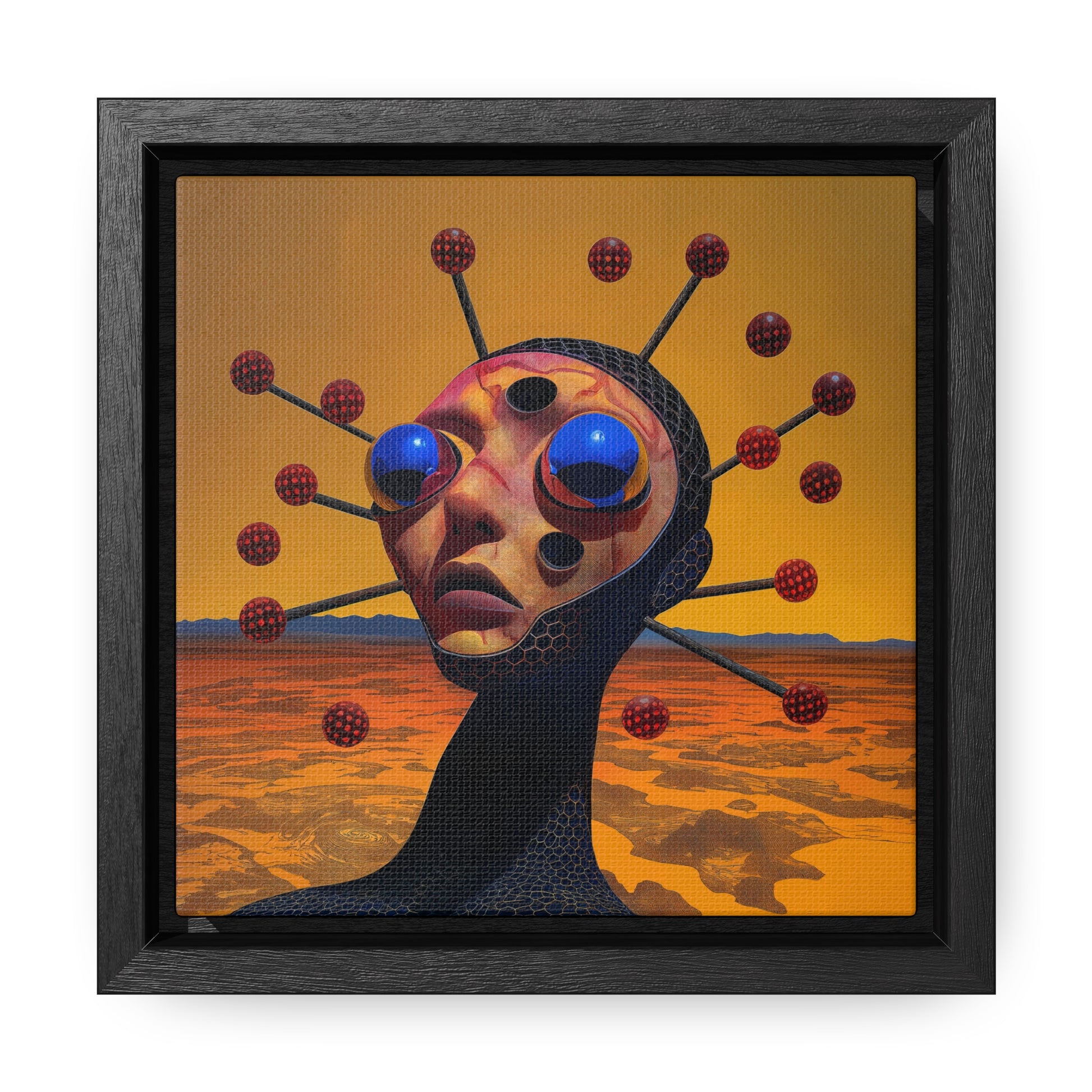 Bluegy One" is a striking piece of futuristic sci-fi art that transports the viewer to a surreal and otherworldly landscape. The artwork features a humanoid figure with a distinctive, textured surface and bright blue eyes that seem to pierce through the canvas. The head is adorned with spherical red protrusions, adding an element of intrigue and complexity. Set against a vibrant orange backdrop, the figure stands out, making this piece a bold statement for any modern decor.