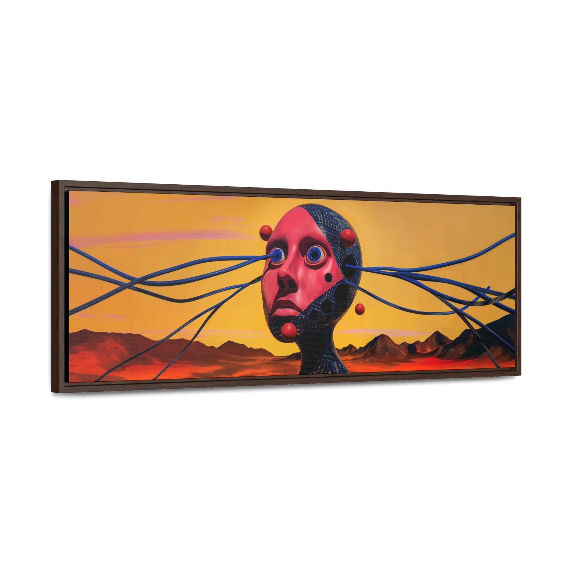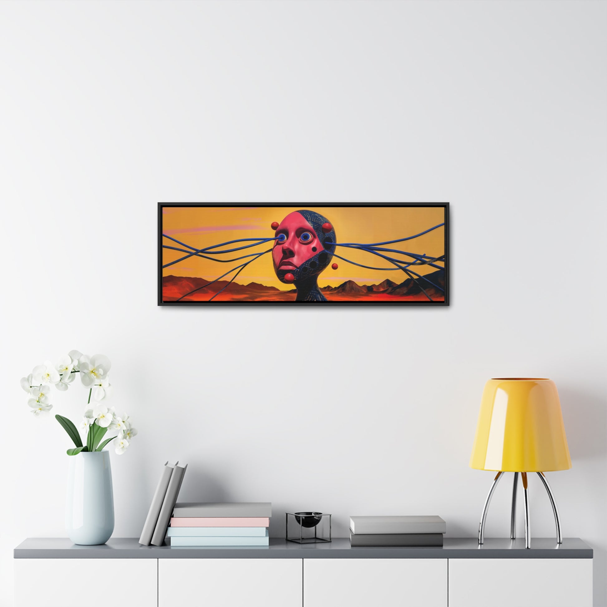 "Dream Connection" is a striking piece that blends sci-fi elements with surrealism to create an arresting visual narrative. This artwork features a humanoid face in vivid pink, adorned with large, captivating blue eyes connected by slender cables extending from the head. The background is a warm, gradient landscape with hues of yellow and orange, evoking an otherworldly desert at sunset. The intricate details and futuristic theme make this piece a perfect addition to any modern art collection.