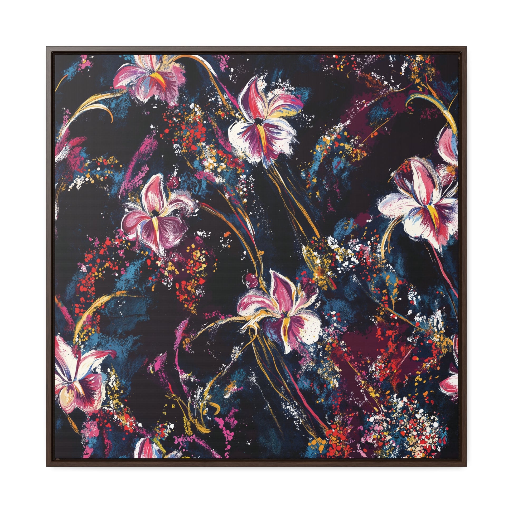 Brighten any space with "Greetings", a captivating framed artwork from the Floral Fusion Collection by Rich Silver. This vibrant piece combines a harmonious blend of deep blues, rich magentas, and radiant gold accents, creating a mesmerizing abstract floral design. The cascading white and pink petals, highlighted with bold strokes of color, evoke the energy and grace of blooming flowers in motion. Set against a moody yet dynamic backdrop, "Greetings" captures the beauty of nature's elegance, reimagined through an abstract lens.