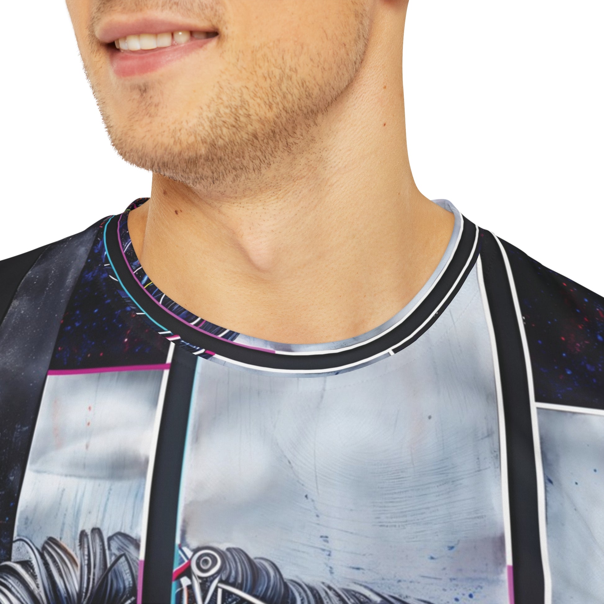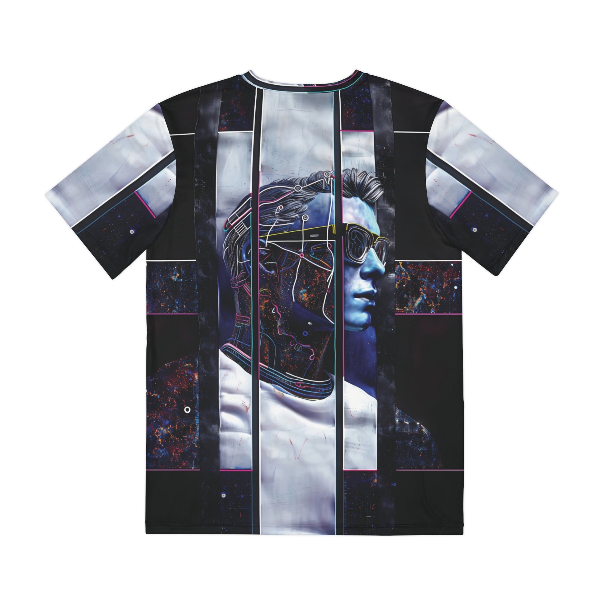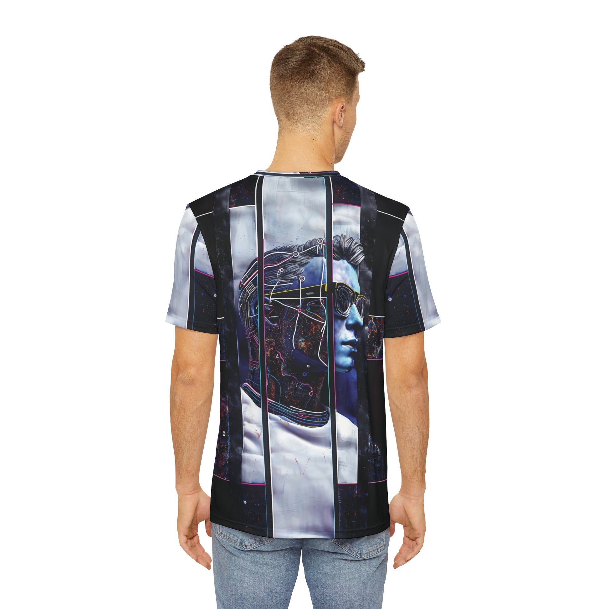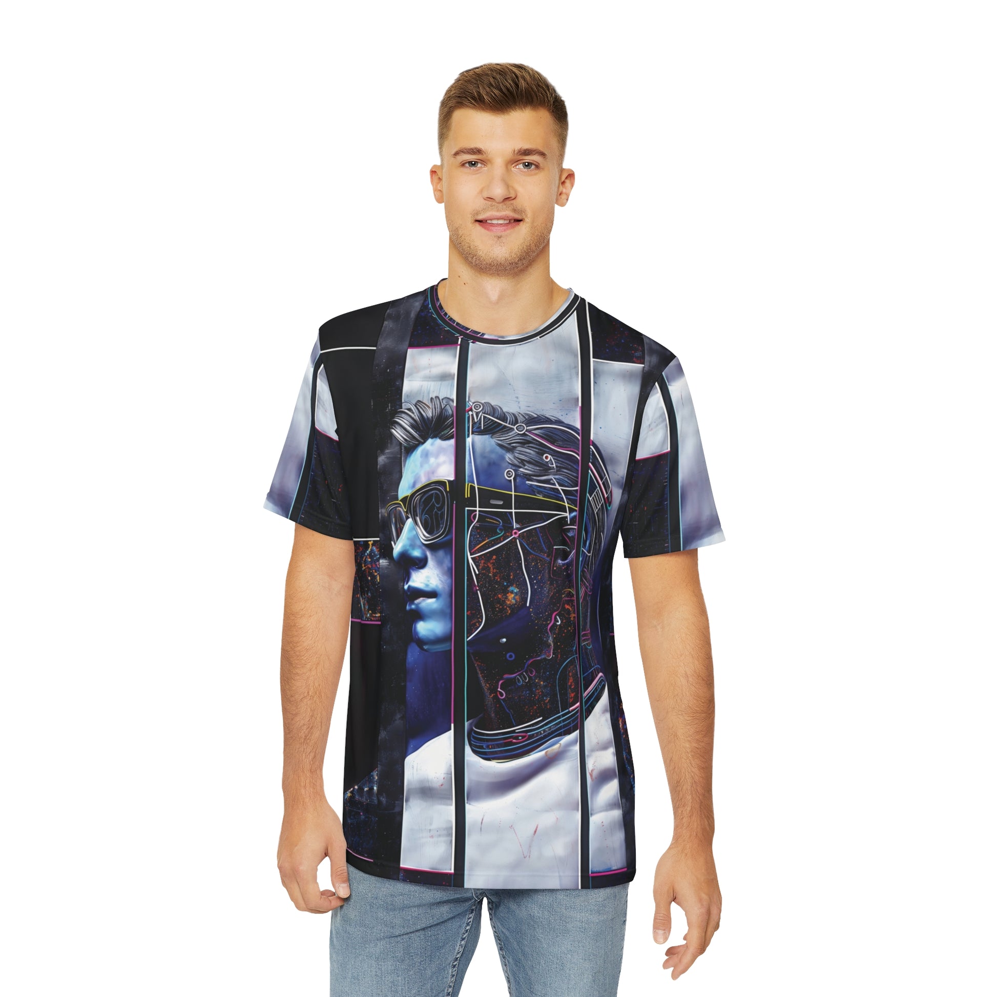 Elevate your style with the Right On Blue design, featured on a high-quality all over print t-shirt. This striking modern art piece displays dynamic patterns and bold shades of blue on both the front and back, making it a head-turning addition to any outfit.