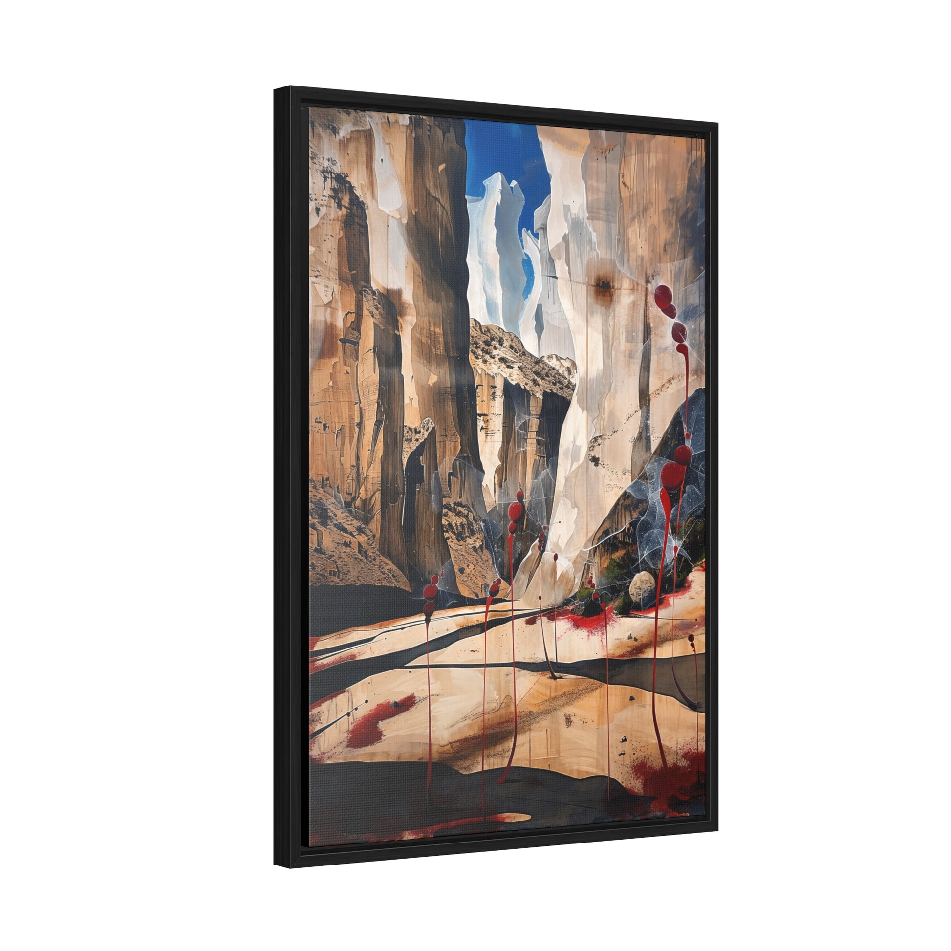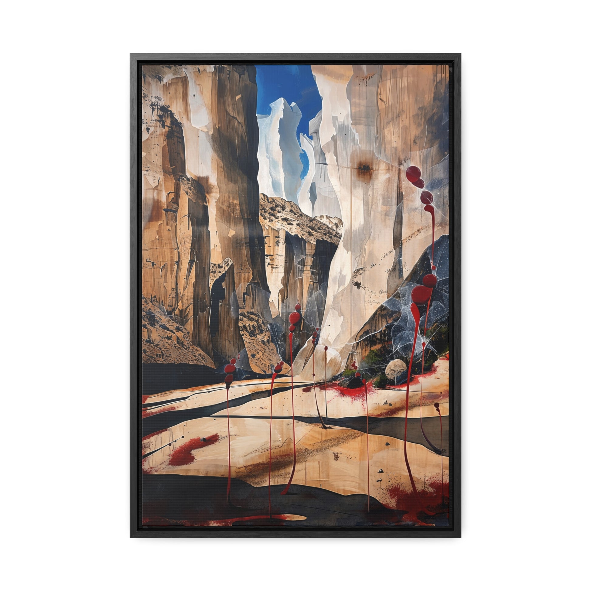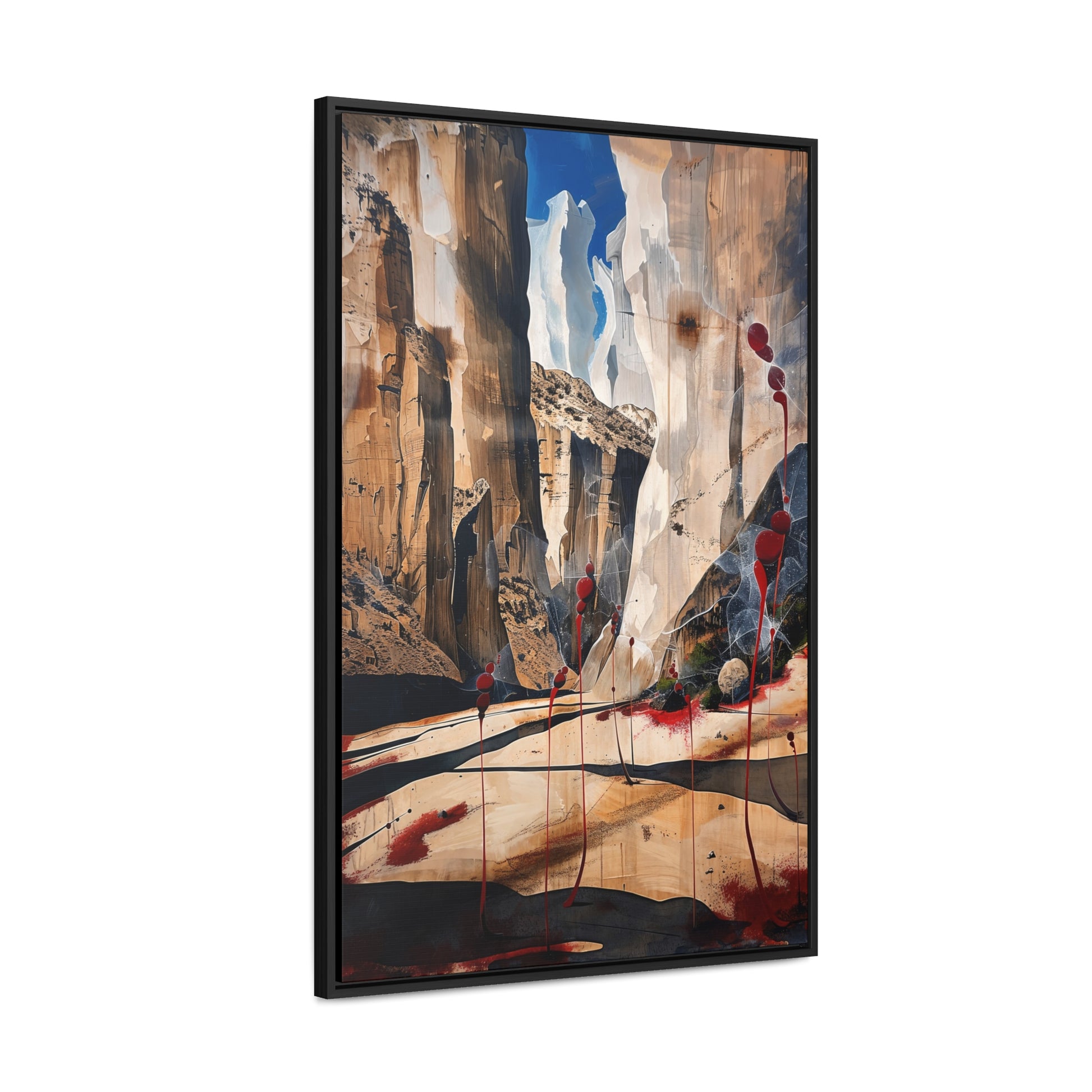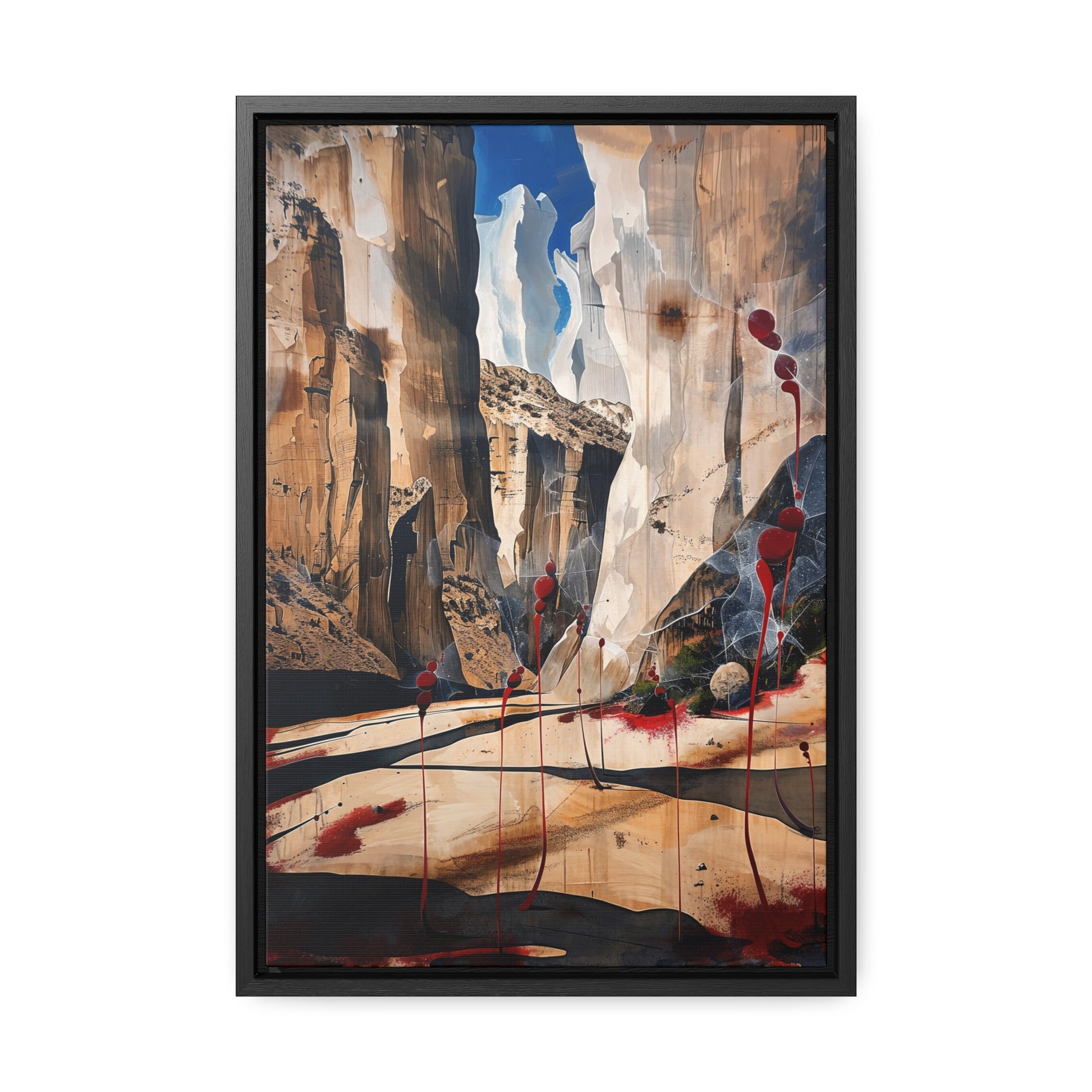 Description: "The Scattering" is an awe-inspiring surreal masterpiece that transports viewers into a realm where nature and abstraction blend seamlessly. The artwork features towering canyon walls painted in rich, earthy tones, contrasted by vibrant red sphere-like objects that seem to scatter and float within the scene. This dynamic interplay of colors and forms creates a sense of depth and movement, evoking both the grandeur of natural landscapes and the boundless possibilities of the imagination. Perfect for adding a touch of the extraordinary to any space, this piece invites contemplation and inspires wonder.