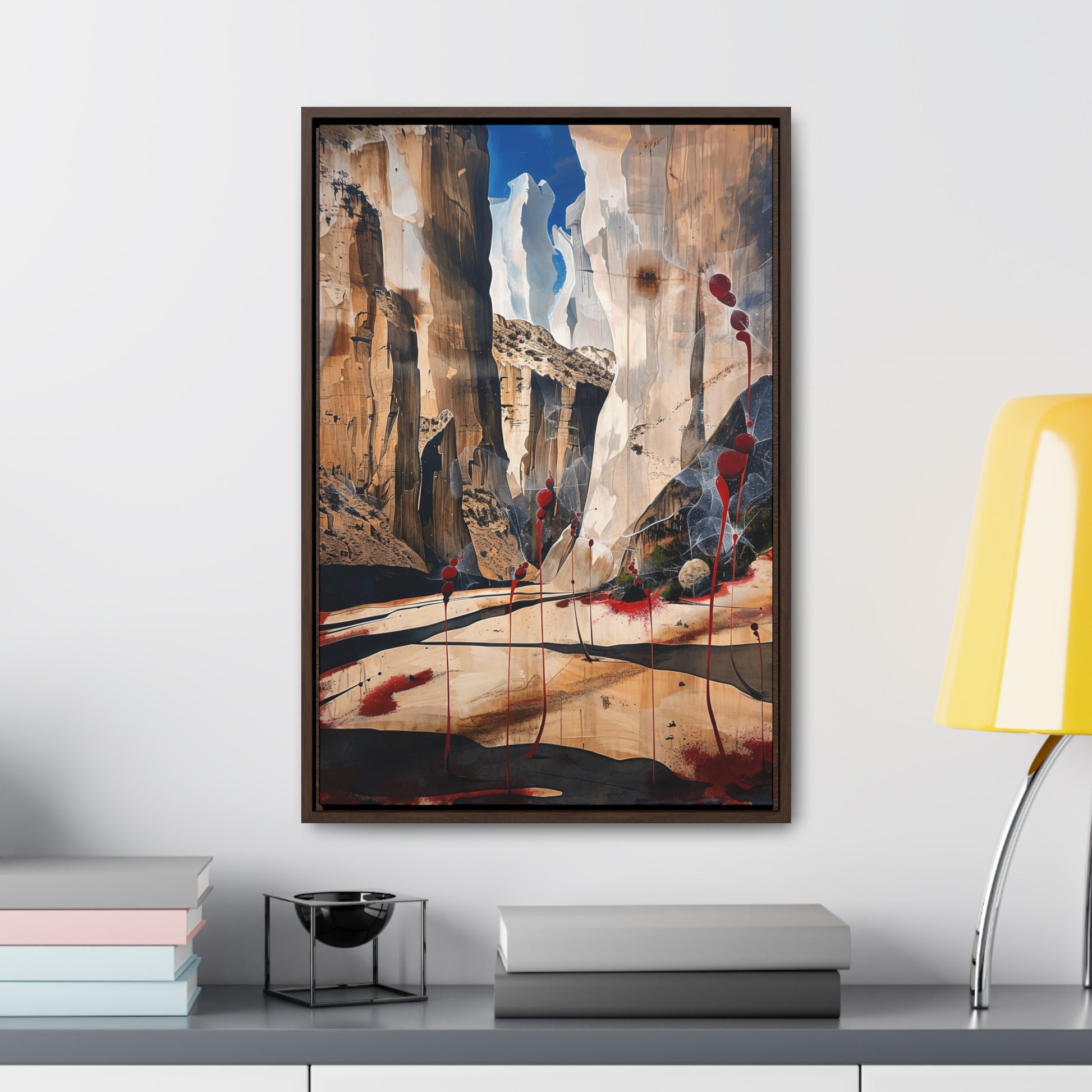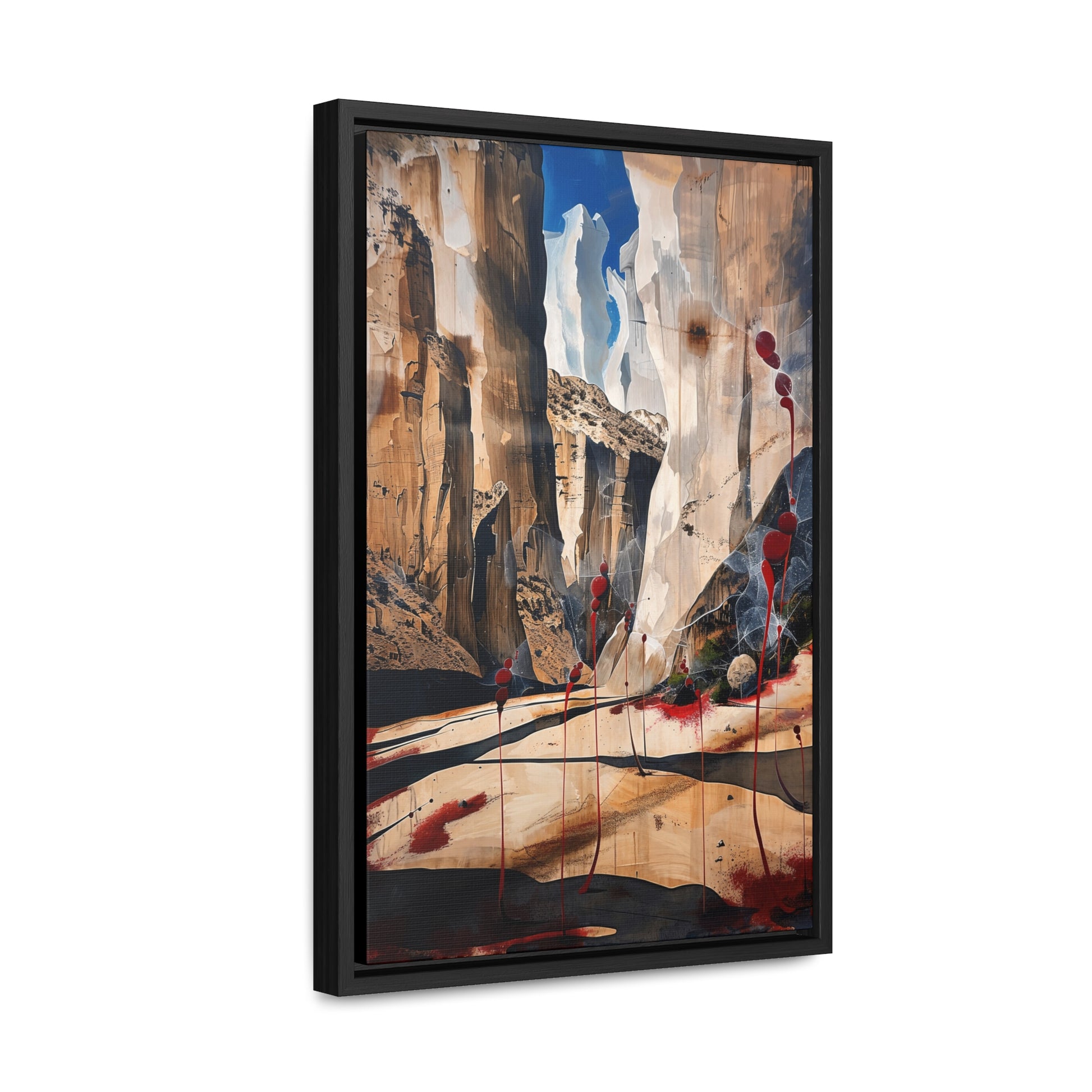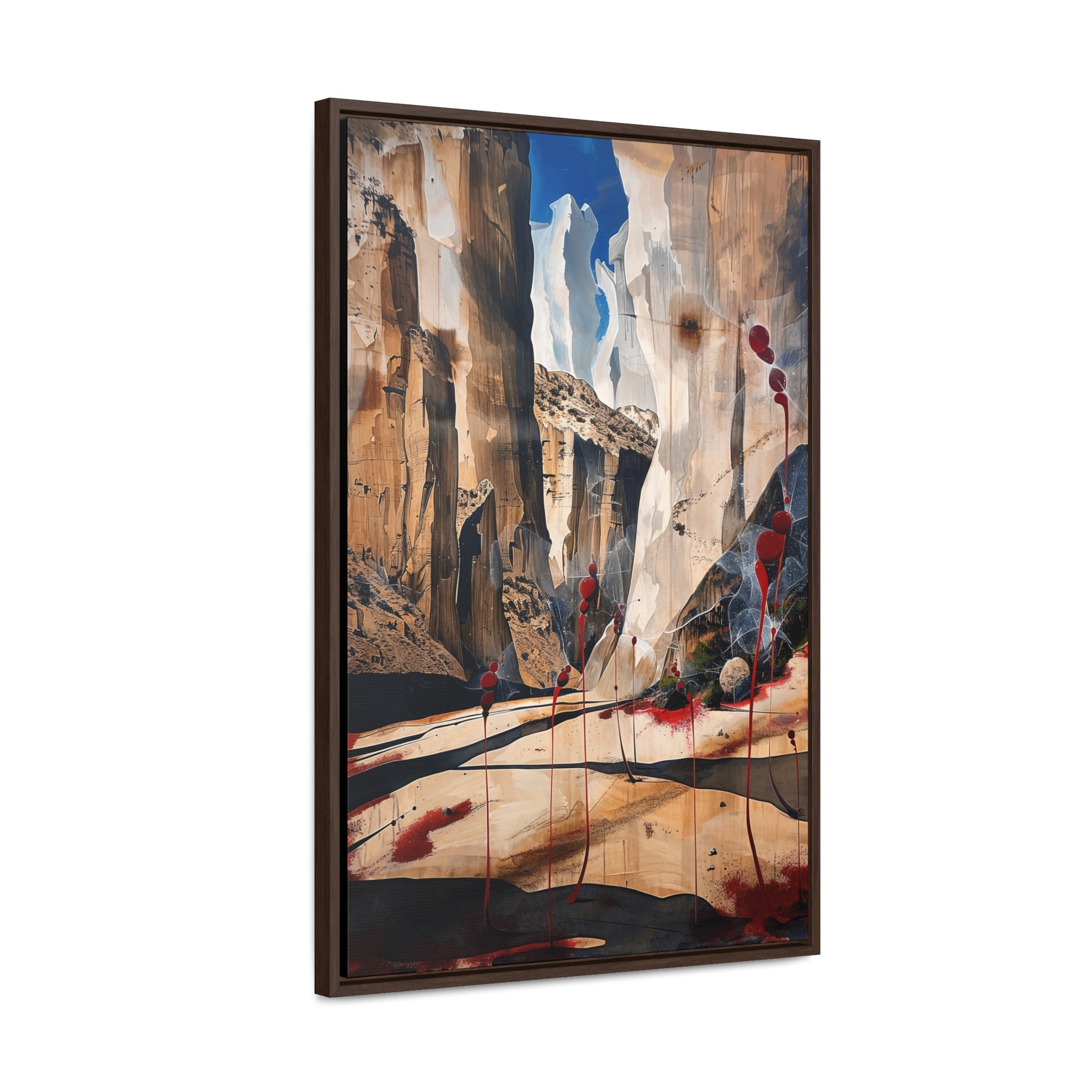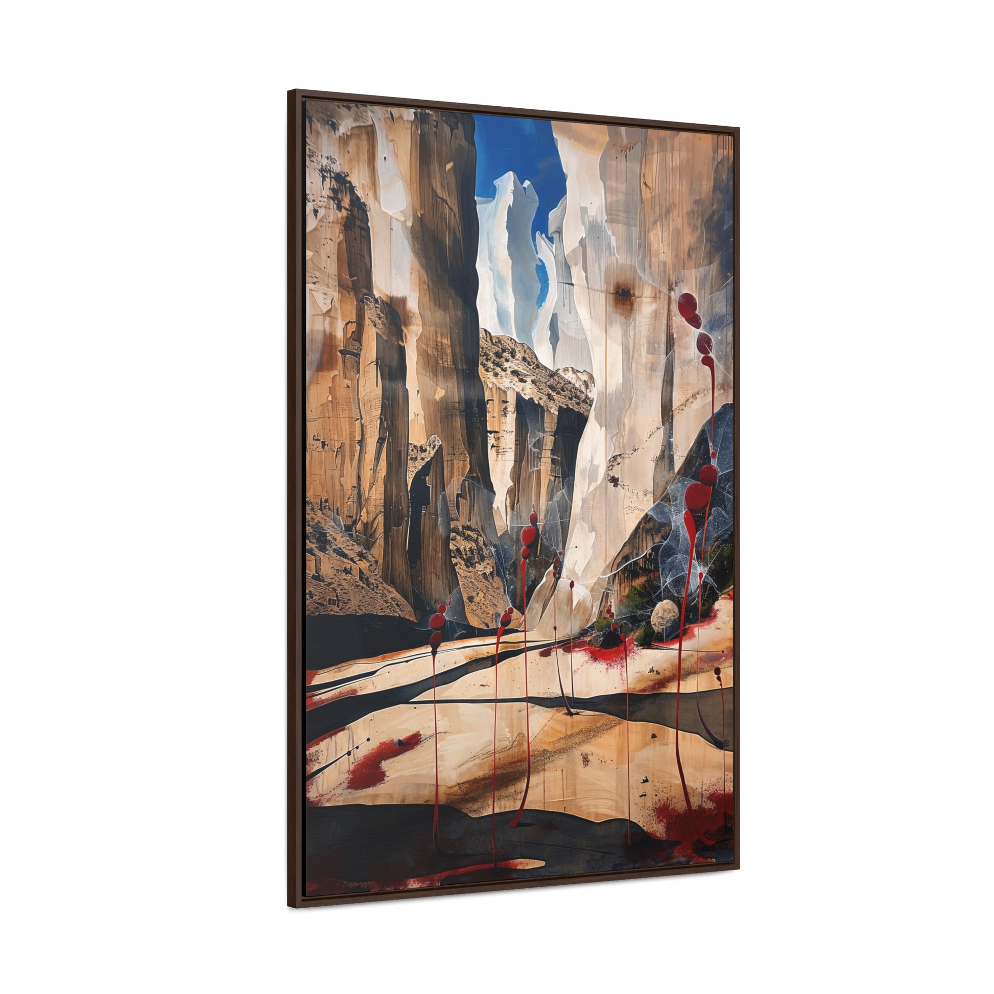 Description: "The Scattering" is an awe-inspiring surreal masterpiece that transports viewers into a realm where nature and abstraction blend seamlessly. The artwork features towering canyon walls painted in rich, earthy tones, contrasted by vibrant red sphere-like objects that seem to scatter and float within the scene. This dynamic interplay of colors and forms creates a sense of depth and movement, evoking both the grandeur of natural landscapes and the boundless possibilities of the imagination. Perfect for adding a touch of the extraordinary to any space, this piece invites contemplation and inspires wonder.
