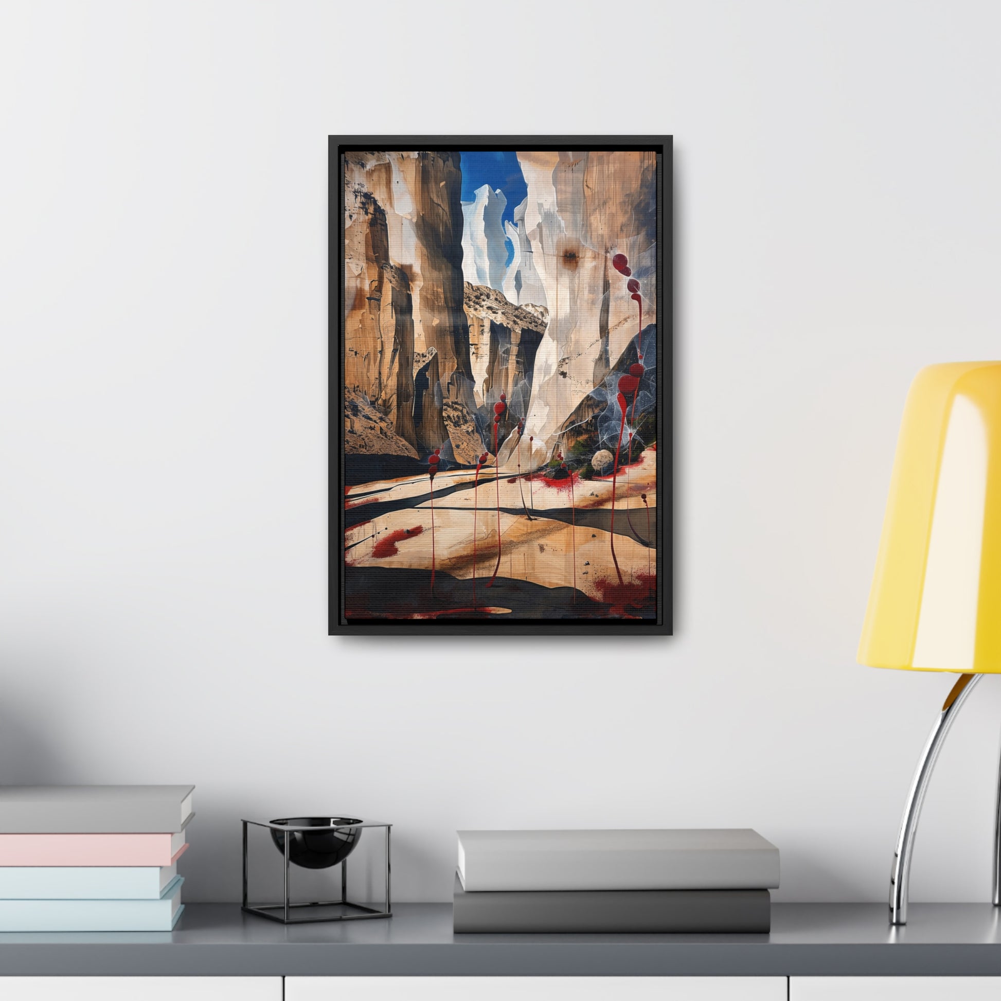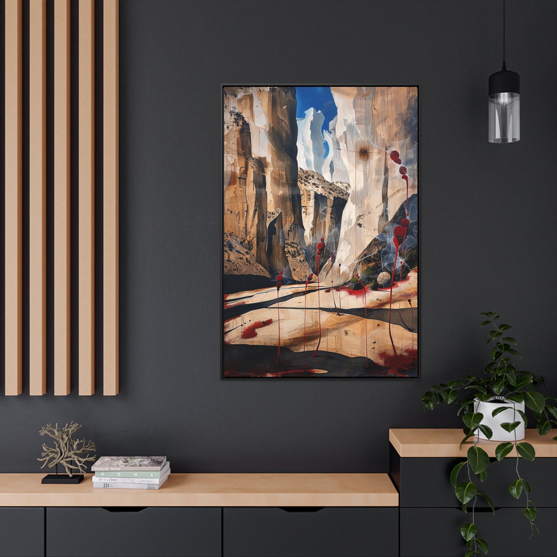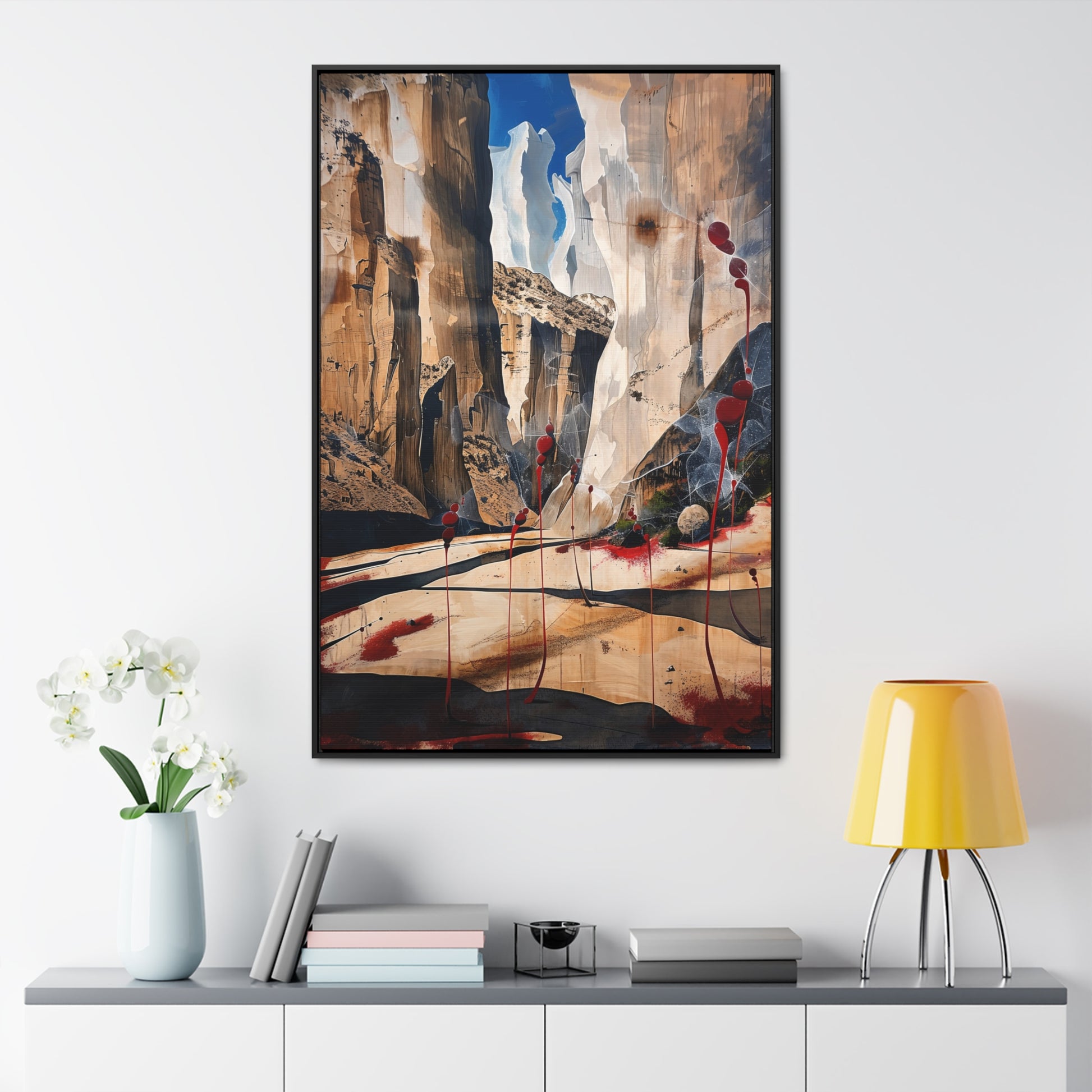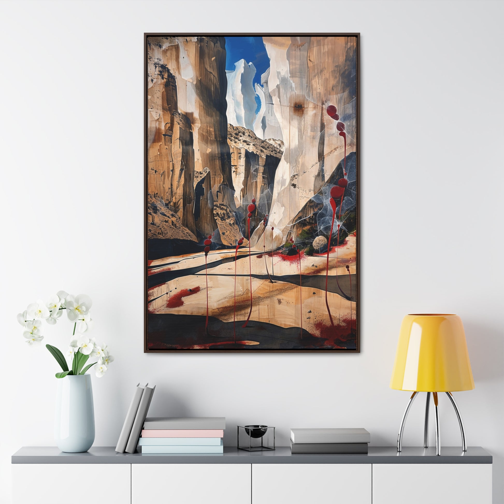 Description: "The Scattering" is an awe-inspiring surreal masterpiece that transports viewers into a realm where nature and abstraction blend seamlessly. The artwork features towering canyon walls painted in rich, earthy tones, contrasted by vibrant red sphere-like objects that seem to scatter and float within the scene. This dynamic interplay of colors and forms creates a sense of depth and movement, evoking both the grandeur of natural landscapes and the boundless possibilities of the imagination. Perfect for adding a touch of the extraordinary to any space, this piece invites contemplation and inspires wonder.