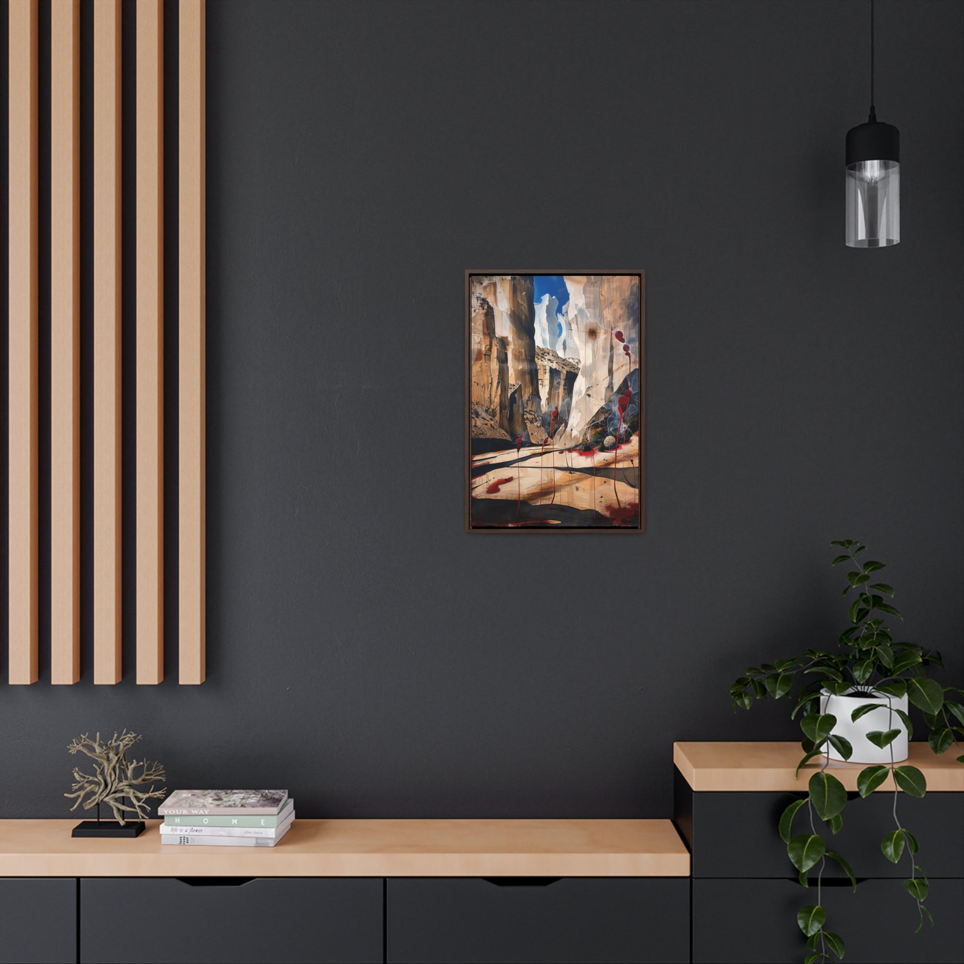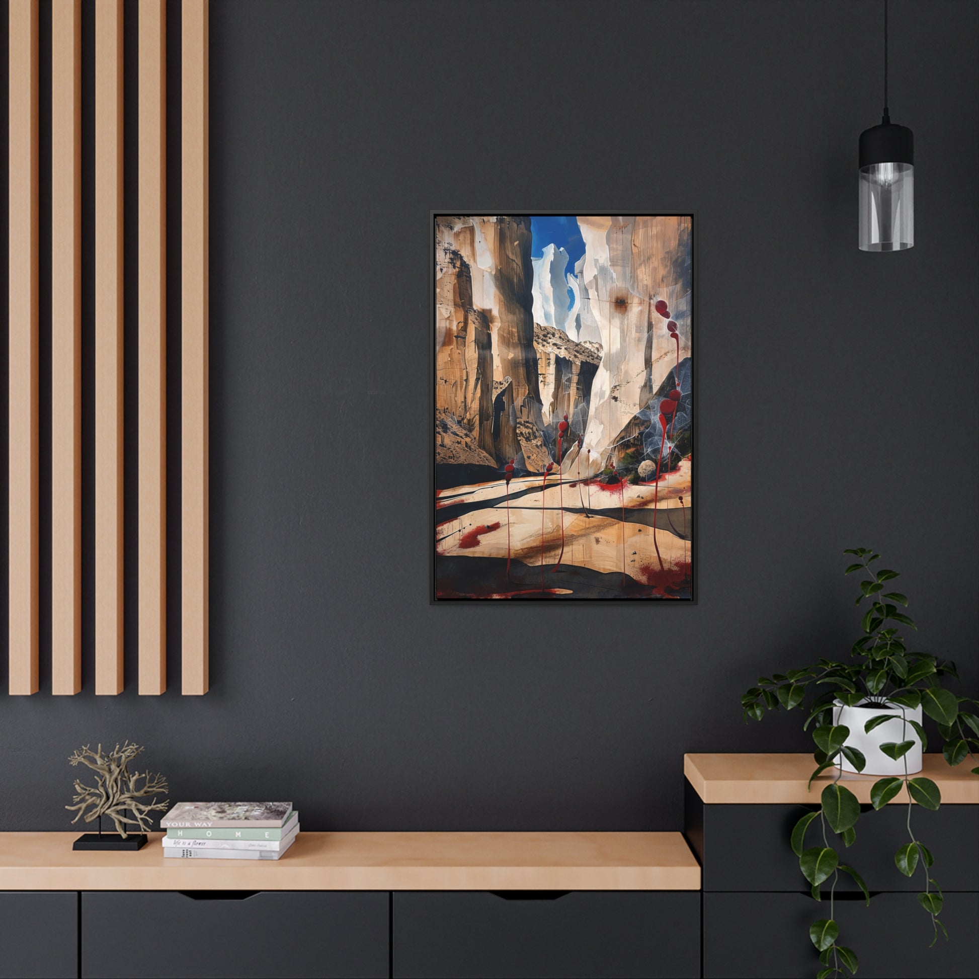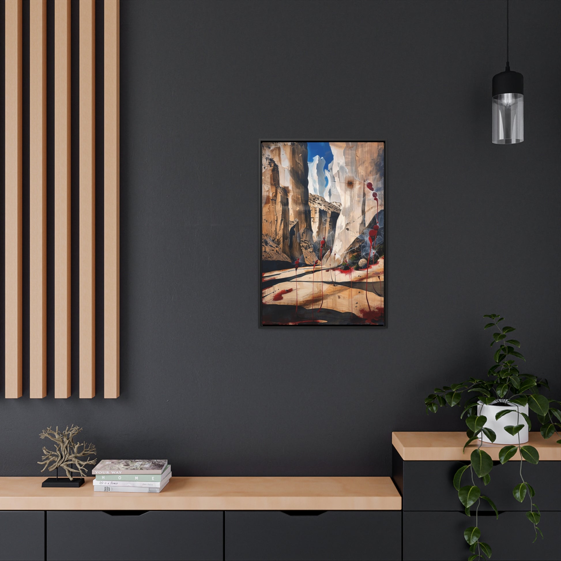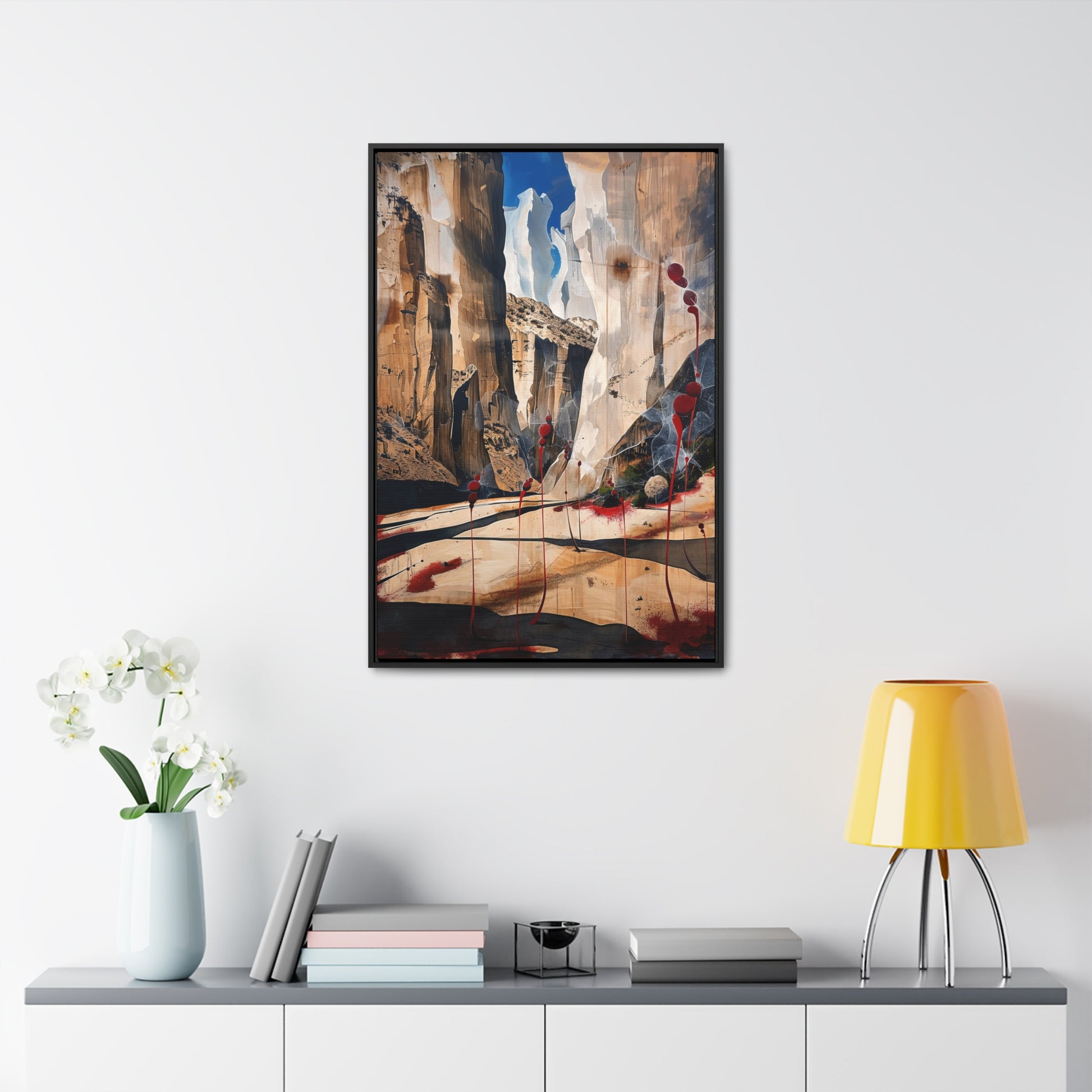 Description: "The Scattering" is an awe-inspiring surreal masterpiece that transports viewers into a realm where nature and abstraction blend seamlessly. The artwork features towering canyon walls painted in rich, earthy tones, contrasted by vibrant red sphere-like objects that seem to scatter and float within the scene. This dynamic interplay of colors and forms creates a sense of depth and movement, evoking both the grandeur of natural landscapes and the boundless possibilities of the imagination. Perfect for adding a touch of the extraordinary to any space, this piece invites contemplation and inspires wonder.