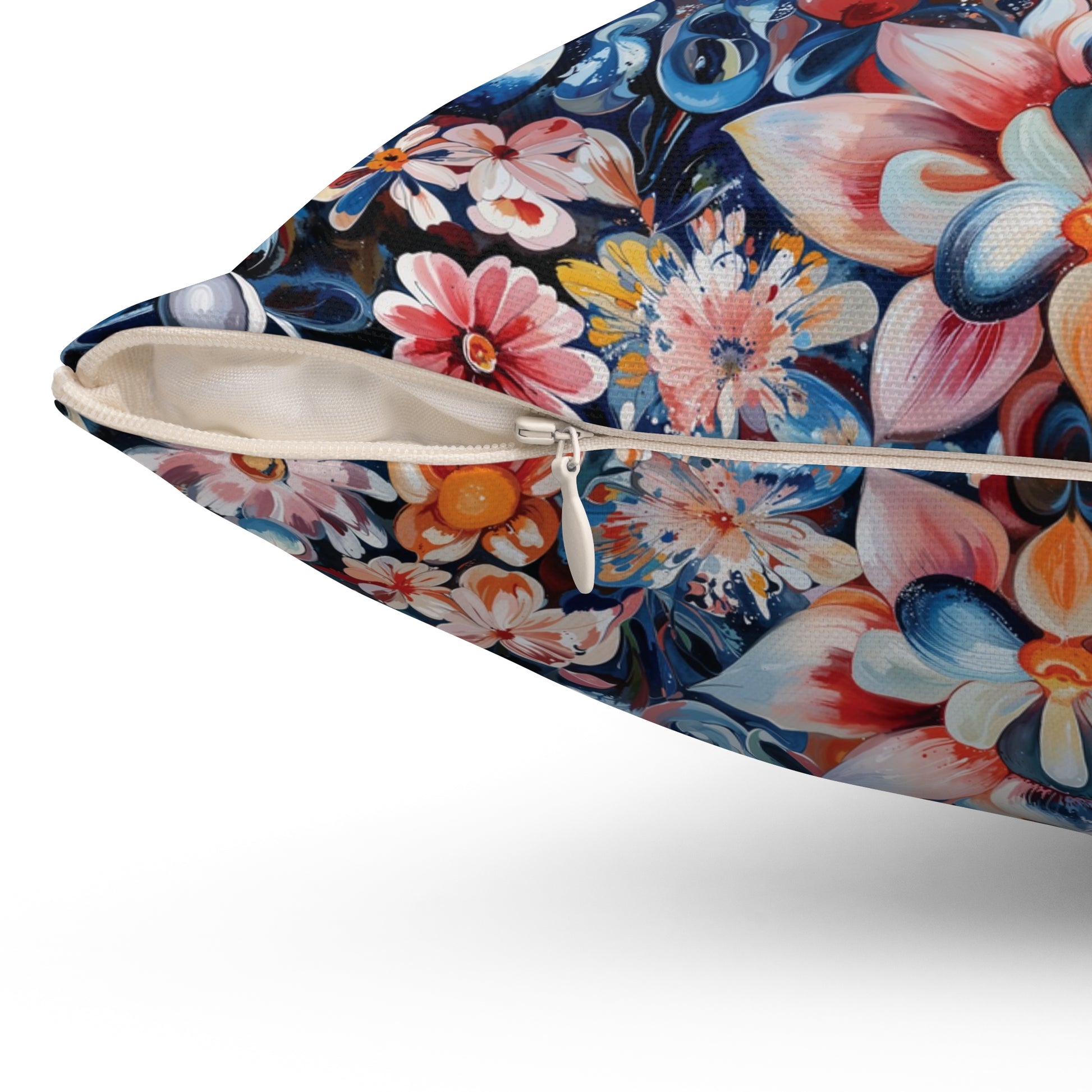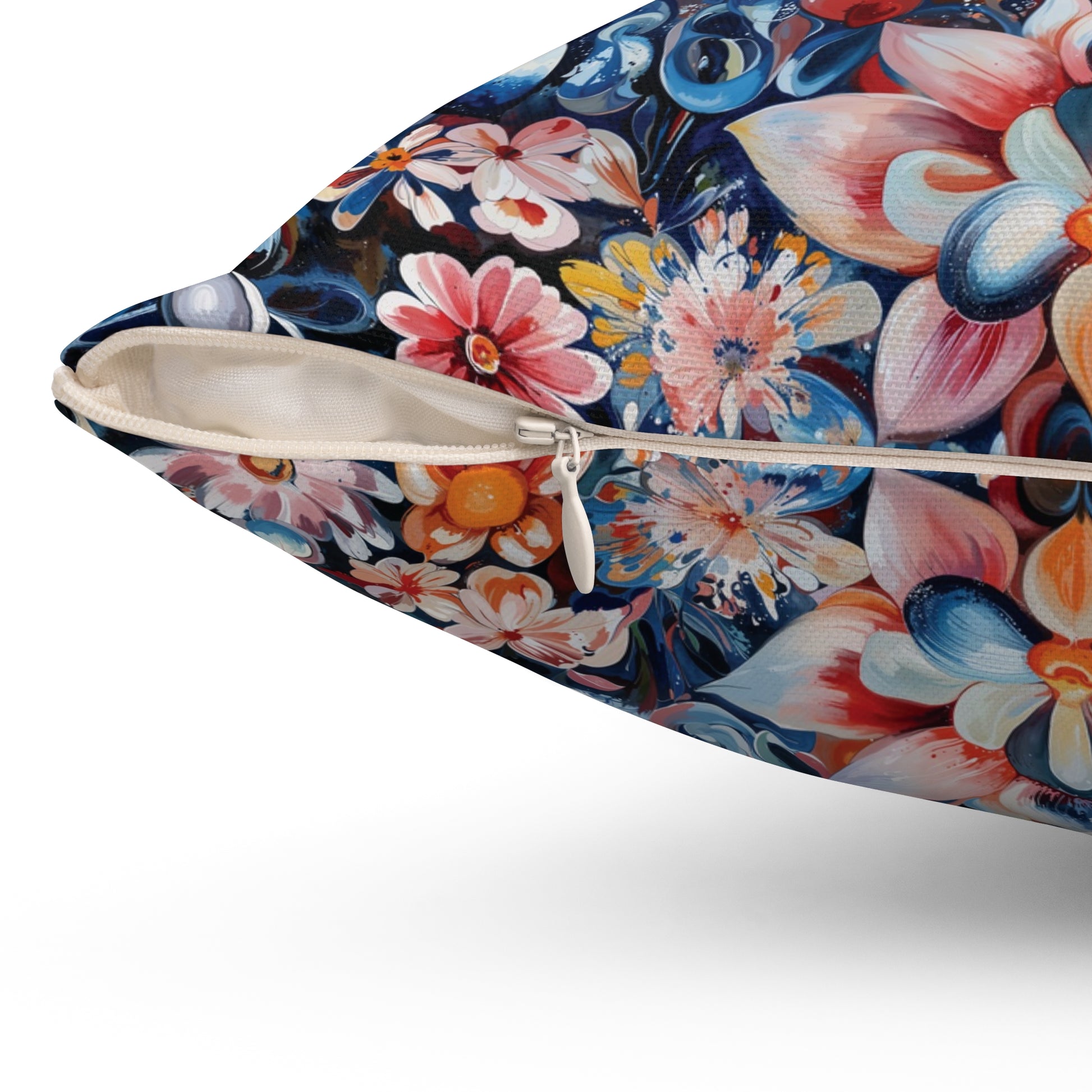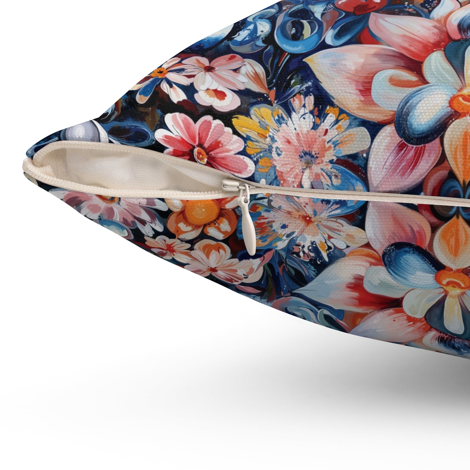 Add a bold artistic touch to your home with the "Bloomscape" Pillow, featuring Rich Silver’s vibrant floral abstract design from the Floral Fusion Collection. This beautifully crafted small square pillow serves as both a stunning statement piece and a cozy addition to your living room, bedroom, or reading nook. The intricate floral patterns and striking color palette of rich blues, fiery oranges, soft pinks, and whites bring a sense of dynamic energy to any space.