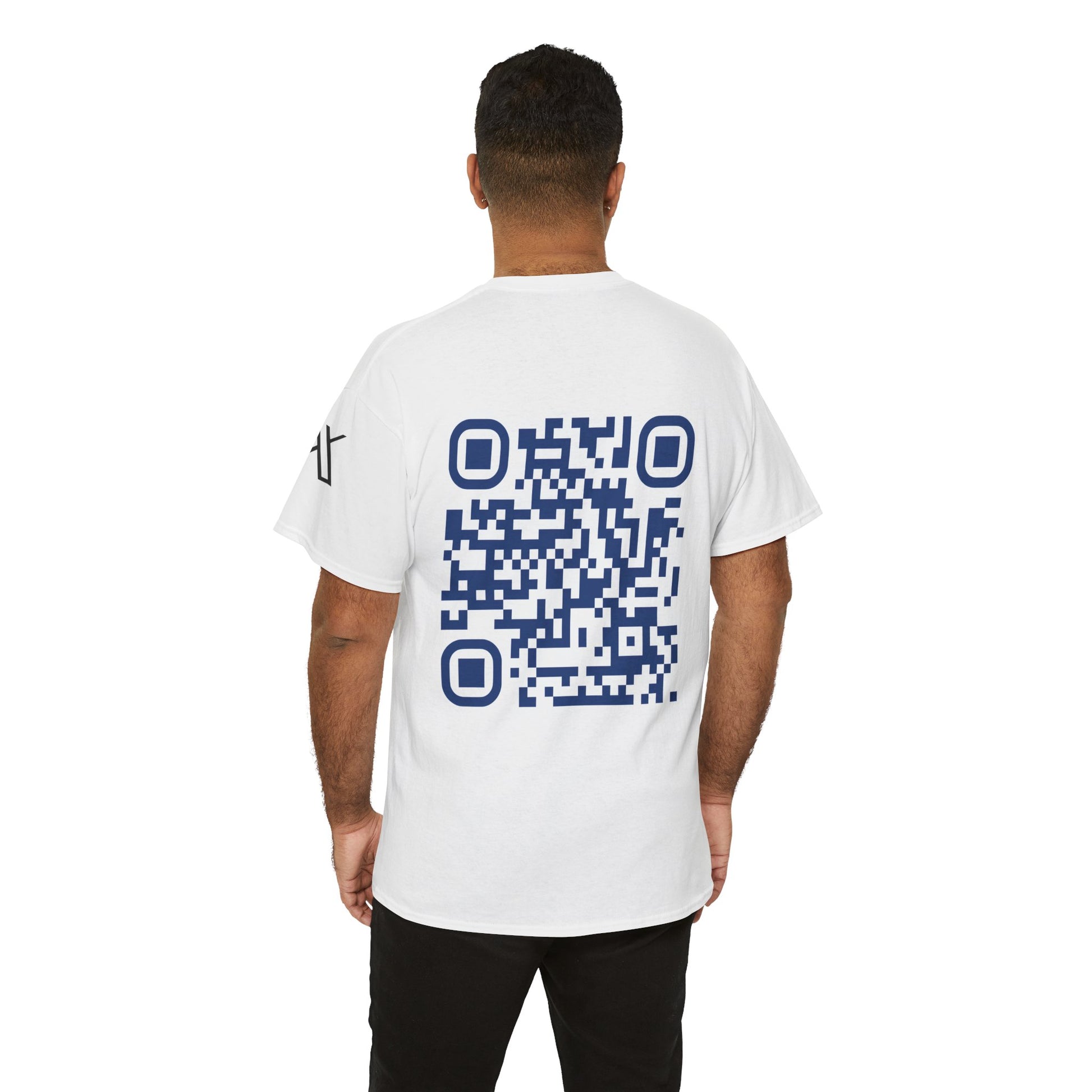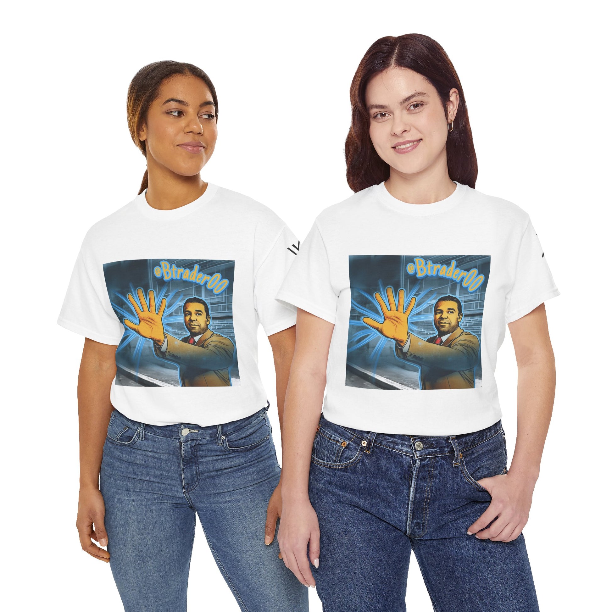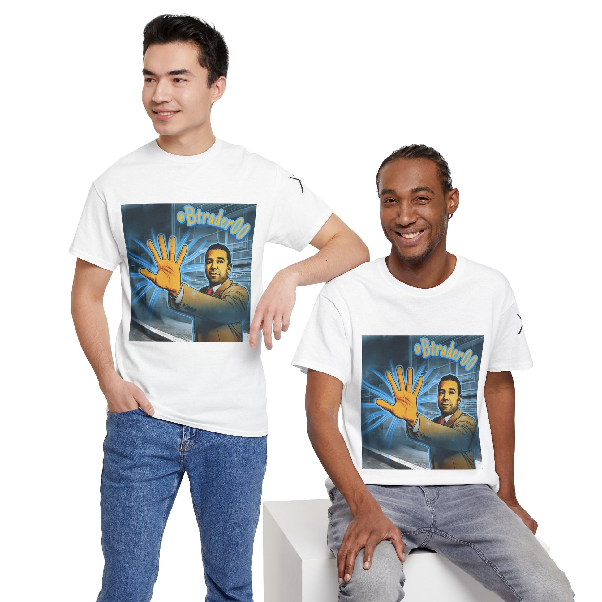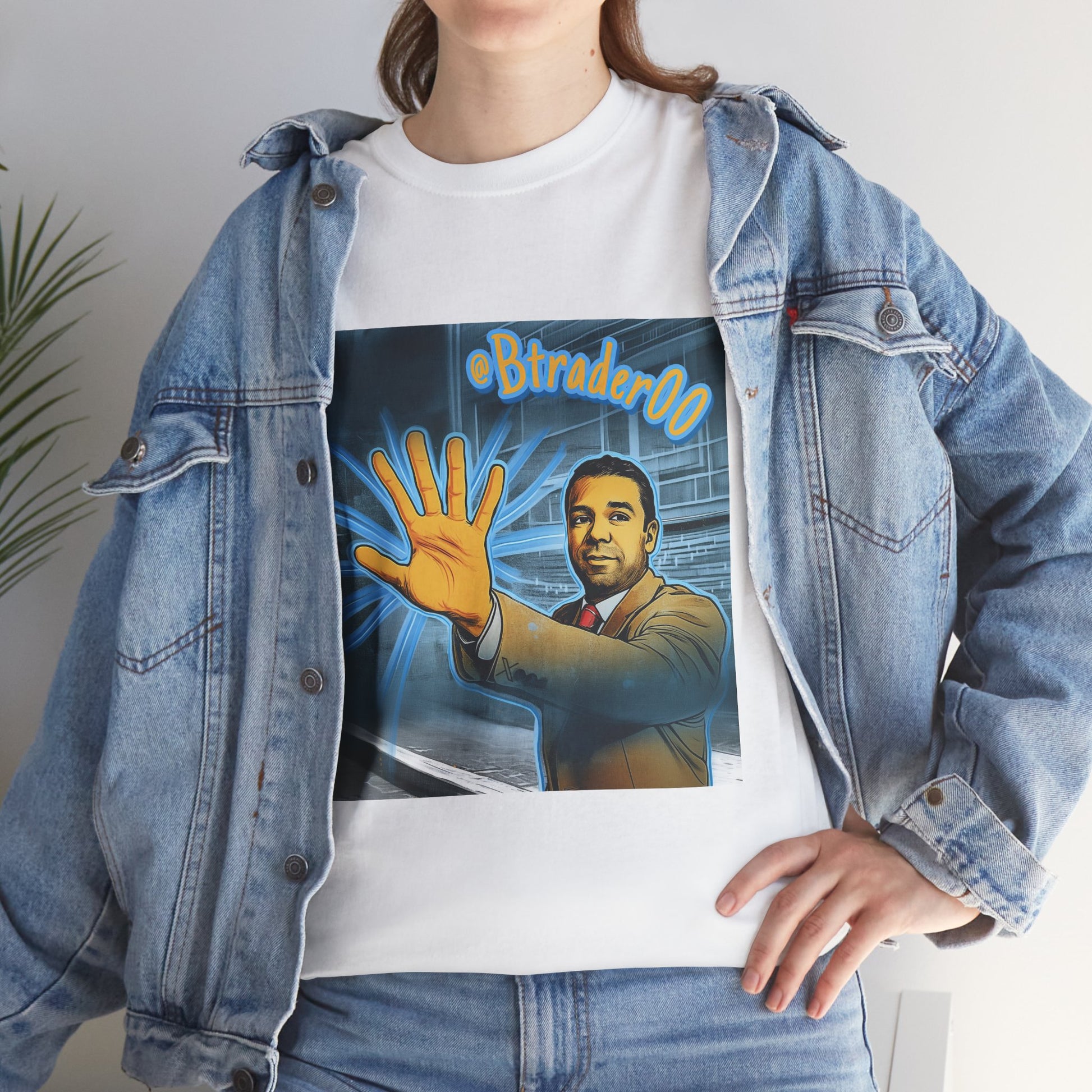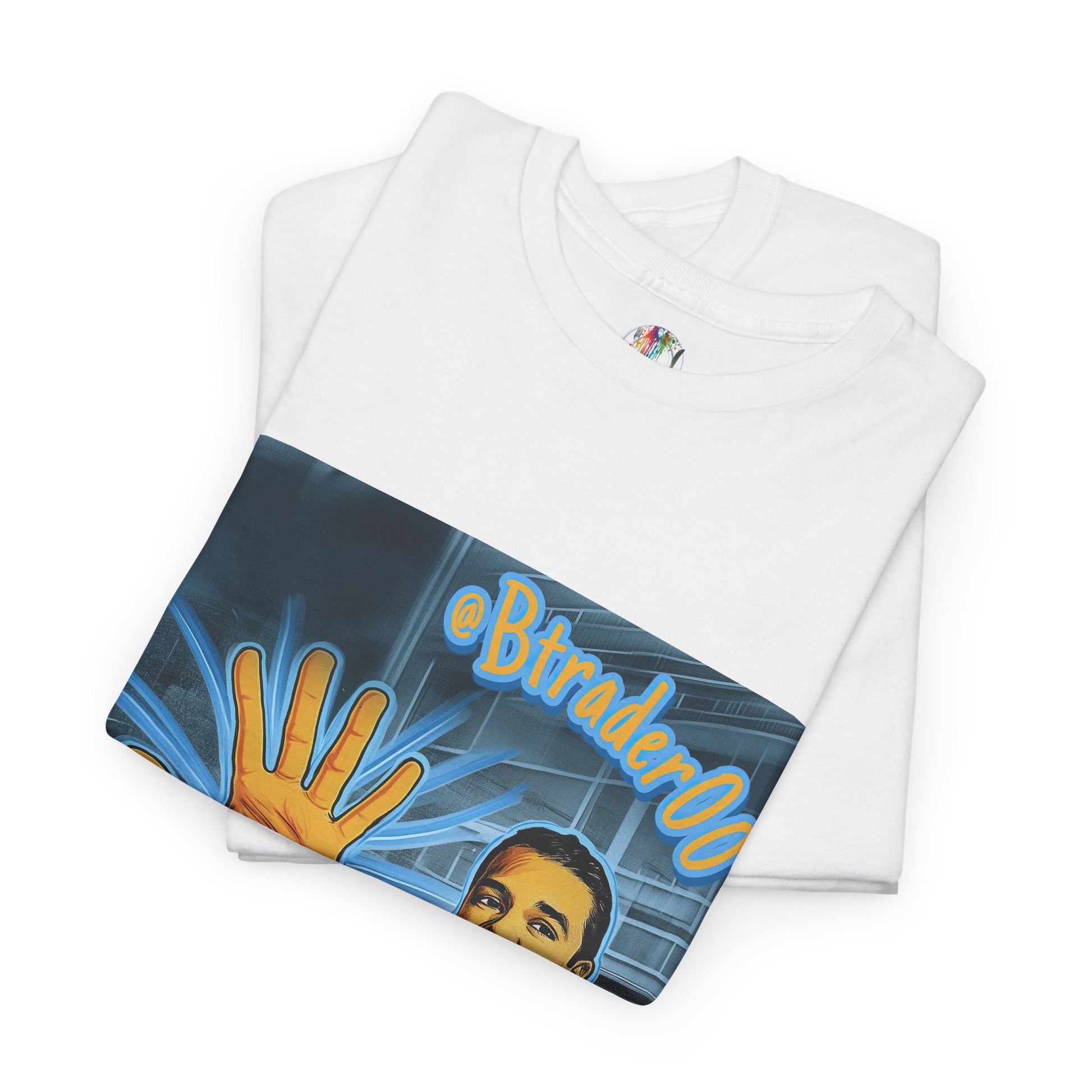 Designed for fans of the Btrader account on X.com. This t-shirt features an image of Btrader and his iconic yellow hand profile picture on the front, with a scannable QR code that takes you directly to his X.com profile page on the back.