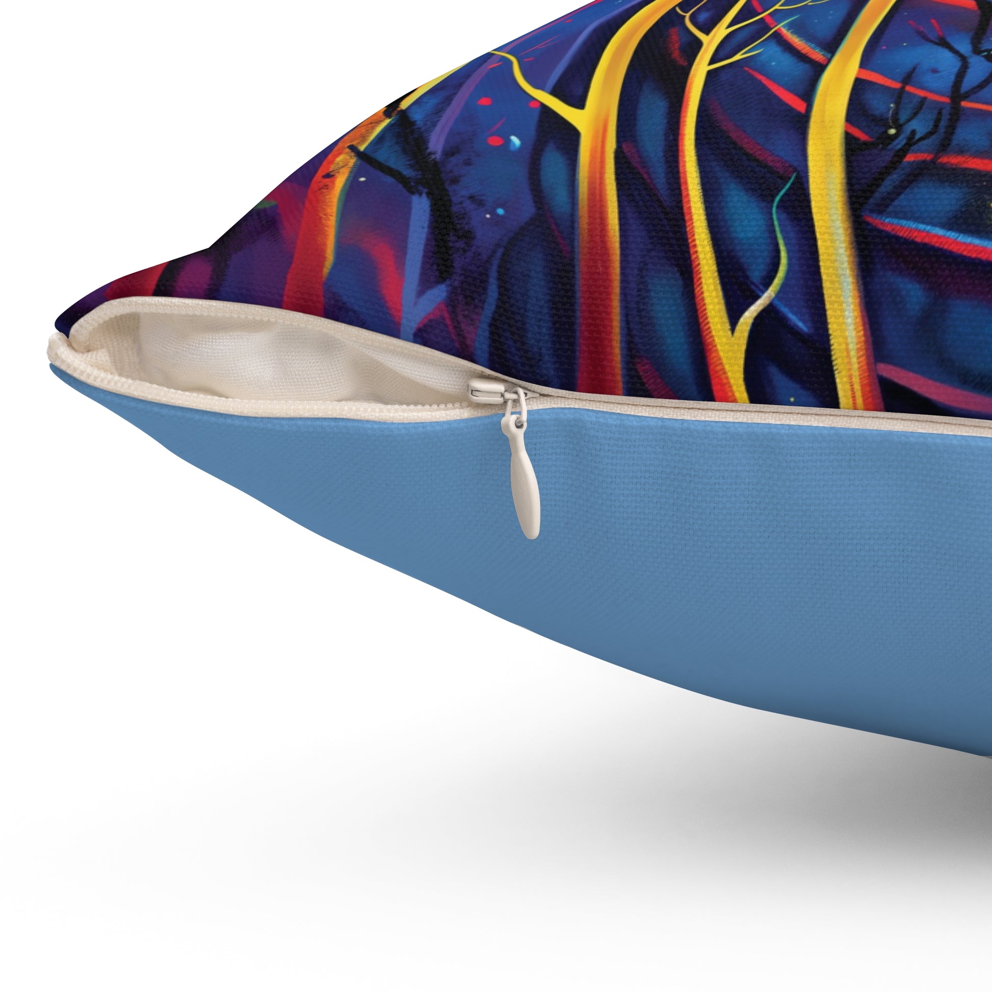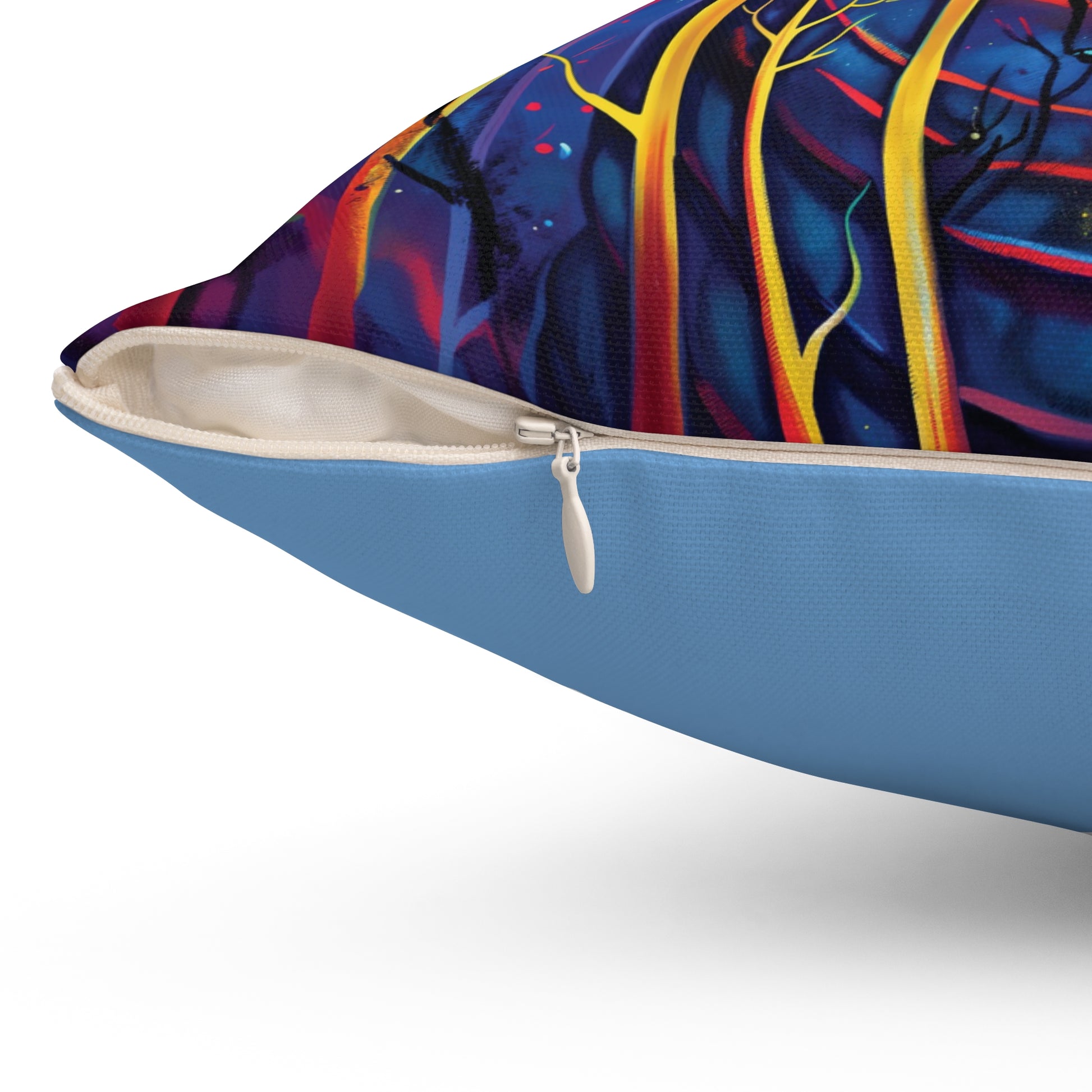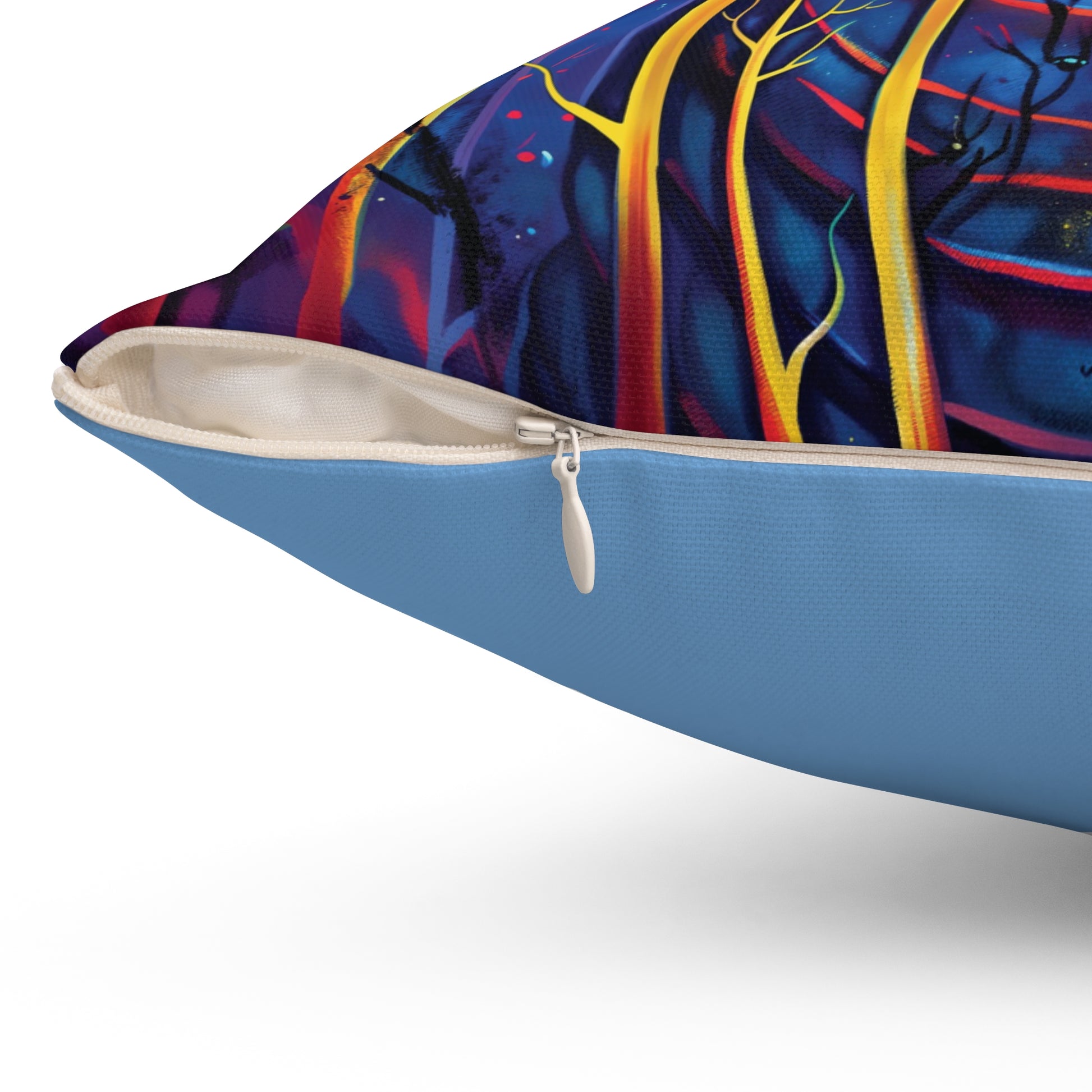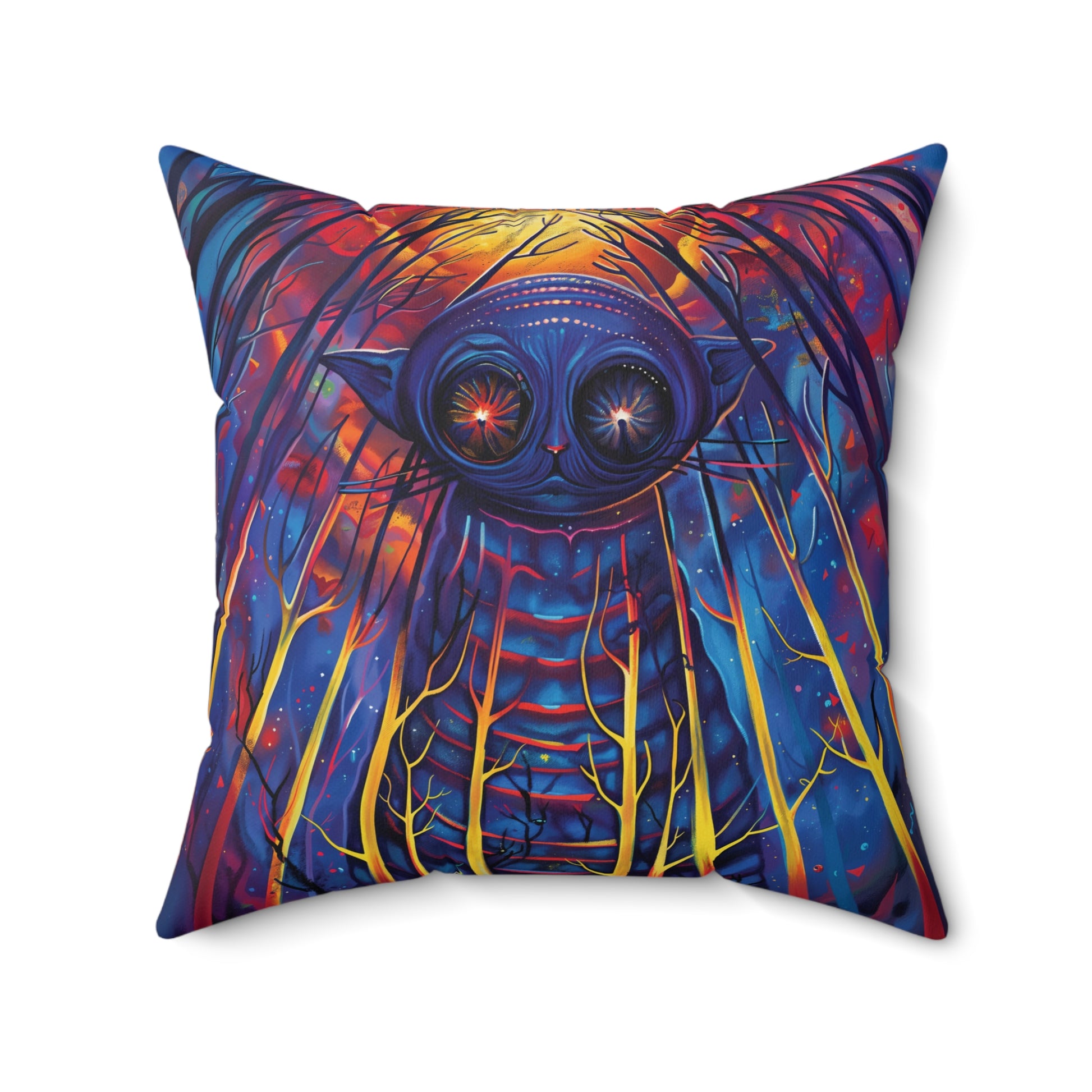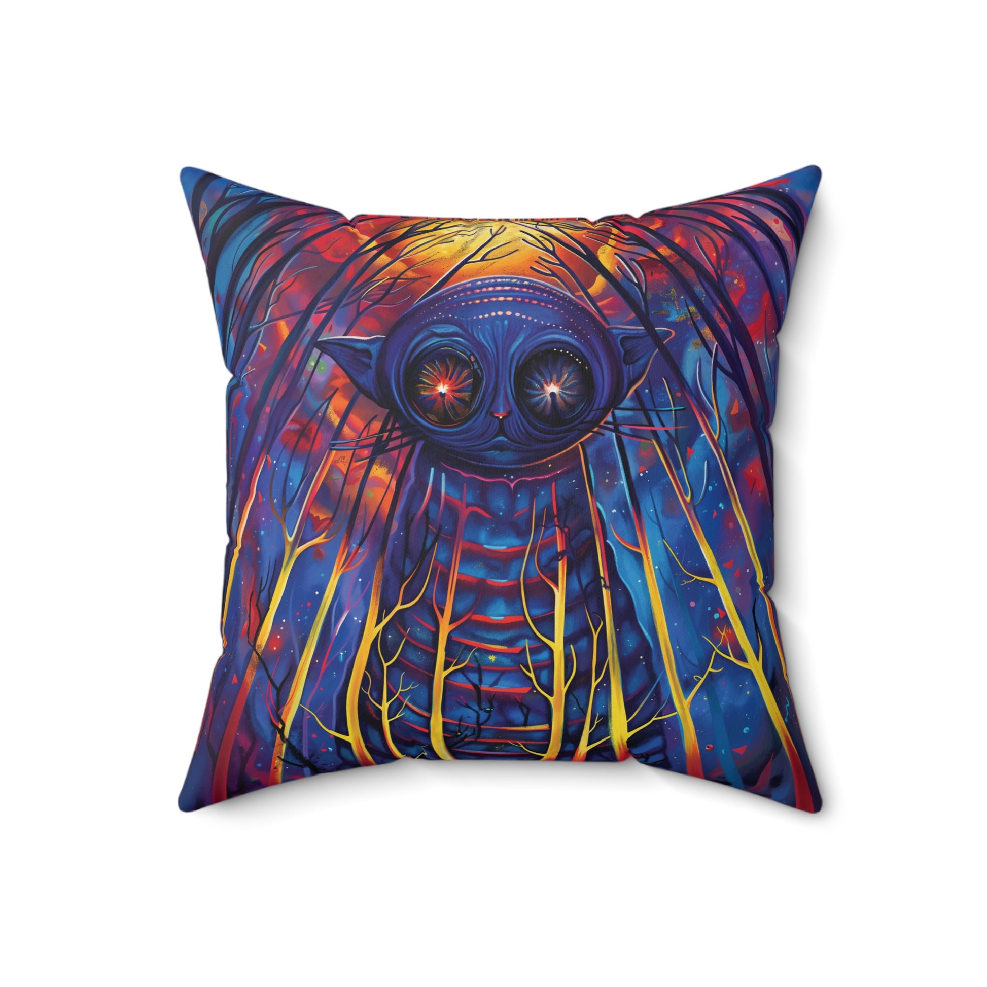 Bring a touch of mystery and vibrant artistry to your home with the Creepy Cat Pillow, featuring captivating artwork from the "Moon Kitty" collection by Rich Silver. This bold and imaginative design graces one side of the pillow, while a serene blue fabric adorns the other, making it a versatile statement piece for any room.