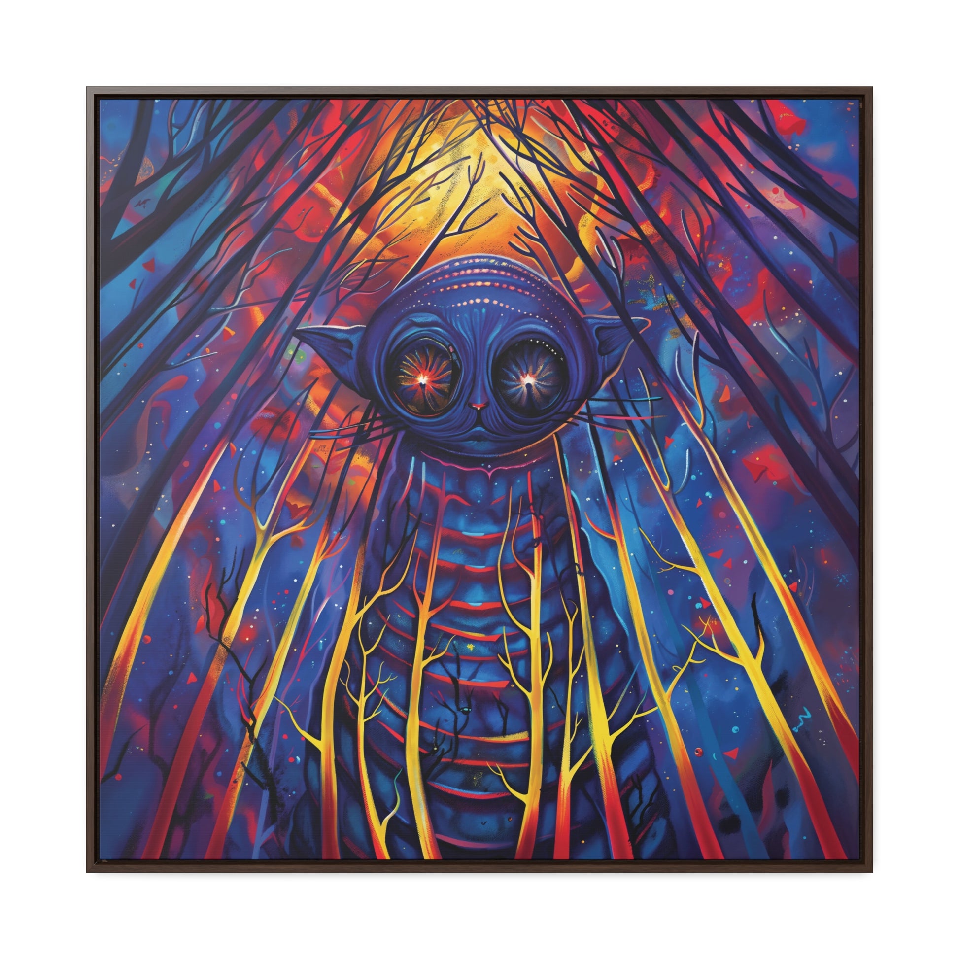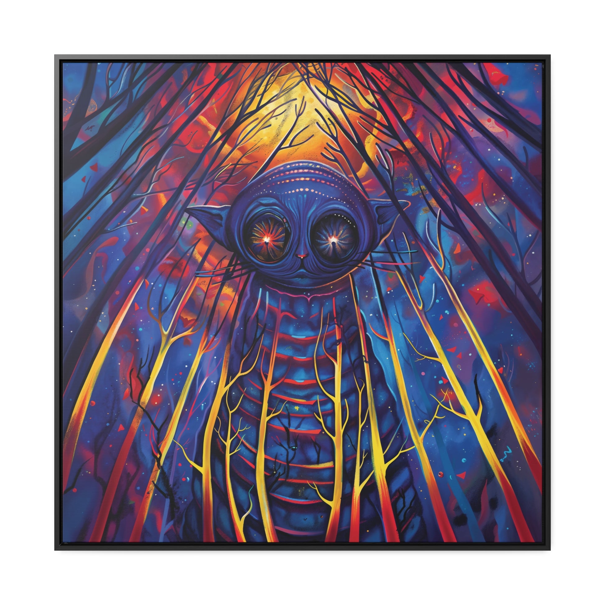 Immerse yourself in the whimsical world of "Creepy Cat," a surreal piece of modern art that blends fantasy and imagination. This artwork features a peculiar cat with large, hypnotic eyes, set against a vibrant forest backdrop illuminated by a mysterious light. The vivid colors and fantastical elements create a visually stunning and thought-provoking addition to any room.