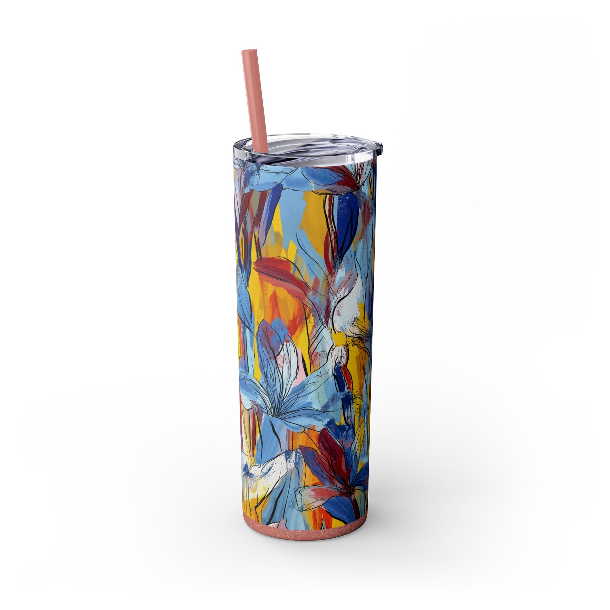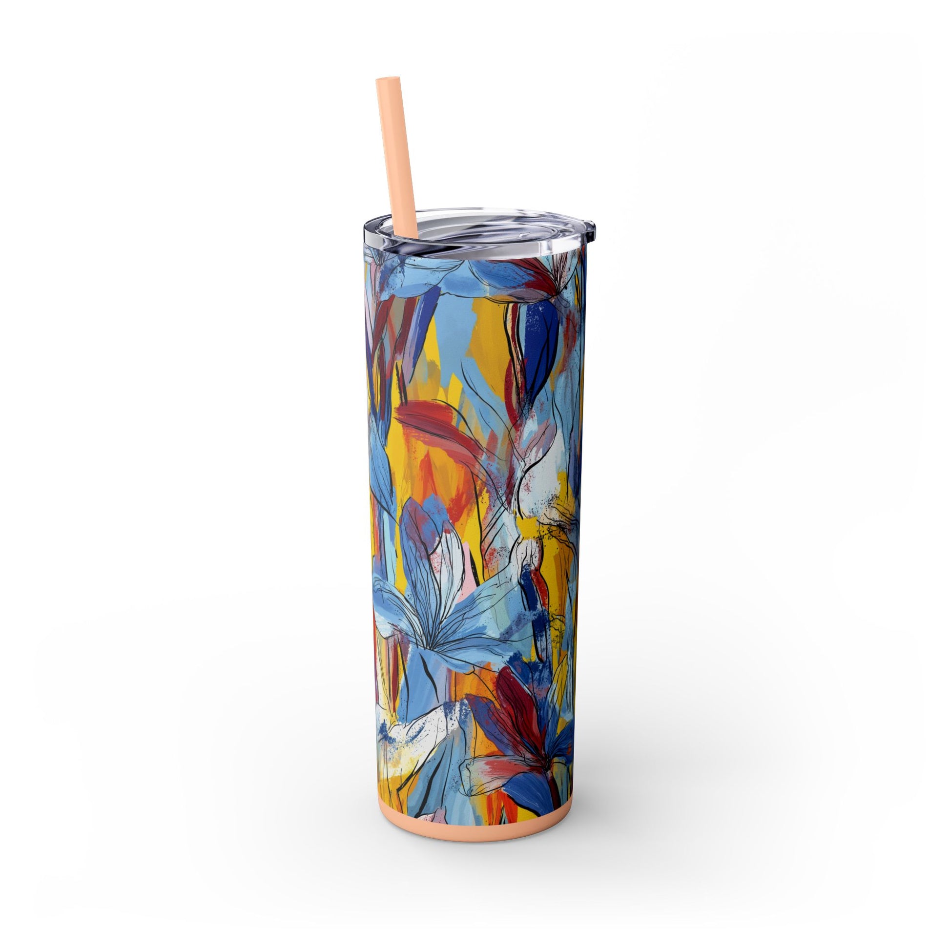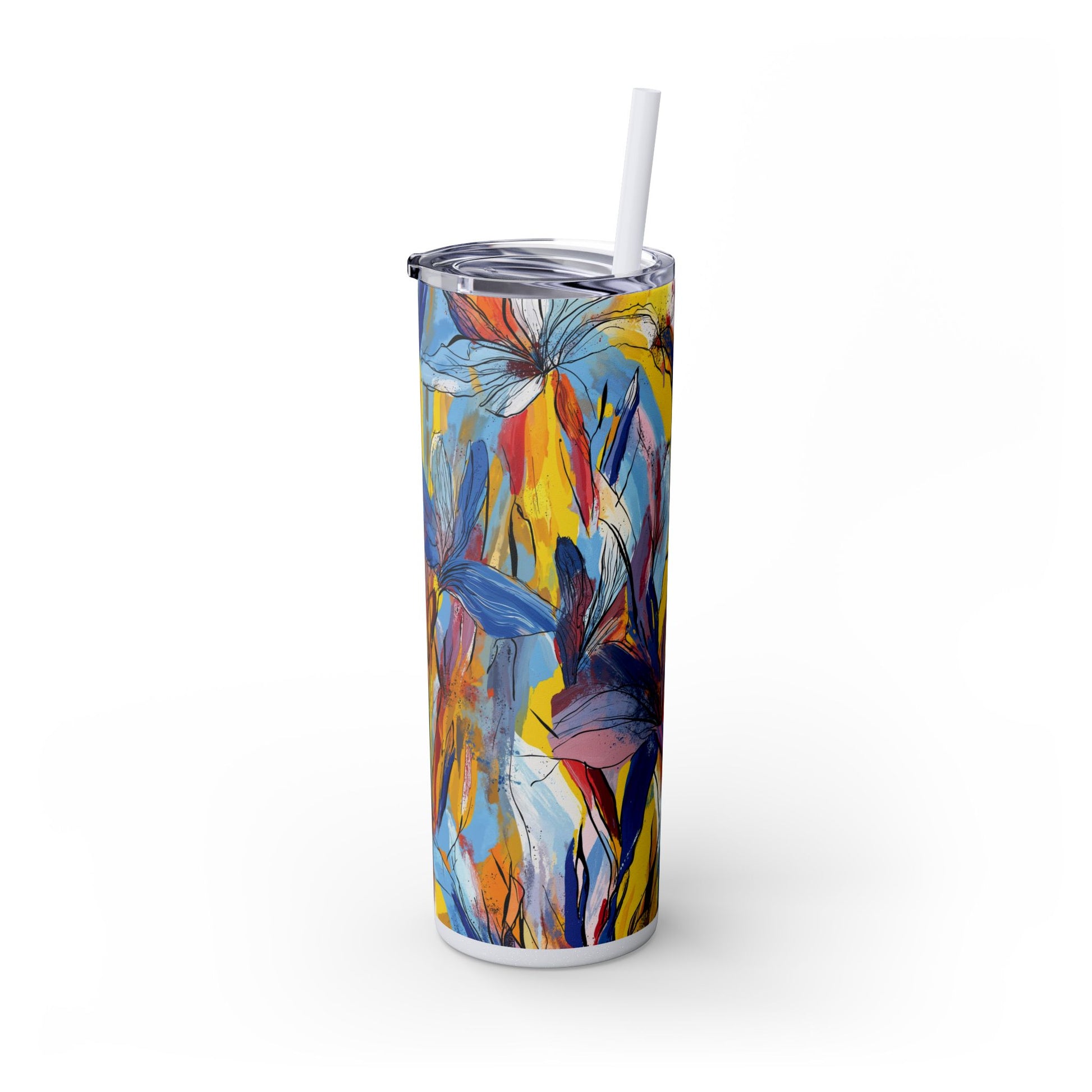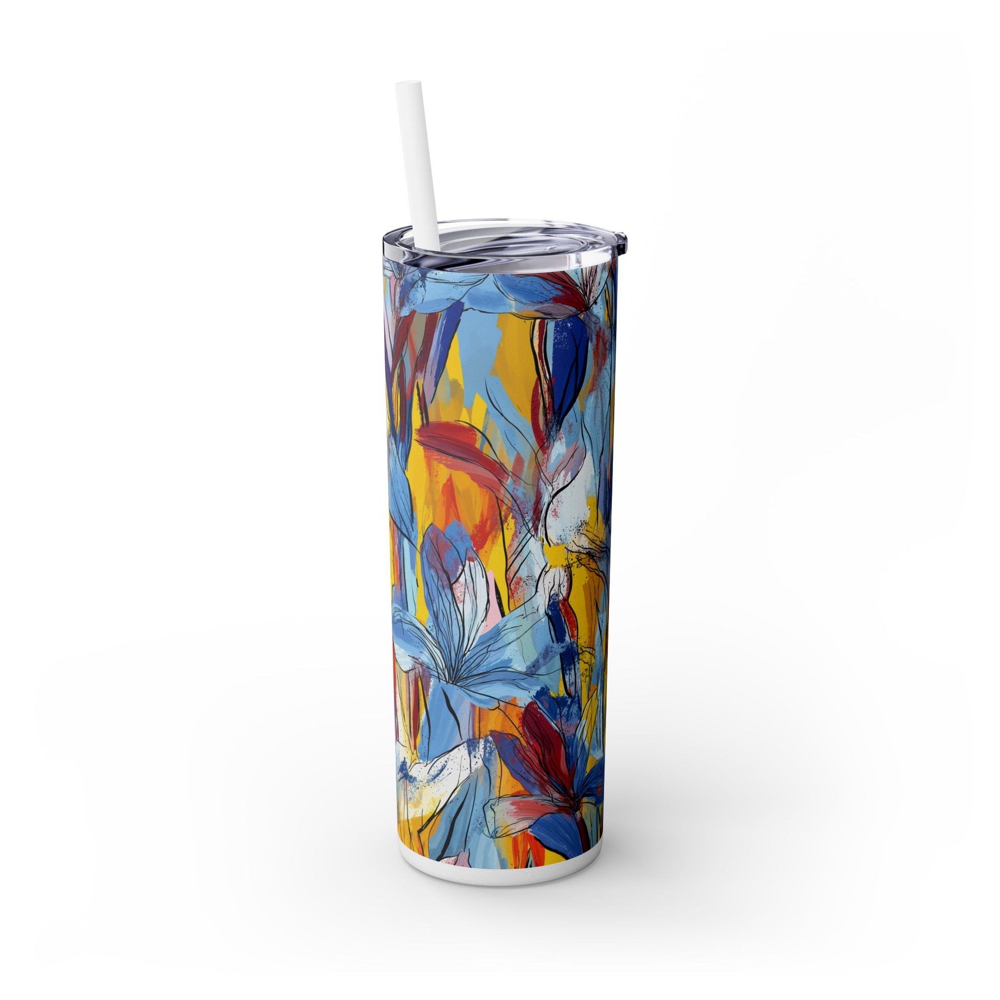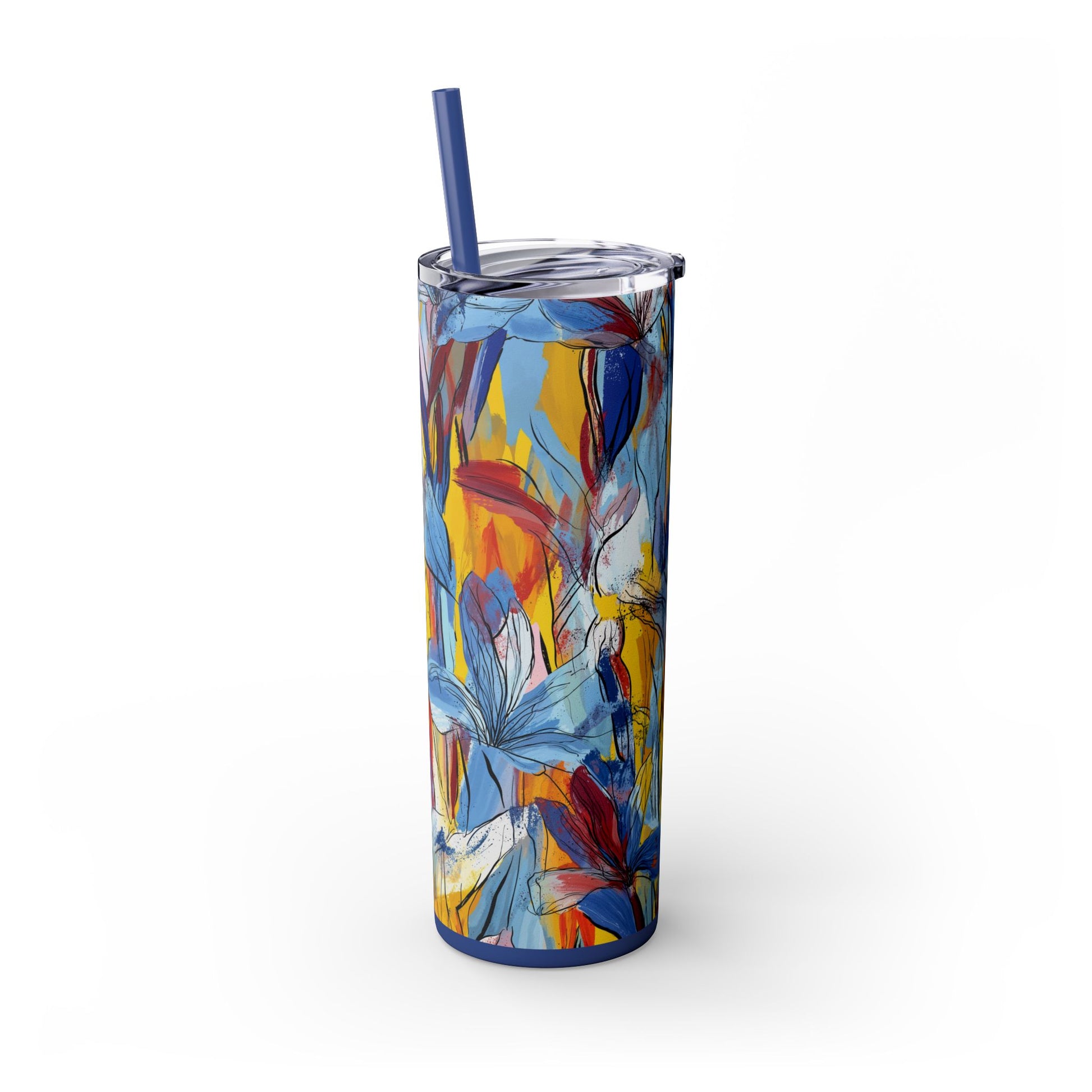 Sip in style with the "Wild Radiance" Floral Skinny Tumbler, featuring the dynamic floral abstract design from Rich Silver’s renowned Floral Fusion Collection. This versatile tumbler brings together artistic vibrancy and practical functionality, making it your perfect companion for busy days or moments of relaxation. The bold design showcases a striking interplay of cerulean blues, fiery reds, golden yellows, and soft pinks, adding a sophisticated artistic flair to your favorite beverages.