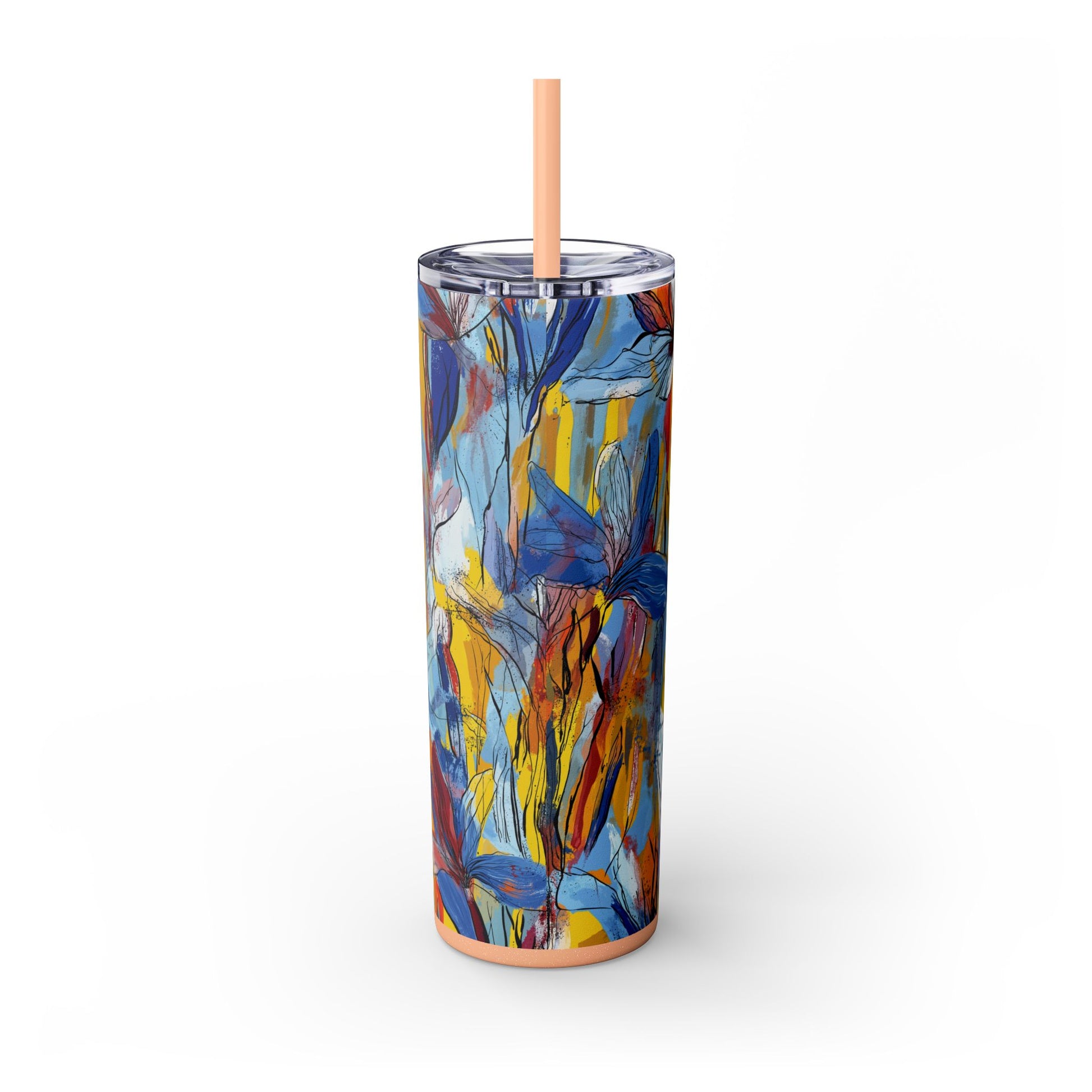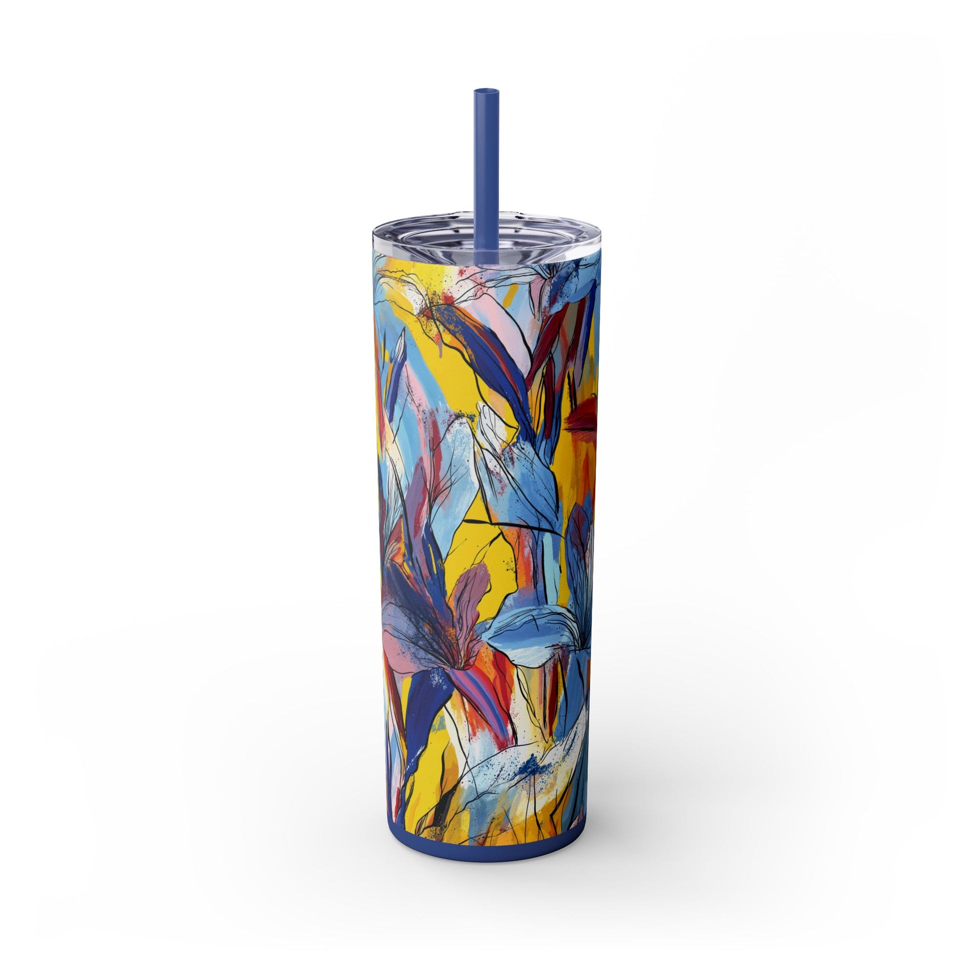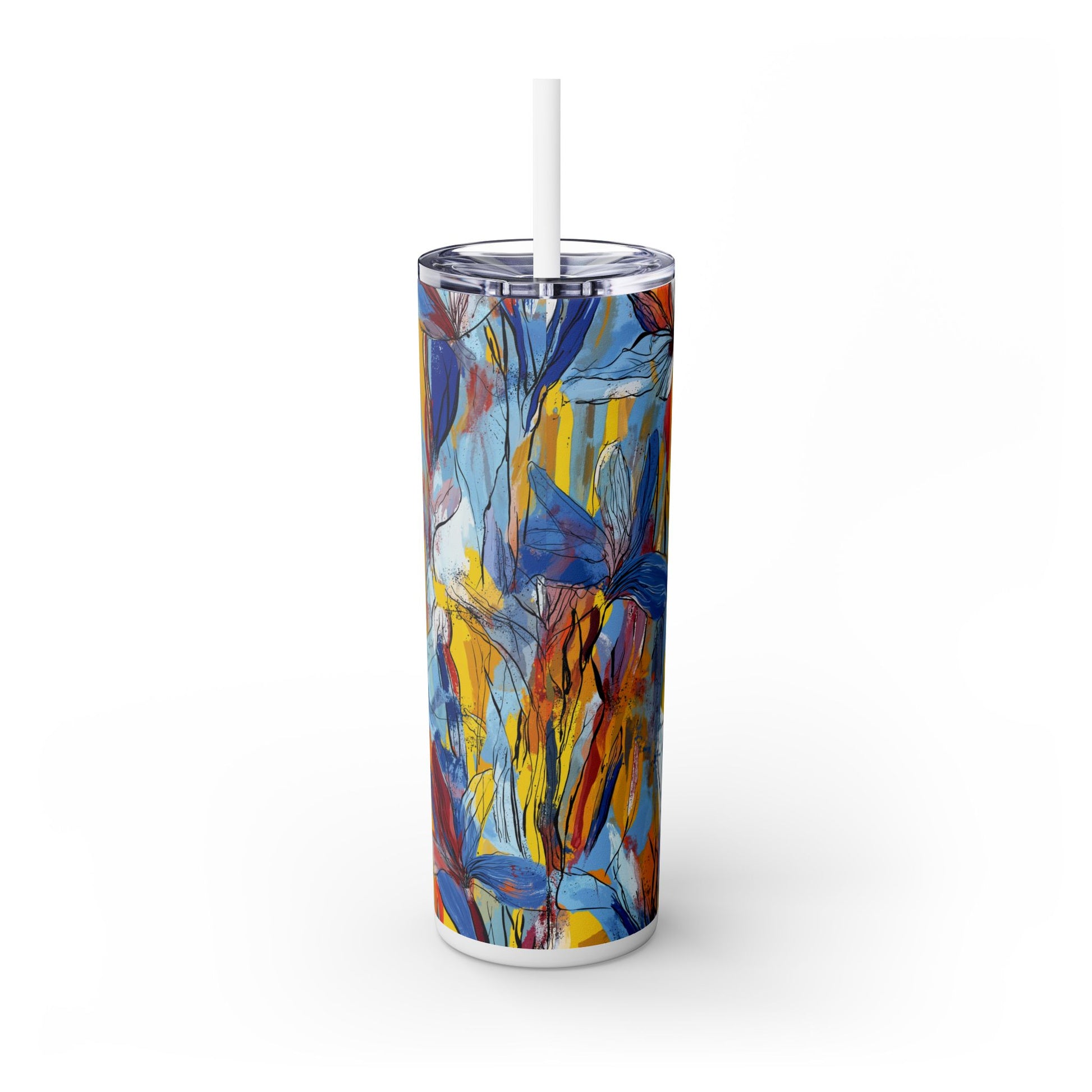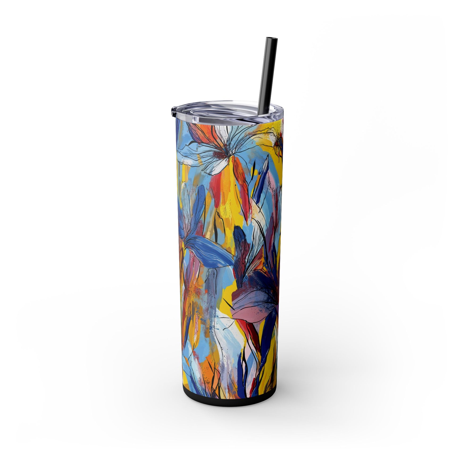 Sip in style with the "Wild Radiance" Floral Skinny Tumbler, featuring the dynamic floral abstract design from Rich Silver’s renowned Floral Fusion Collection. This versatile tumbler brings together artistic vibrancy and practical functionality, making it your perfect companion for busy days or moments of relaxation. The bold design showcases a striking interplay of cerulean blues, fiery reds, golden yellows, and soft pinks, adding a sophisticated artistic flair to your favorite beverages.