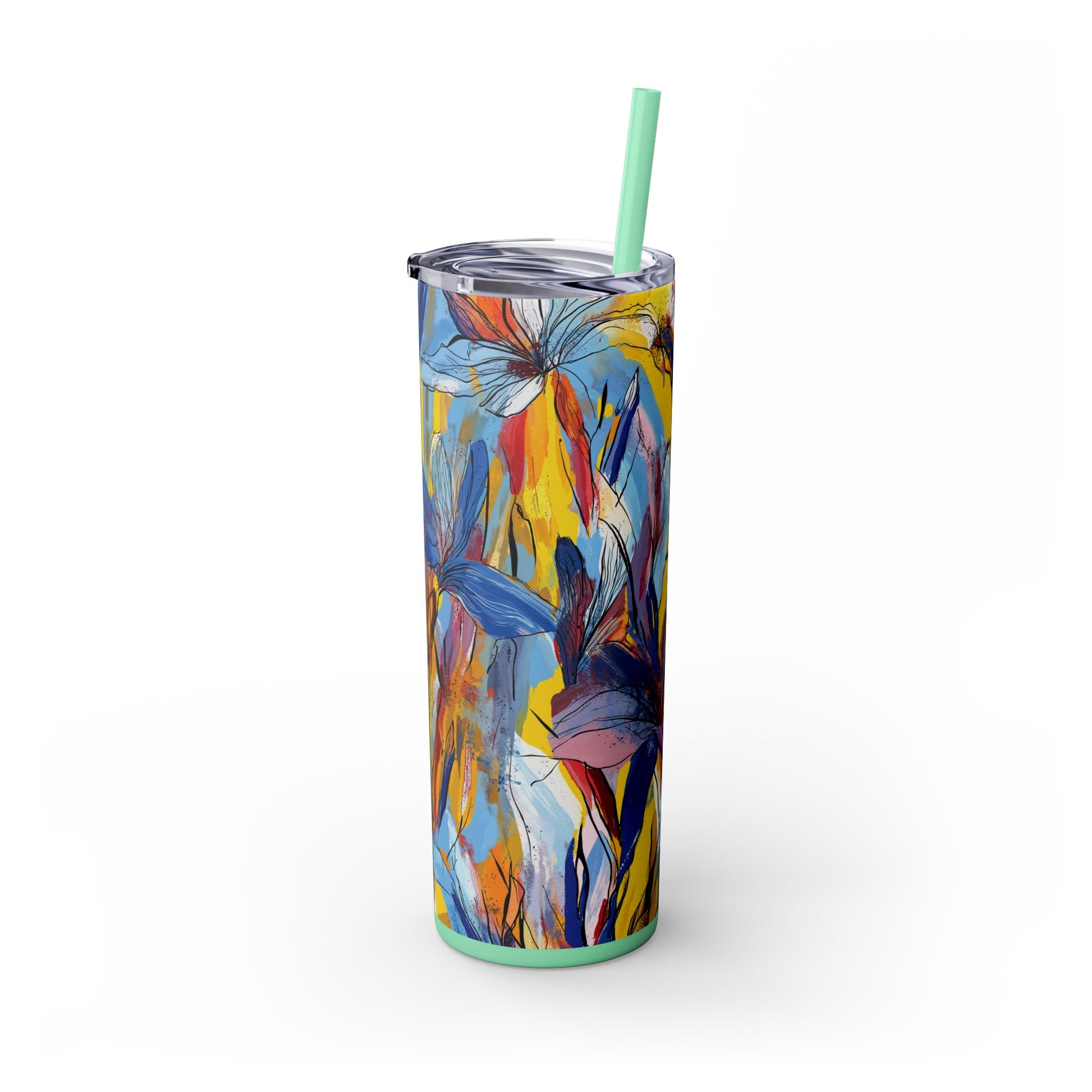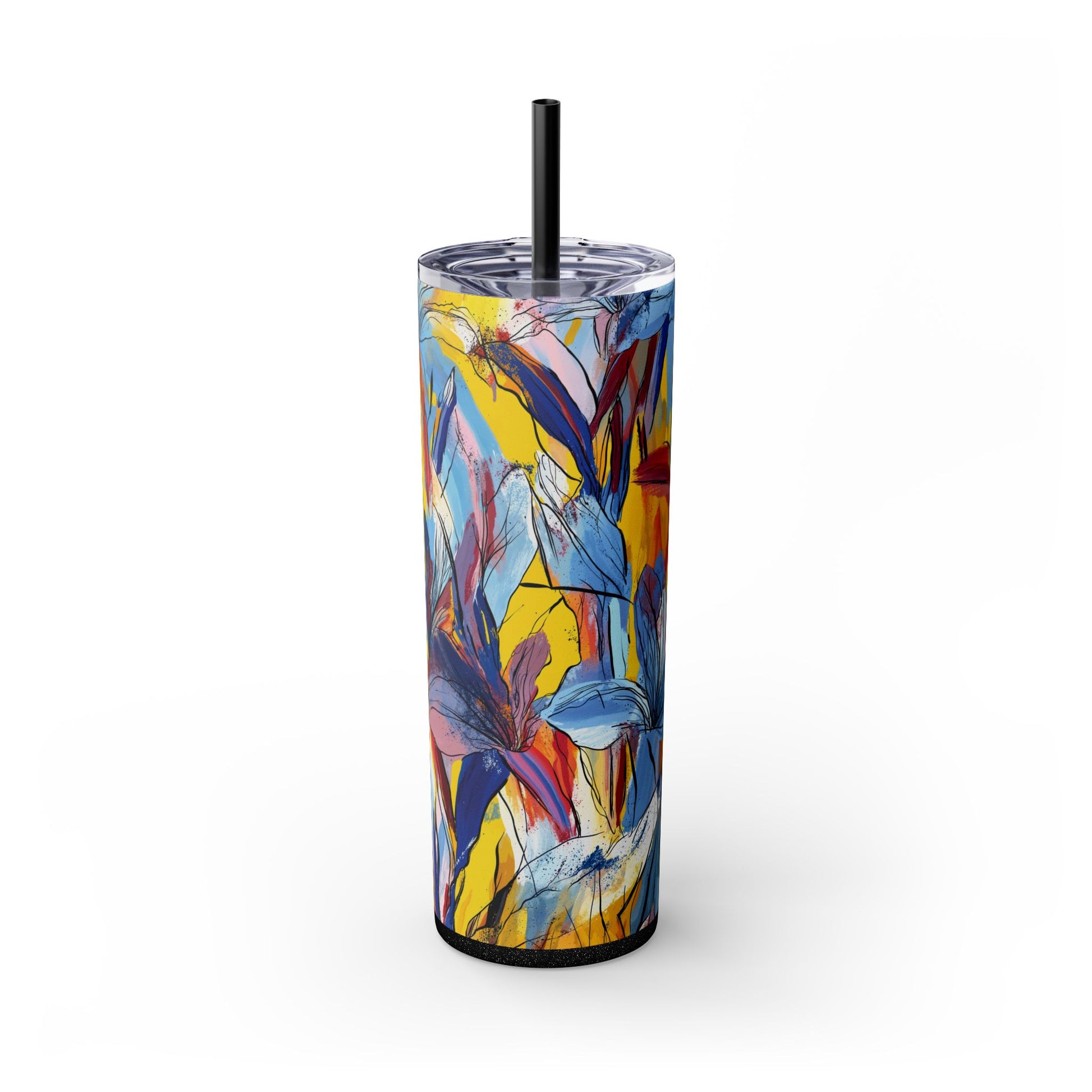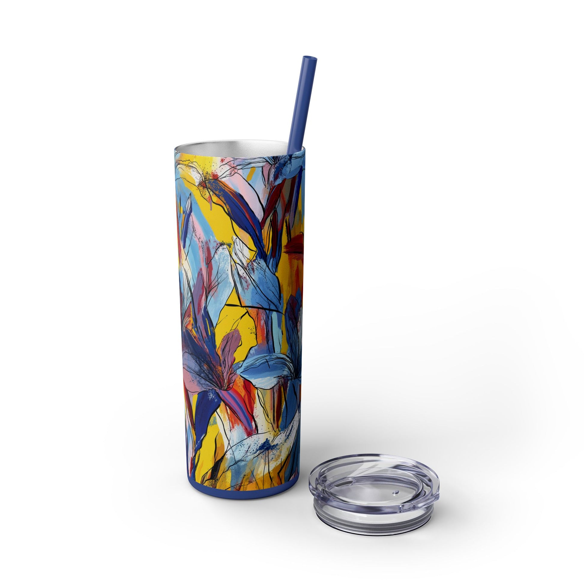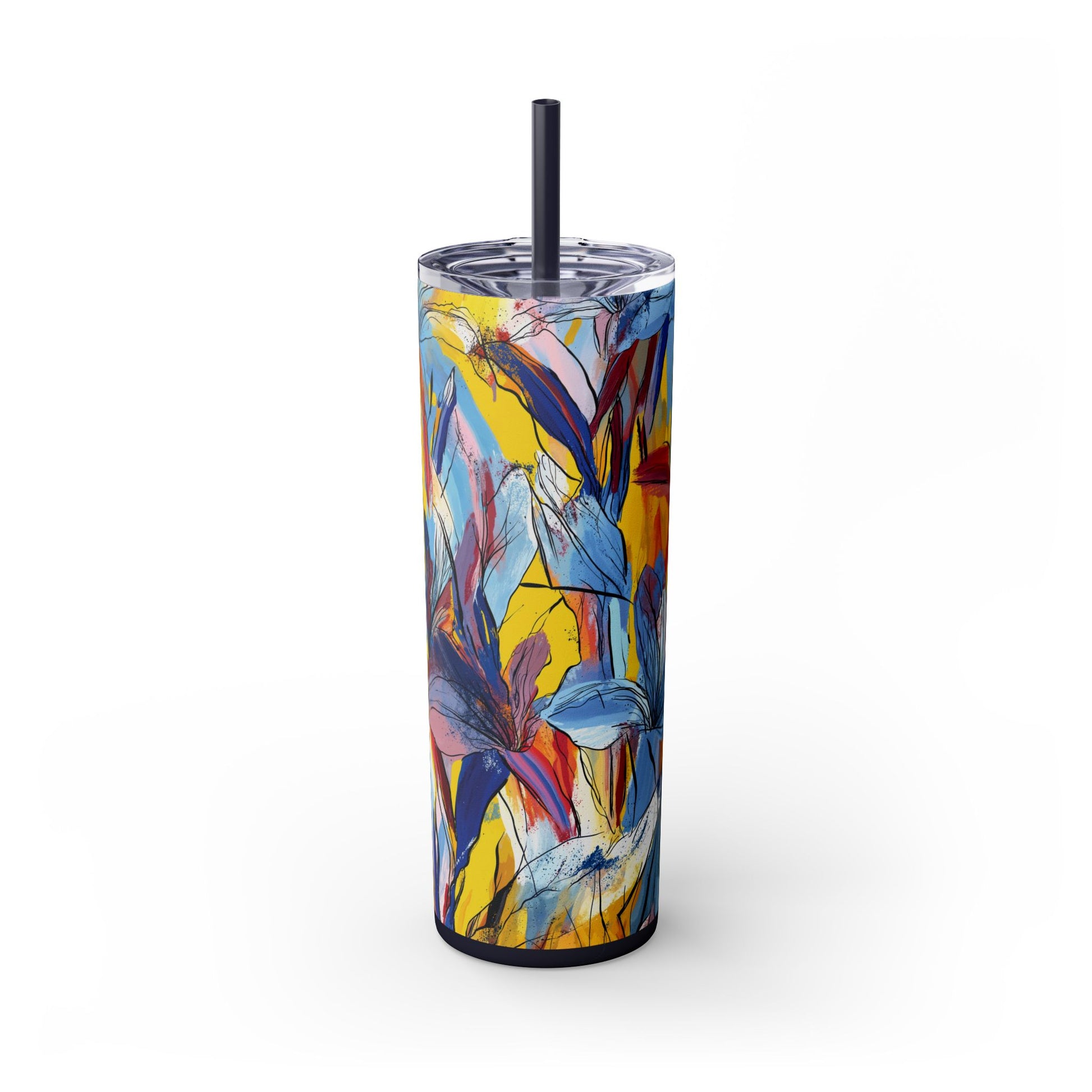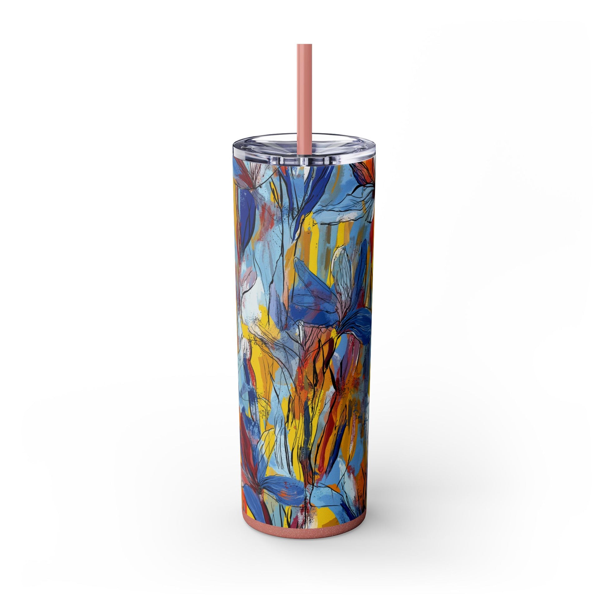 Sip in style with the "Wild Radiance" Floral Skinny Tumbler, featuring the dynamic floral abstract design from Rich Silver’s renowned Floral Fusion Collection. This versatile tumbler brings together artistic vibrancy and practical functionality, making it your perfect companion for busy days or moments of relaxation. The bold design showcases a striking interplay of cerulean blues, fiery reds, golden yellows, and soft pinks, adding a sophisticated artistic flair to your favorite beverages.