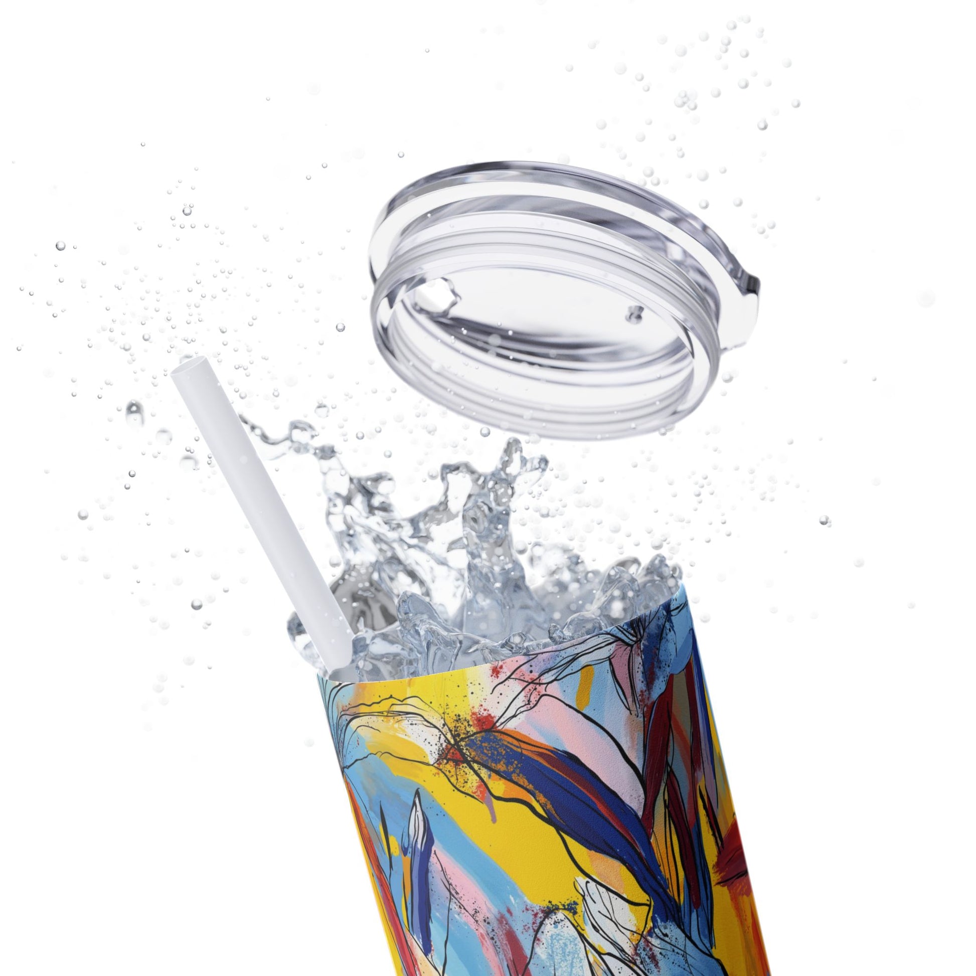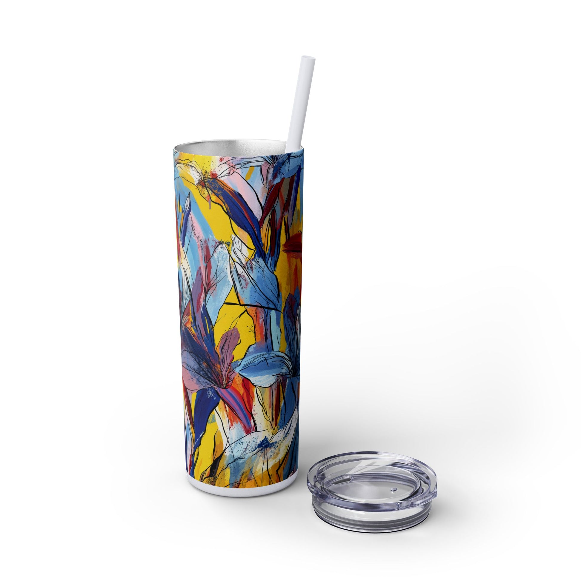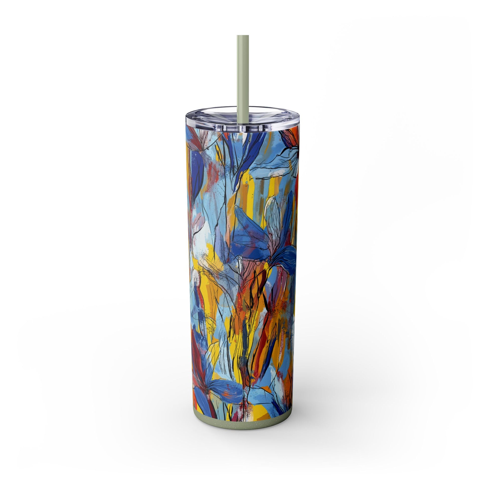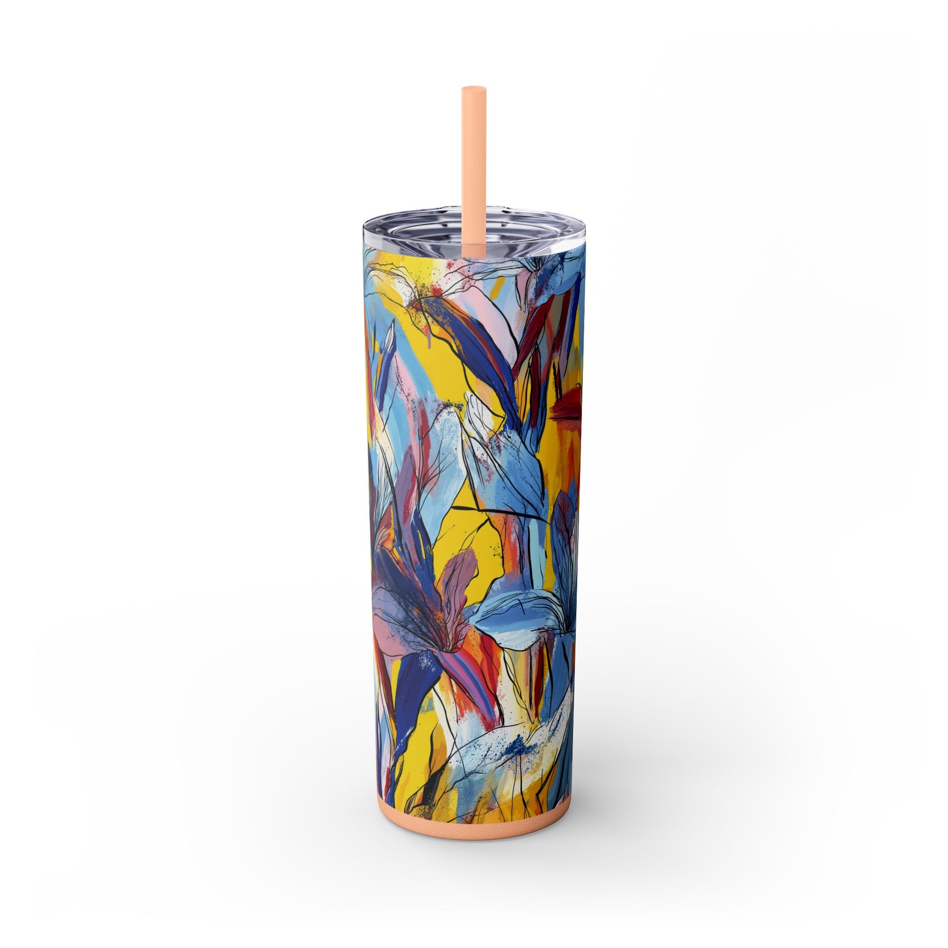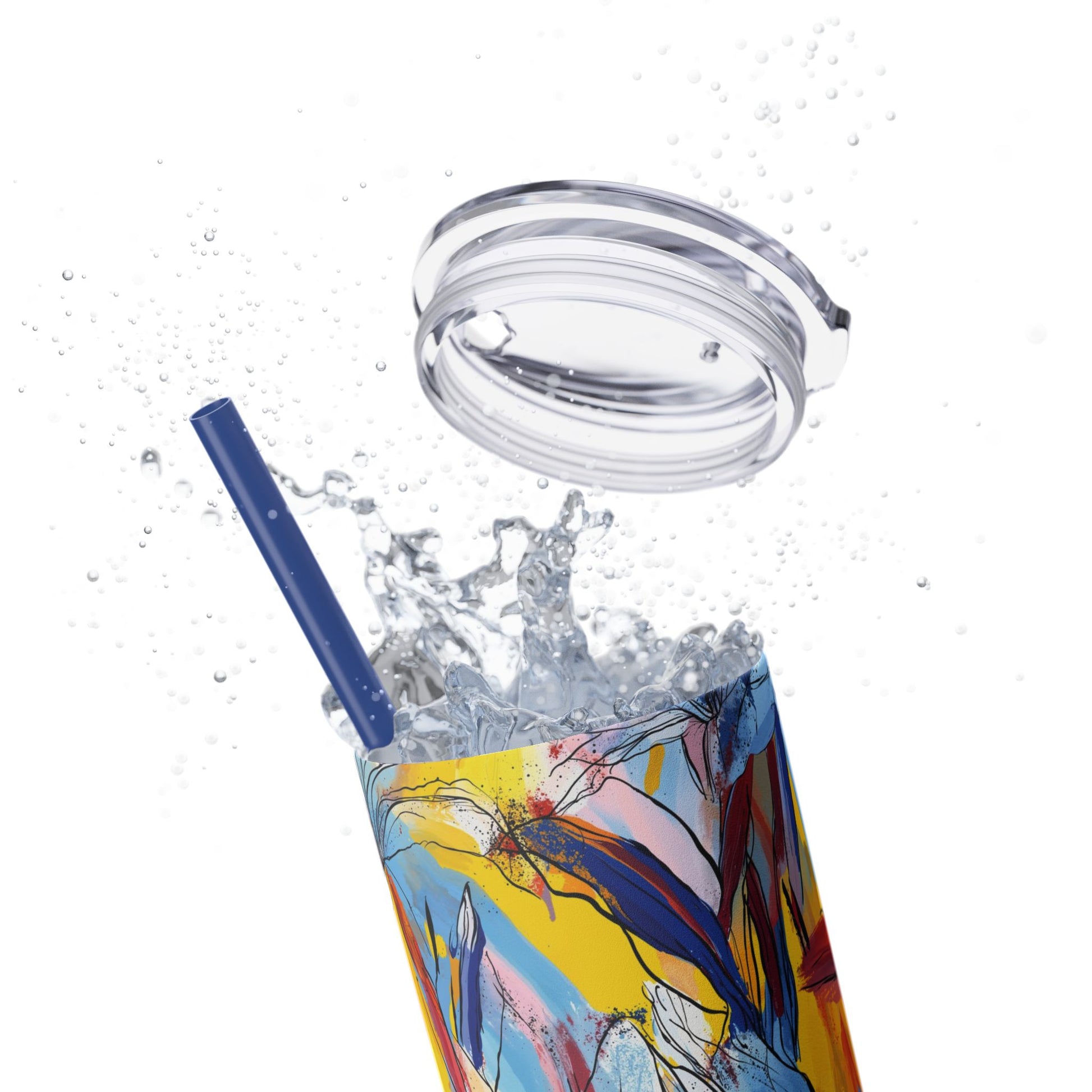 Sip in style with the "Wild Radiance" Floral Skinny Tumbler, featuring the dynamic floral abstract design from Rich Silver’s renowned Floral Fusion Collection. This versatile tumbler brings together artistic vibrancy and practical functionality, making it your perfect companion for busy days or moments of relaxation. The bold design showcases a striking interplay of cerulean blues, fiery reds, golden yellows, and soft pinks, adding a sophisticated artistic flair to your favorite beverages.