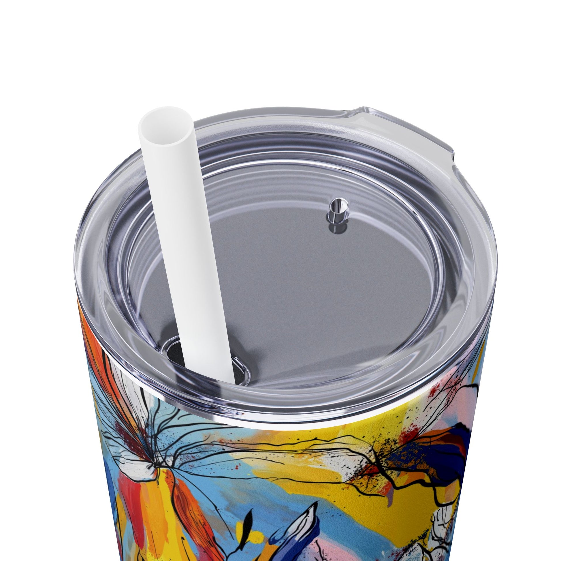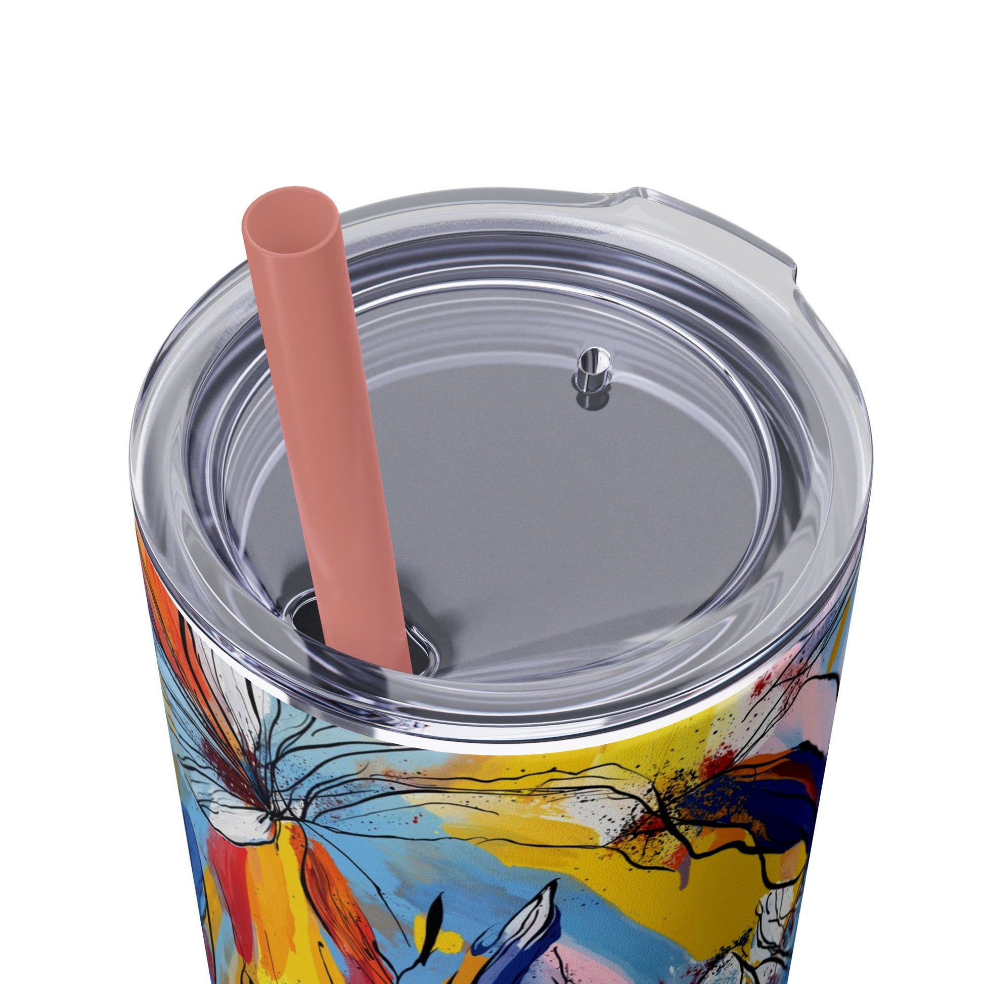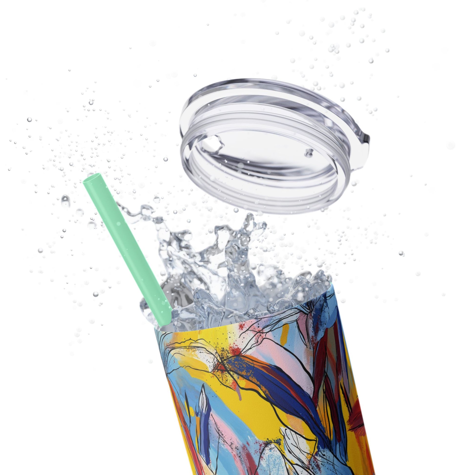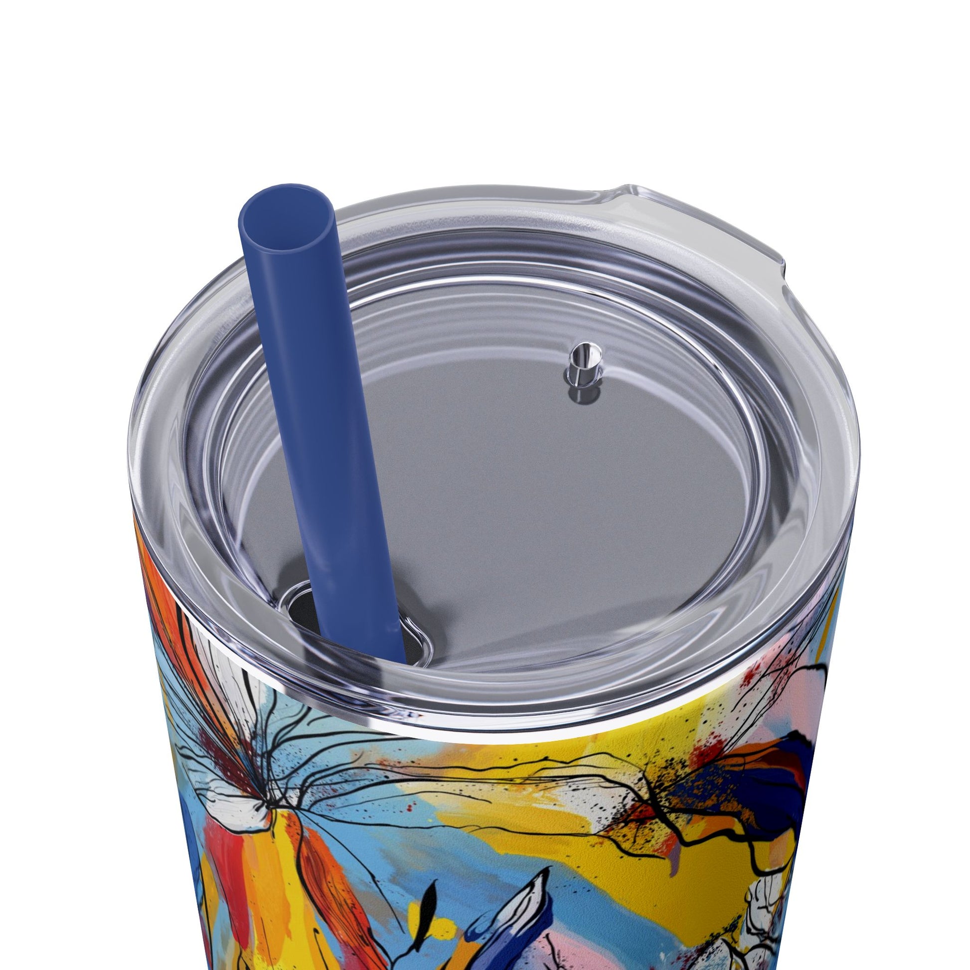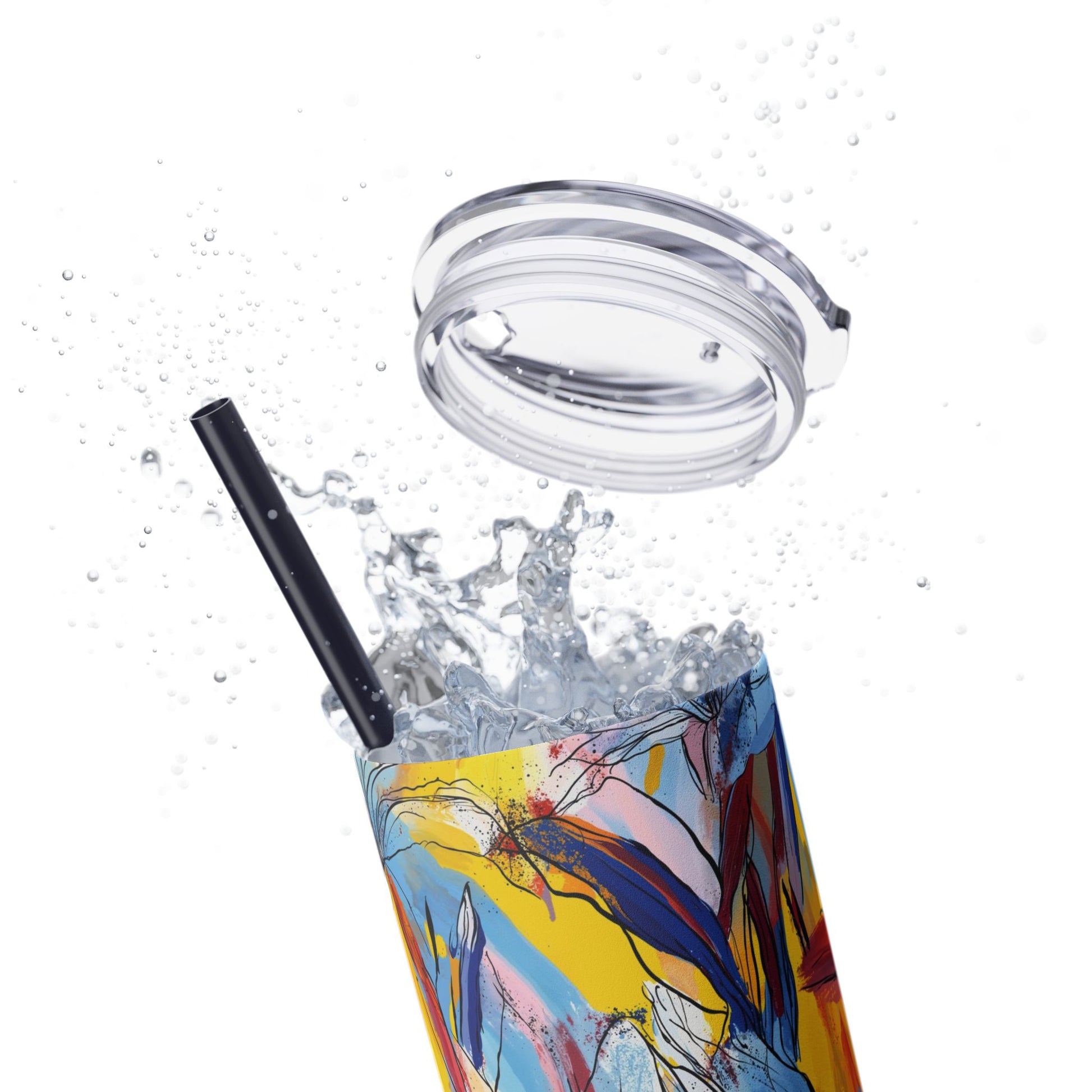 Sip in style with the "Wild Radiance" Floral Skinny Tumbler, featuring the dynamic floral abstract design from Rich Silver’s renowned Floral Fusion Collection. This versatile tumbler brings together artistic vibrancy and practical functionality, making it your perfect companion for busy days or moments of relaxation. The bold design showcases a striking interplay of cerulean blues, fiery reds, golden yellows, and soft pinks, adding a sophisticated artistic flair to your favorite beverages.