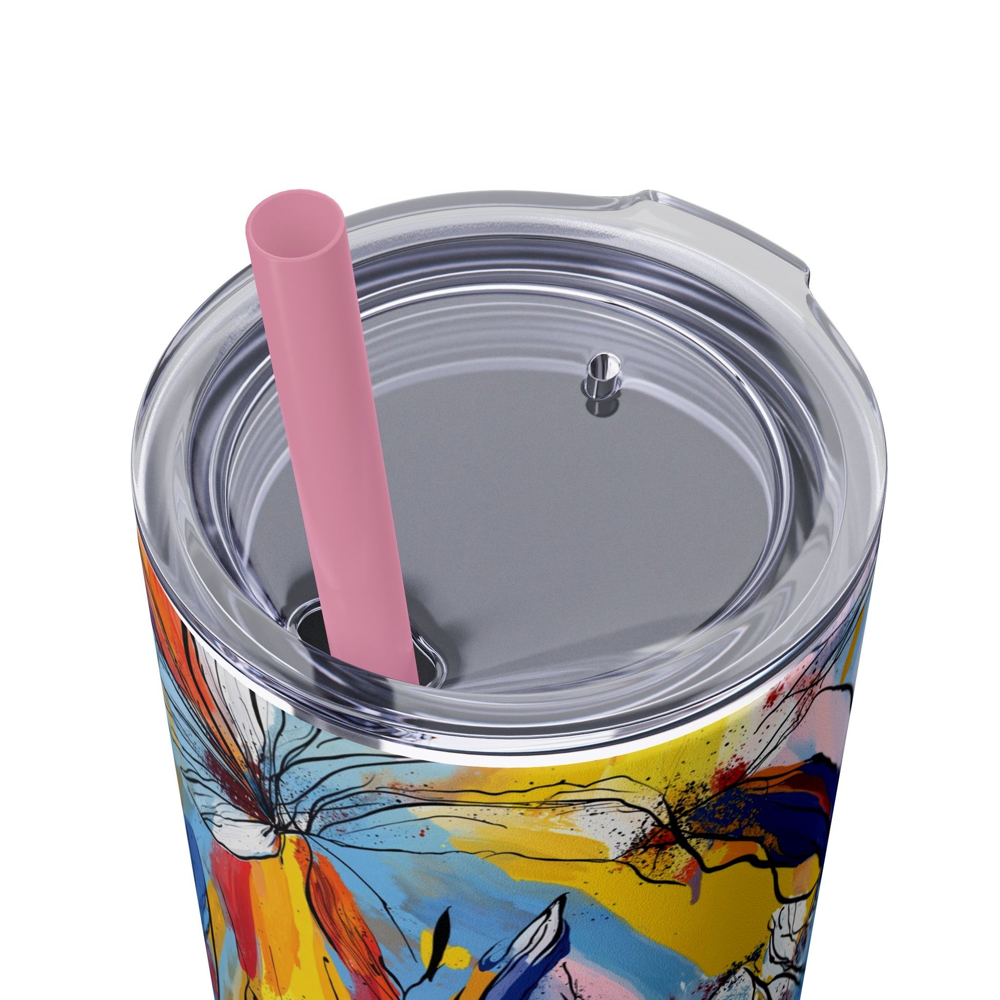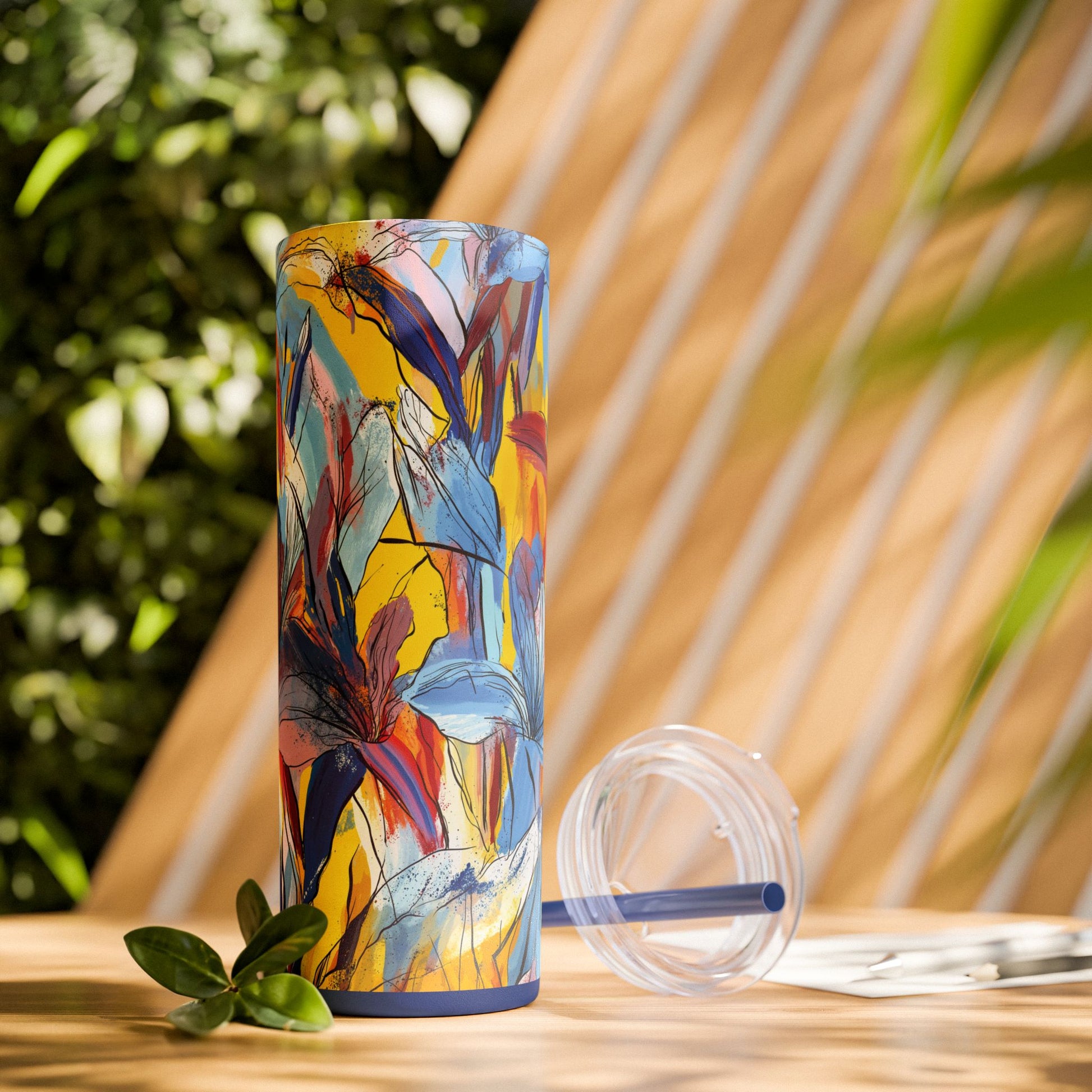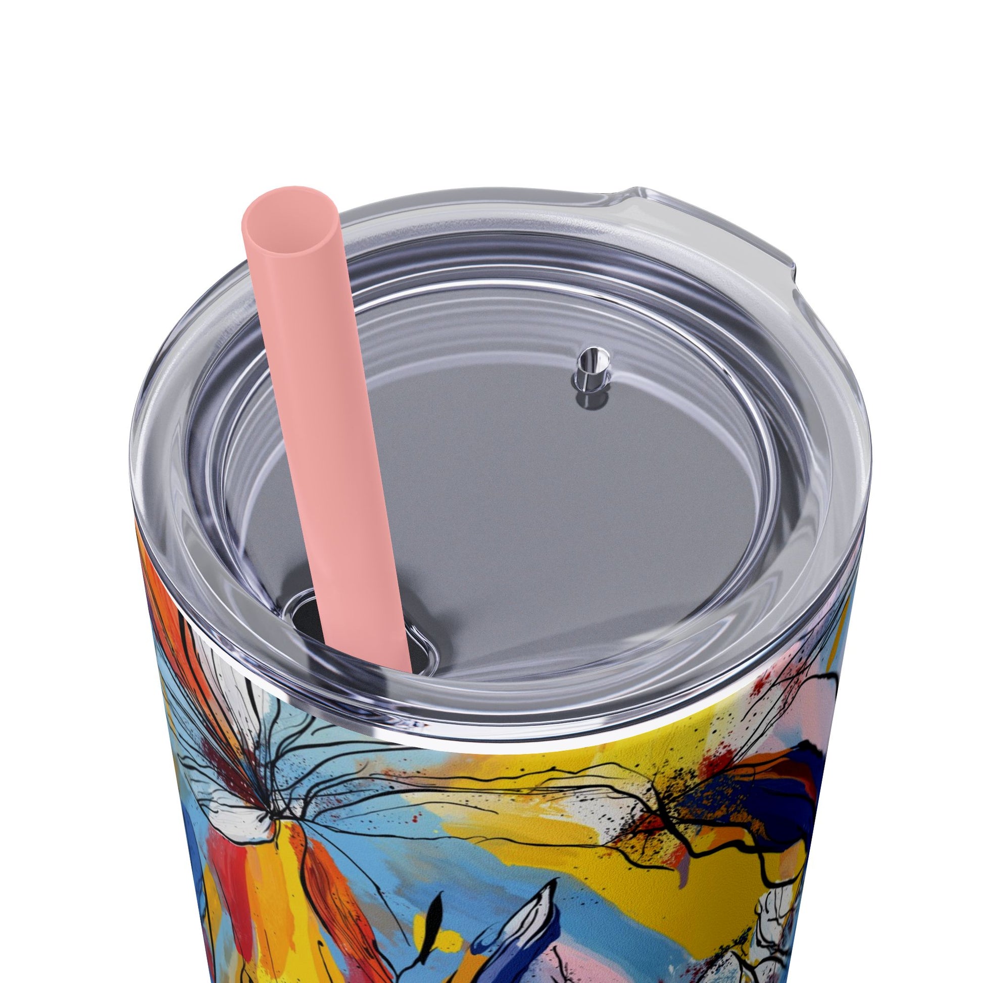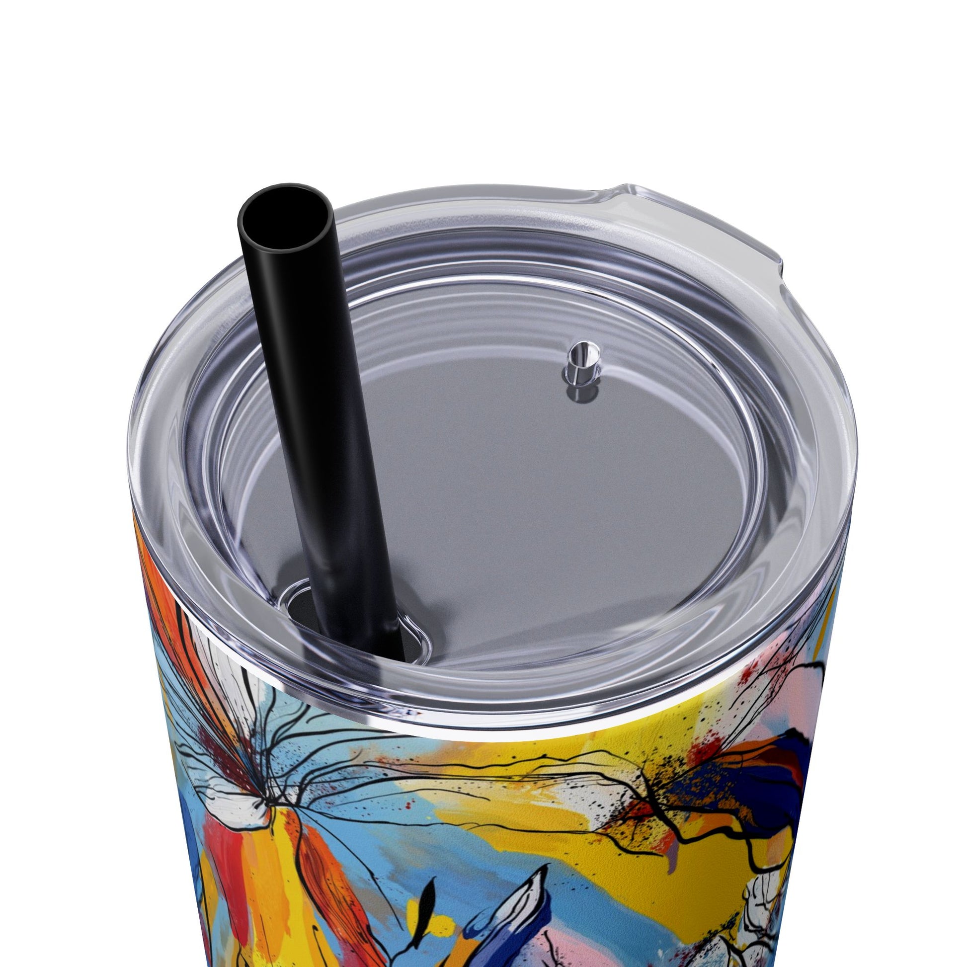 Sip in style with the "Wild Radiance" Floral Skinny Tumbler, featuring the dynamic floral abstract design from Rich Silver’s renowned Floral Fusion Collection. This versatile tumbler brings together artistic vibrancy and practical functionality, making it your perfect companion for busy days or moments of relaxation. The bold design showcases a striking interplay of cerulean blues, fiery reds, golden yellows, and soft pinks, adding a sophisticated artistic flair to your favorite beverages.