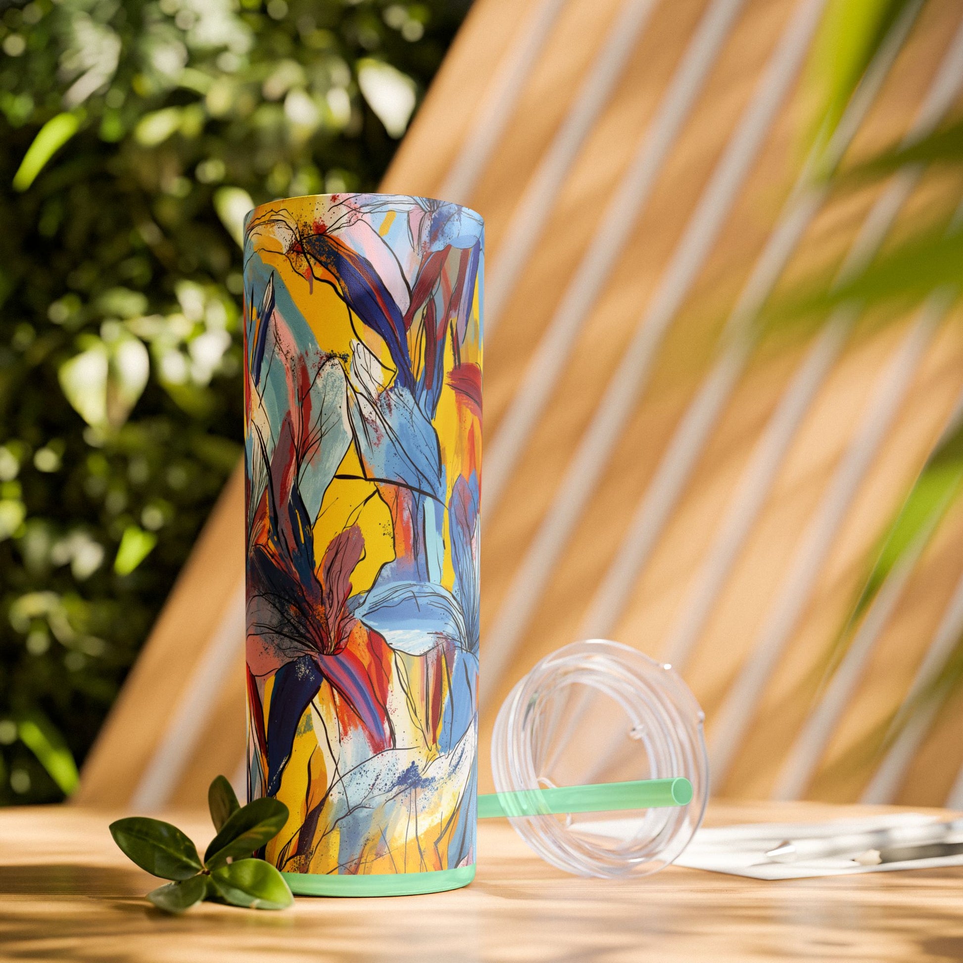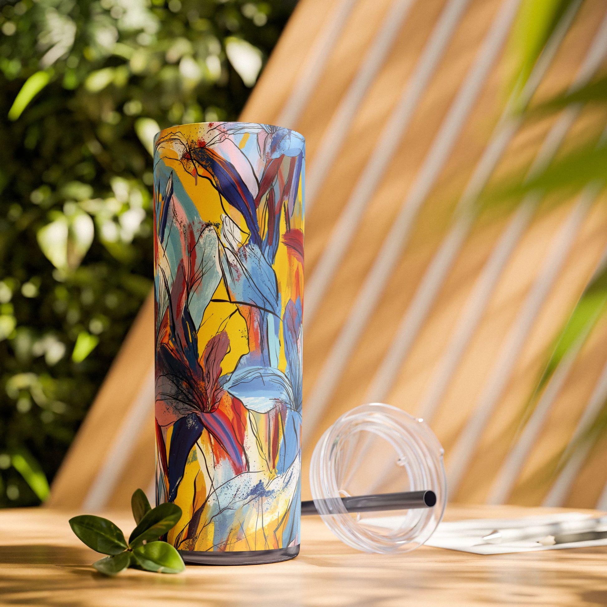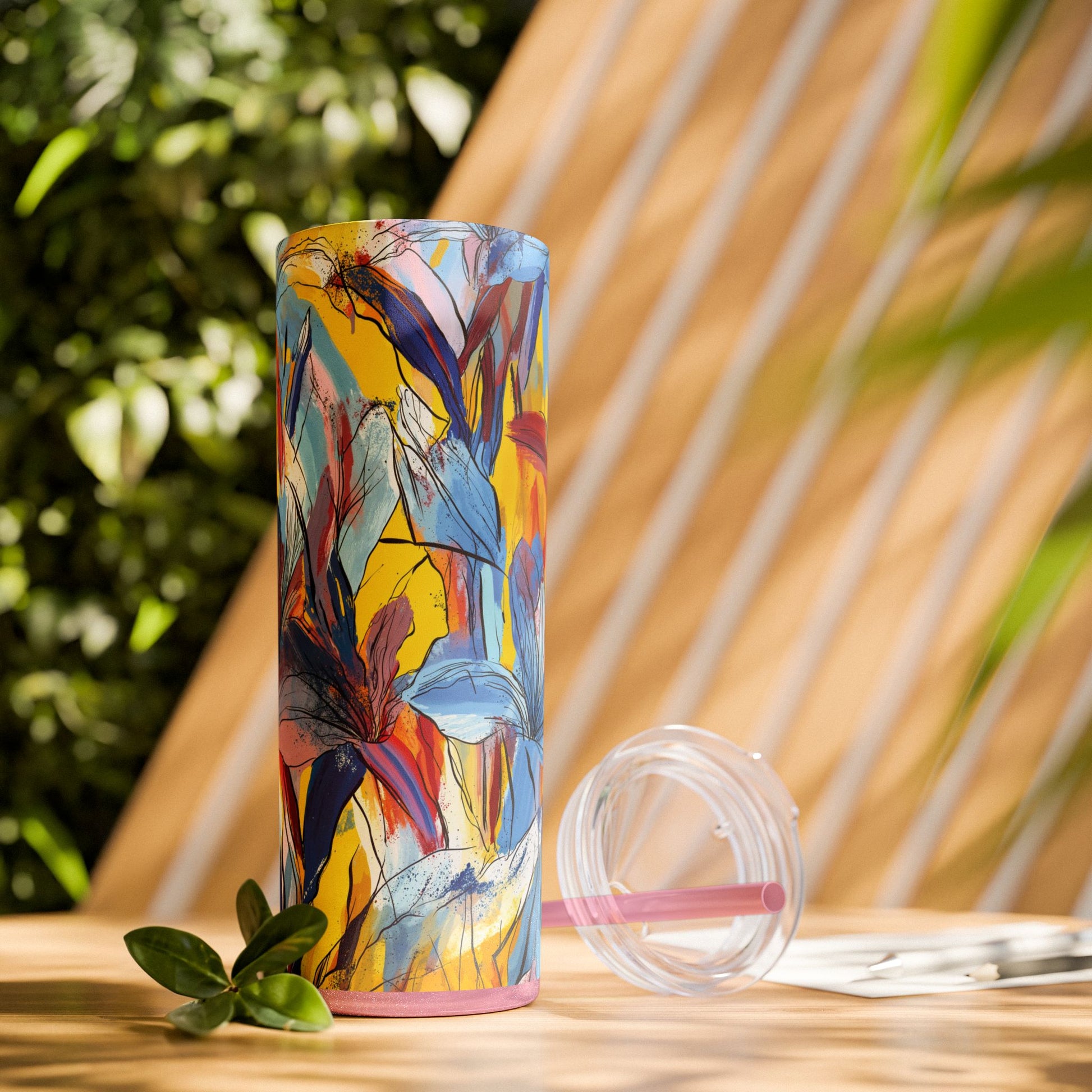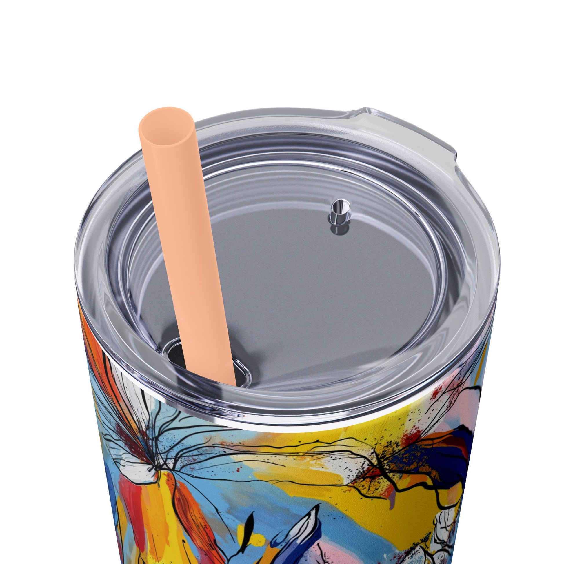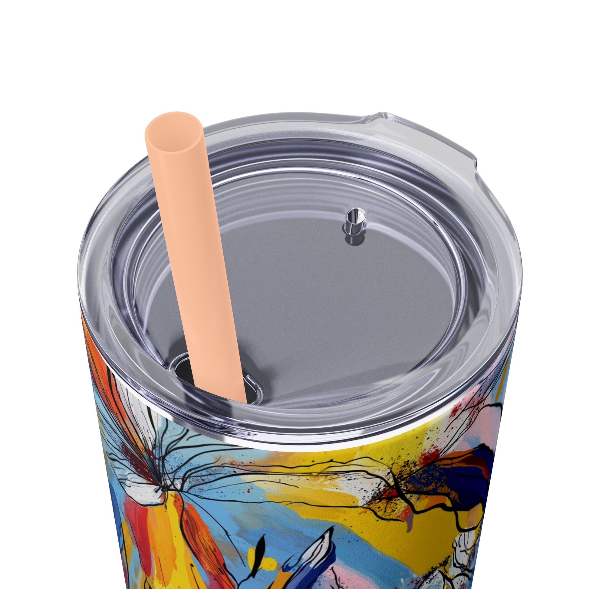 Sip in style with the "Wild Radiance" Floral Skinny Tumbler, featuring the dynamic floral abstract design from Rich Silver’s renowned Floral Fusion Collection. This versatile tumbler brings together artistic vibrancy and practical functionality, making it your perfect companion for busy days or moments of relaxation. The bold design showcases a striking interplay of cerulean blues, fiery reds, golden yellows, and soft pinks, adding a sophisticated artistic flair to your favorite beverages.