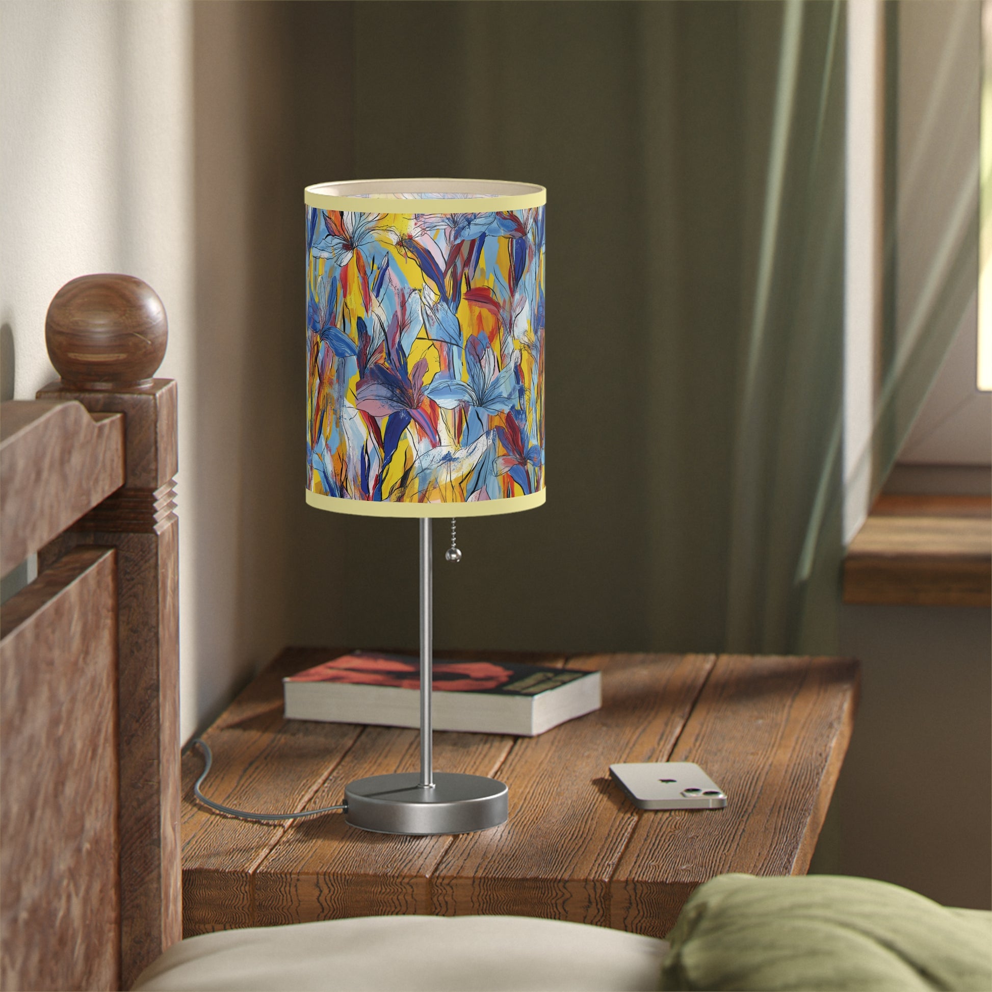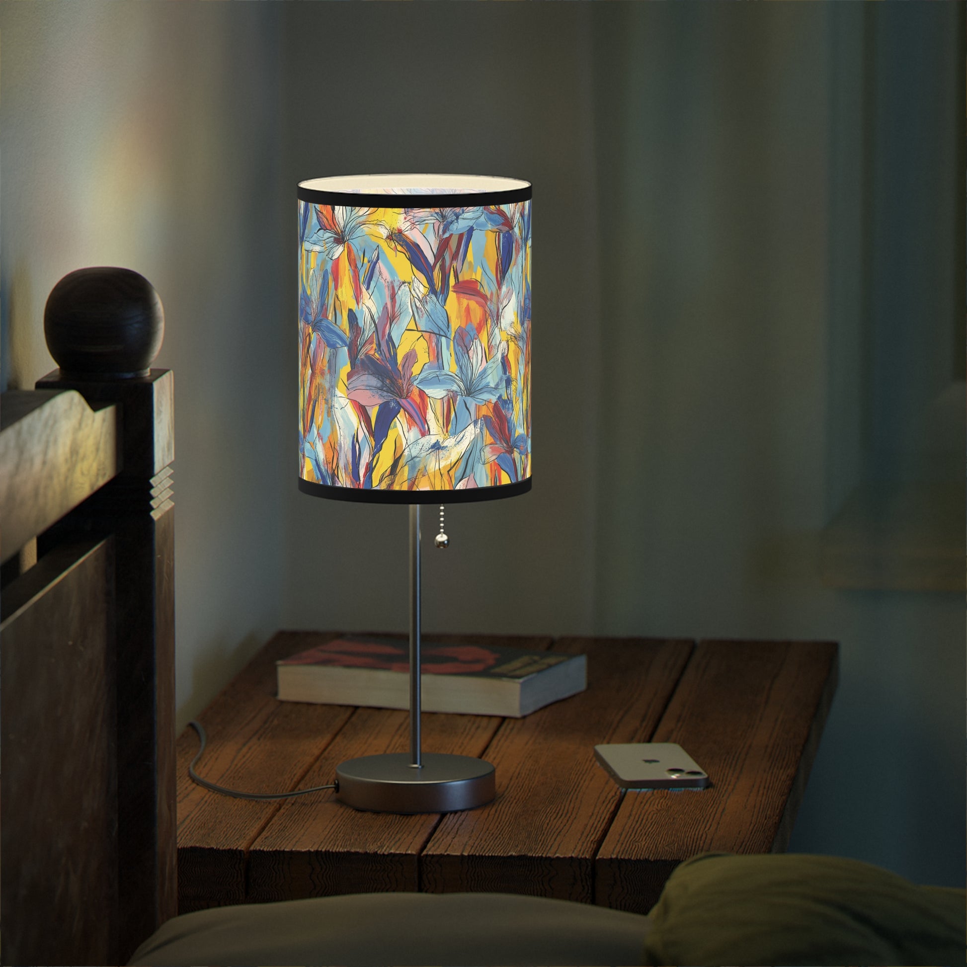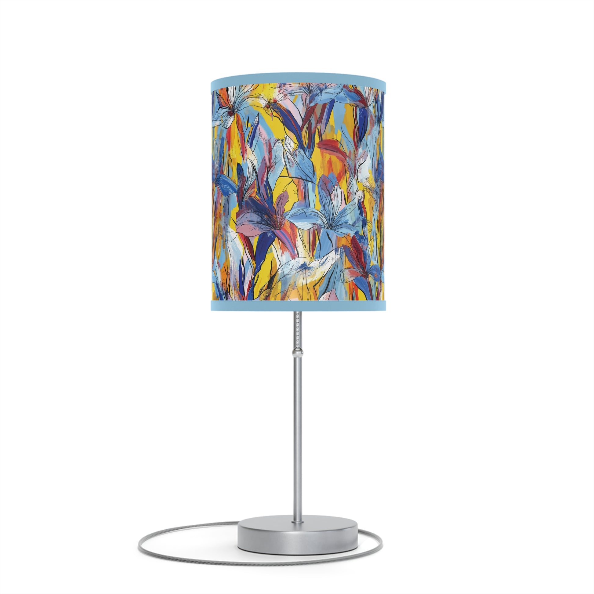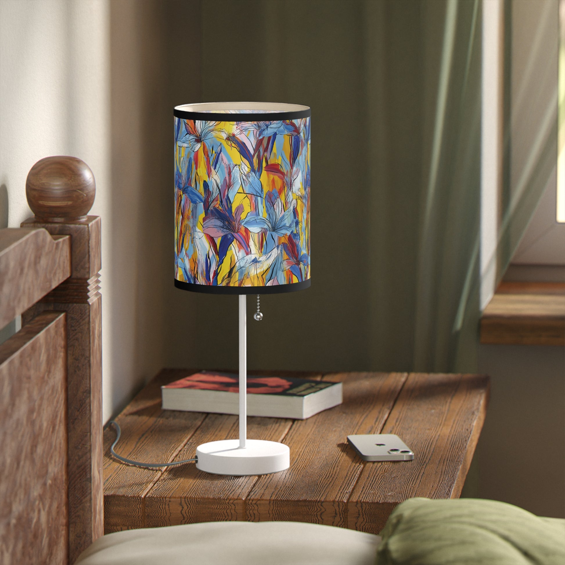 Transform your room with the vibrant artistry of "Wild Radiance," a stunning table lamp featuring the captivating floral abstract design from Rich Silver’s Floral Fusion Collection. The dynamic interplay of cerulean blue, fiery red, golden yellow, and soft pinks on the high-resolution printed shade adds a burst of energy and warmth to your space, creating a cozy and inviting ambiance.